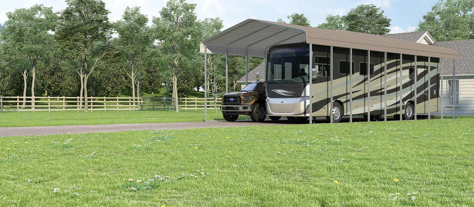 Protect your RV, camper or motorhome with a steel RV cover. Rugged construction and simple assembly keep your RV covered!