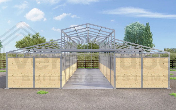 Highlander Series DIY horse barn kit offers the ultimate in safety, comfort and protection for your precious investment – your horses – in a traditional center-aisle-with-wings design with roomy interior space ready for your finishing choices.