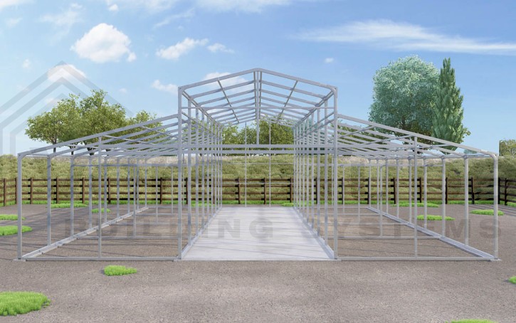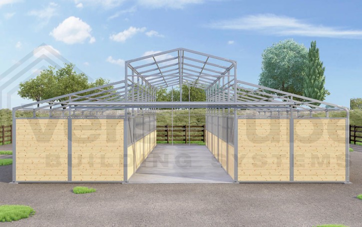 Highlander Series DIY horse barn frame kit offers the ultimate in safety, comfort and protection for your precious investment – your horses – in a traditional center-aisle-with-wings design ready for your exterior and interior finishing choices.