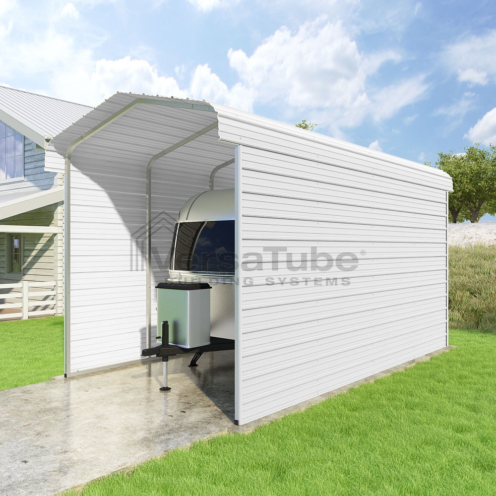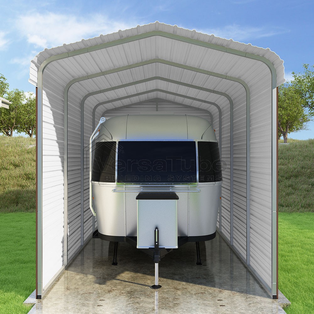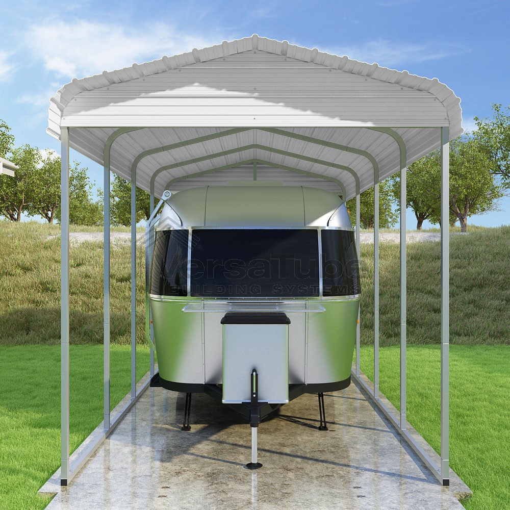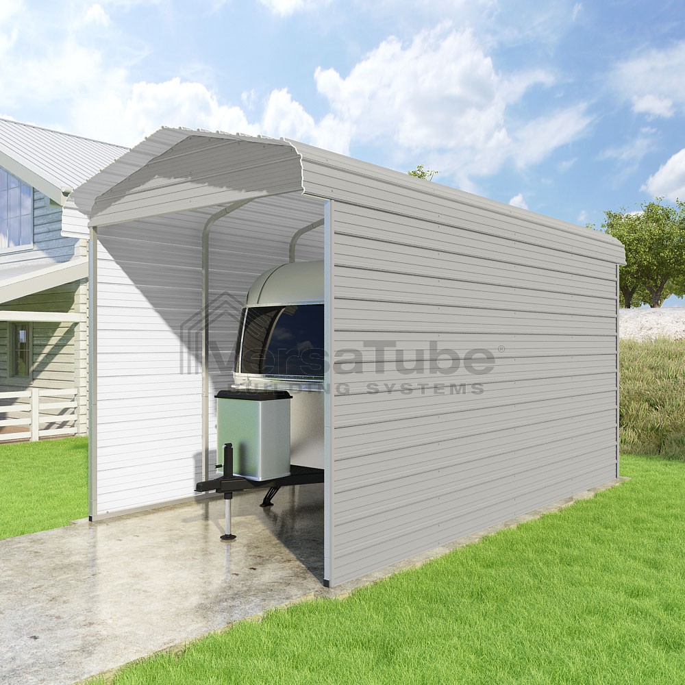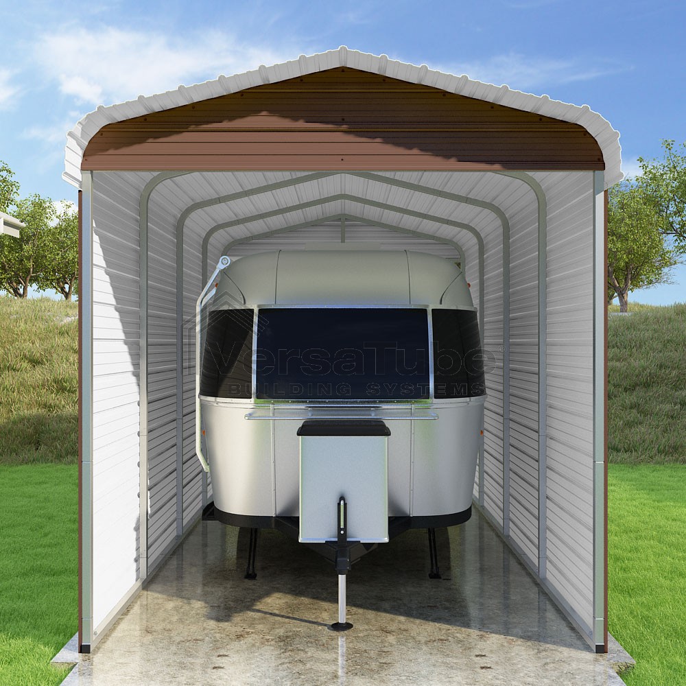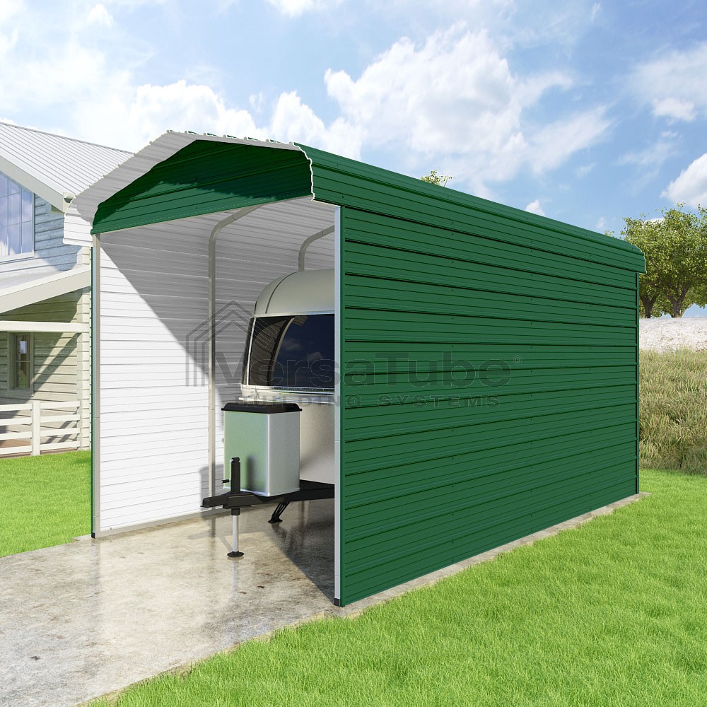 Classic Series DIY carport kit features horizontal application of sheet metal panels with the extra protection of rounded eaves.