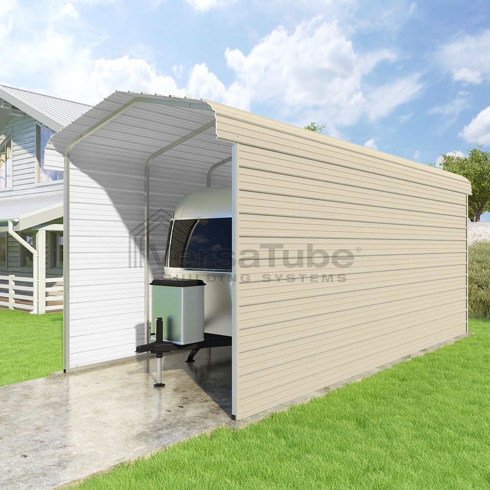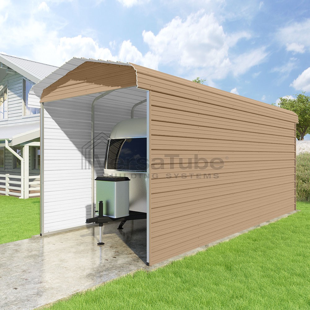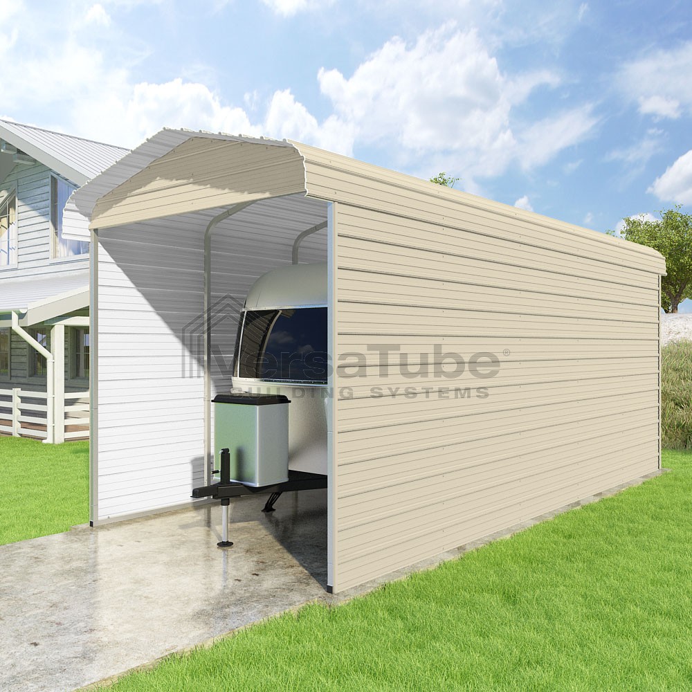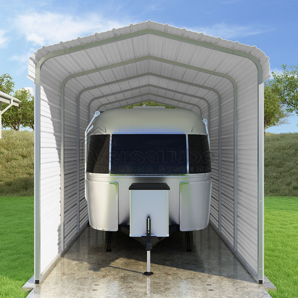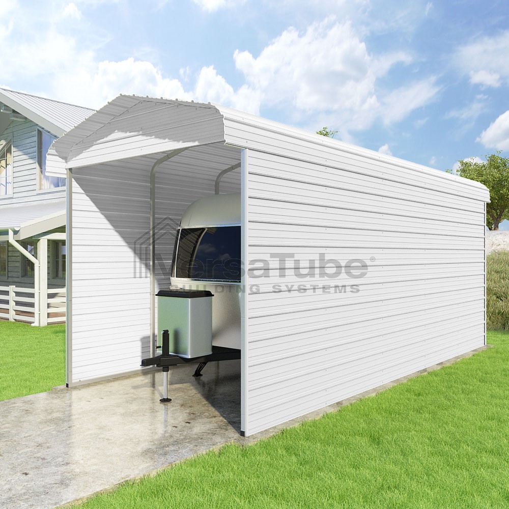 Classic Series DIY carport kit features horizontal application of sheet metal panels with the extra protection of rounded eaves.
