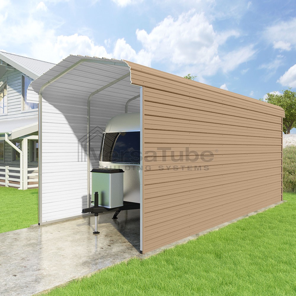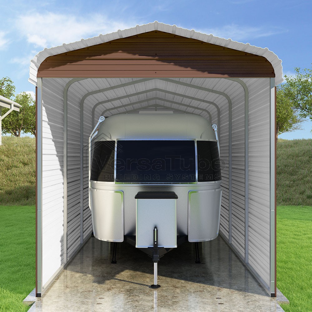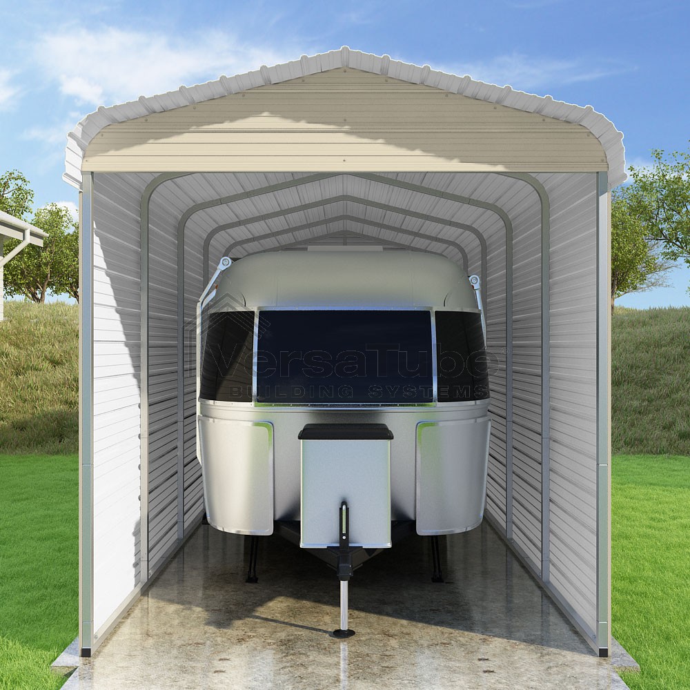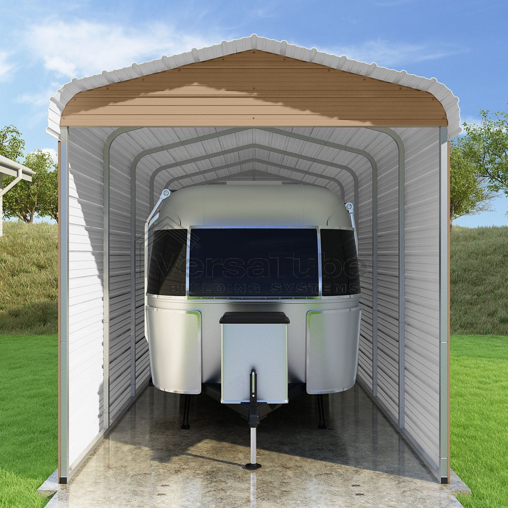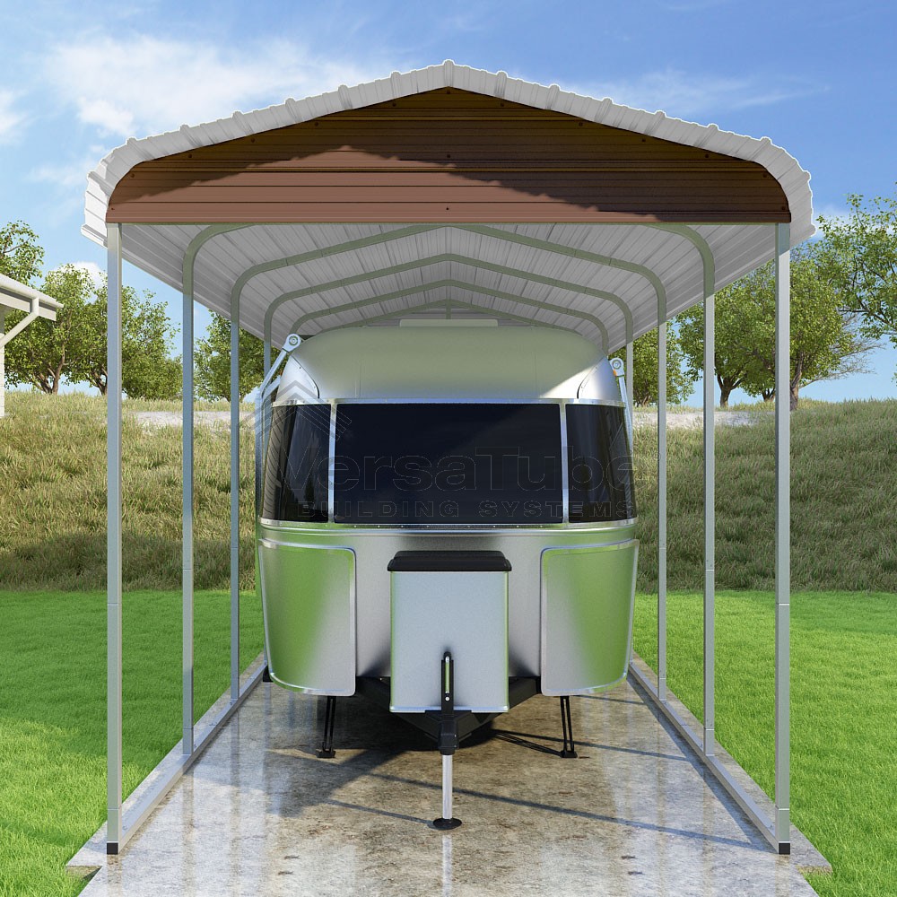 Classic Series DIY carport kit features horizontal application of sheet metal panels with the extra protection of rounded eaves.