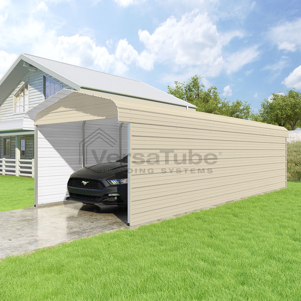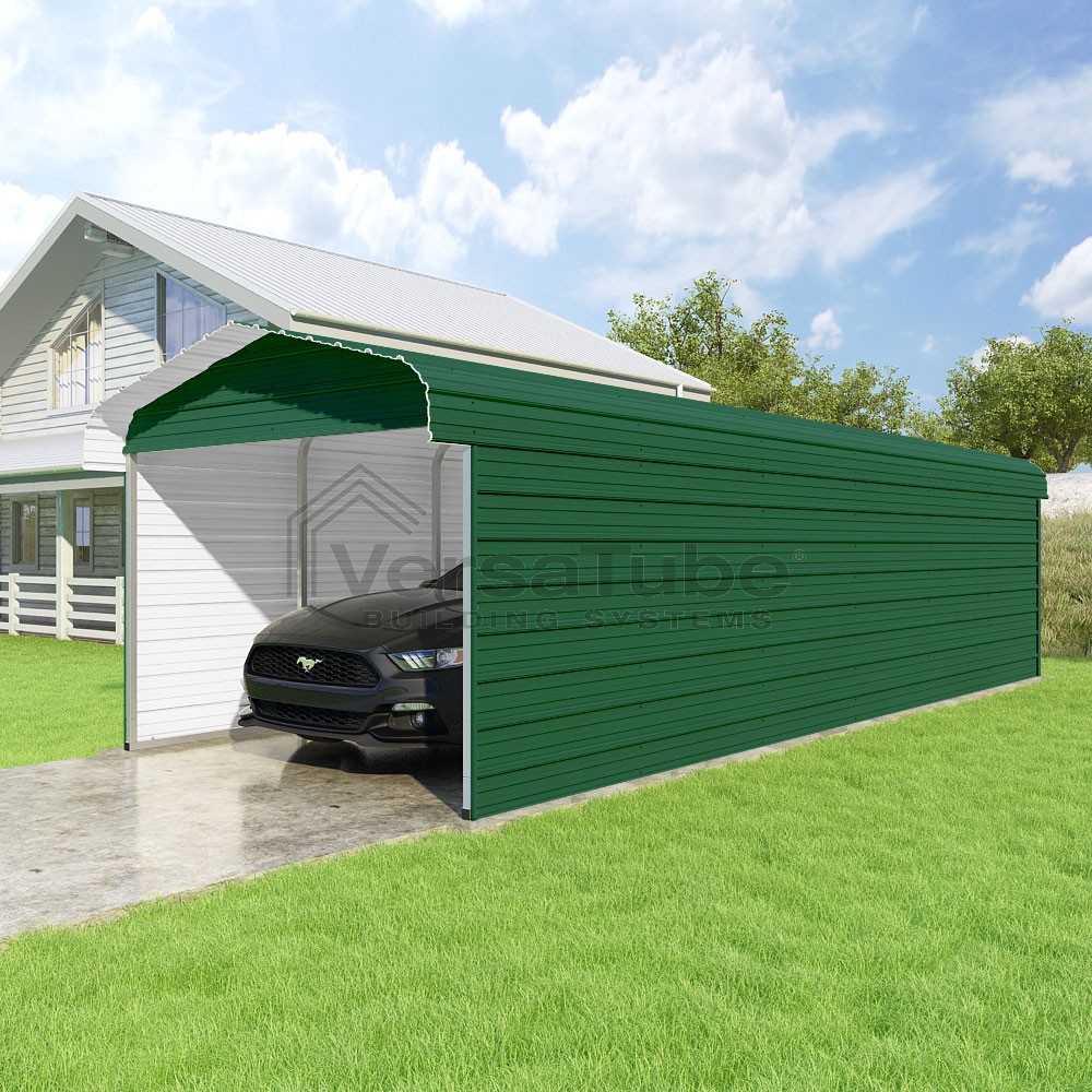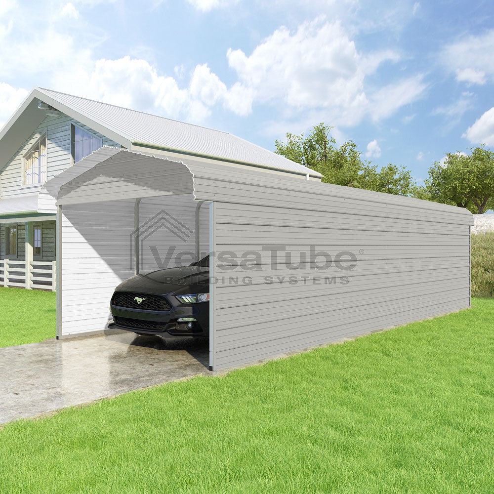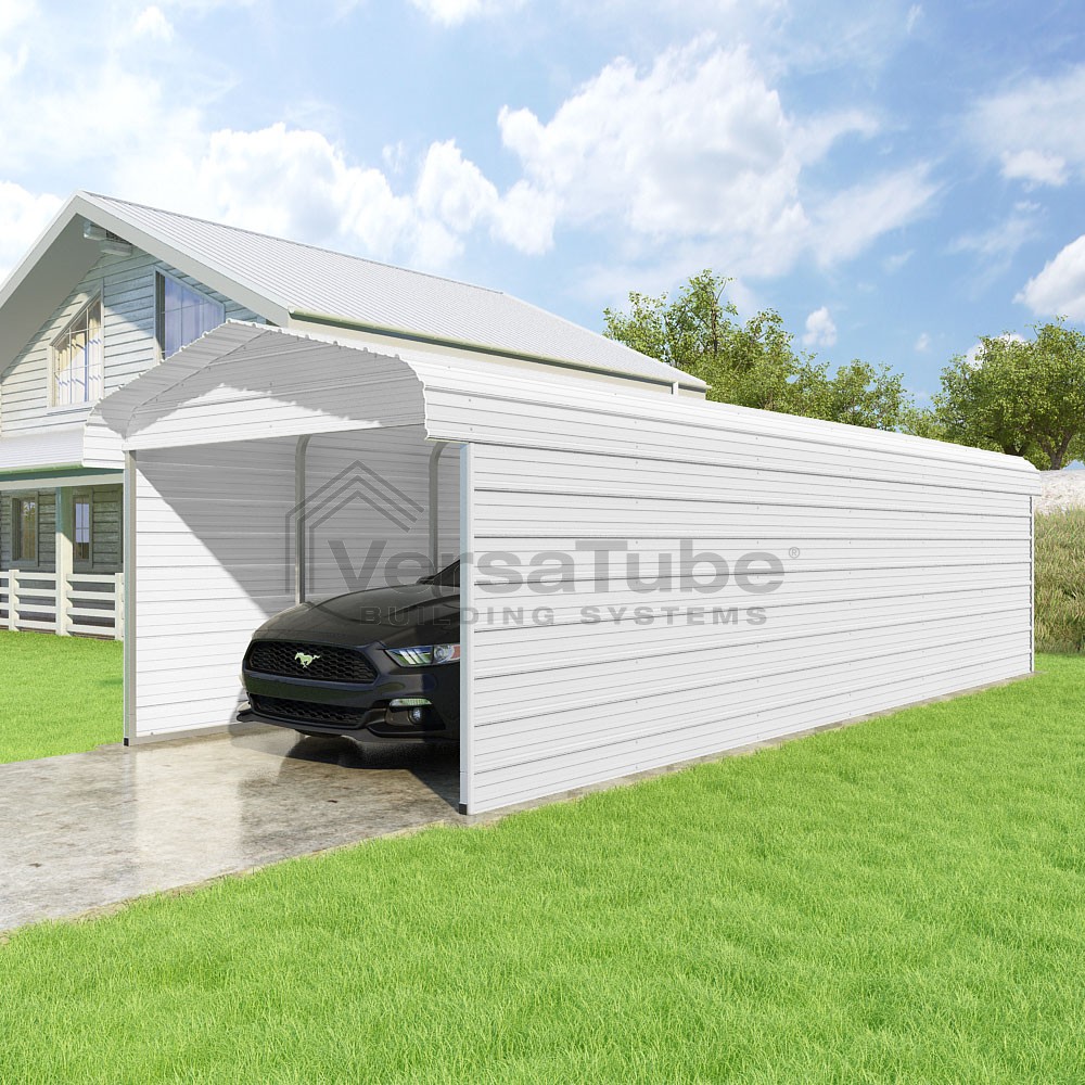 Classic Series DIY carport kit features horizontal application of sheet metal panels with the extra protection of rounded eaves.