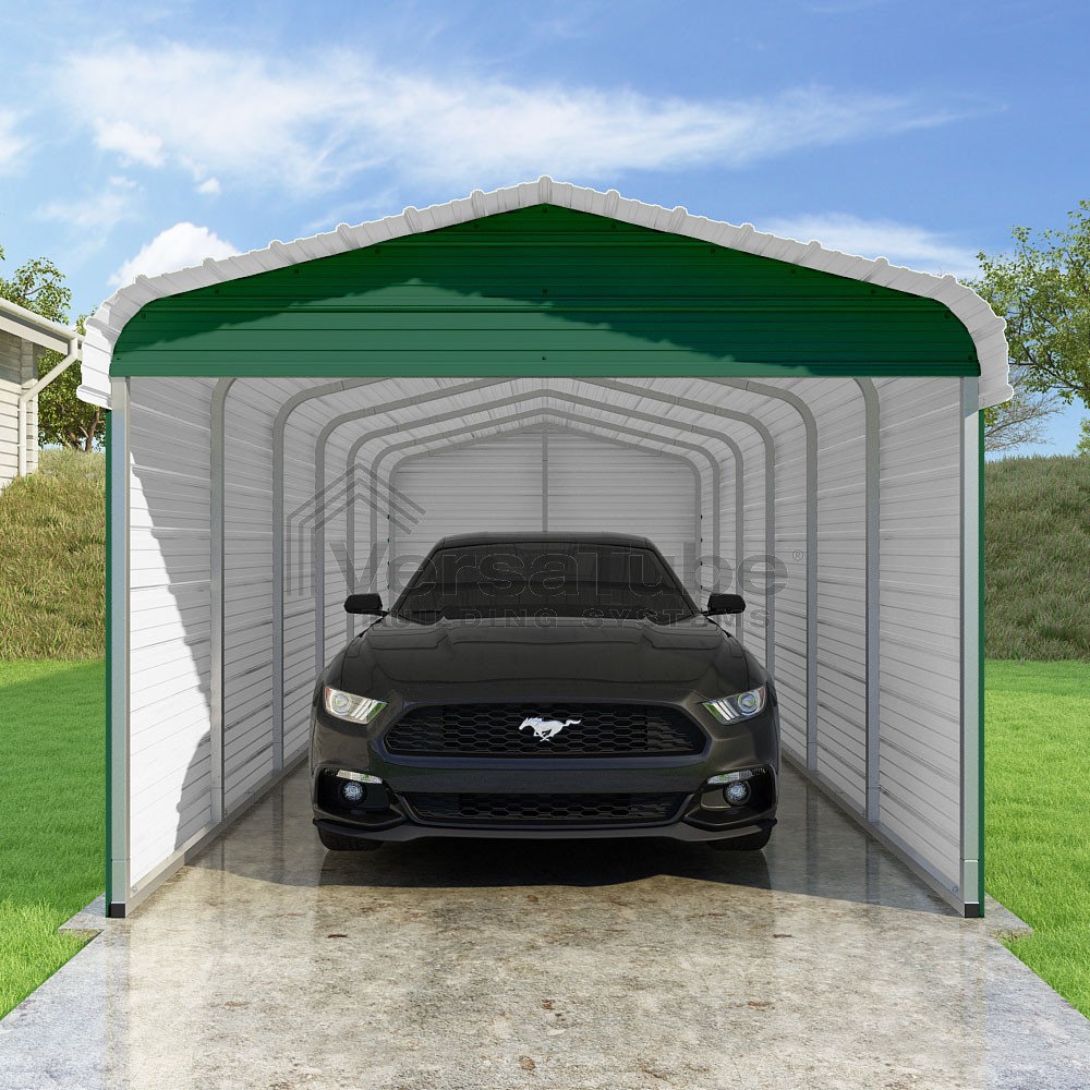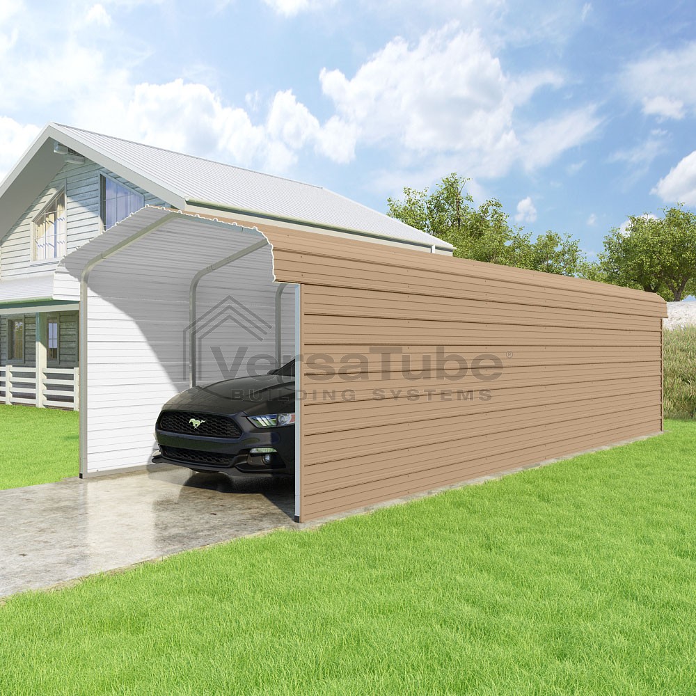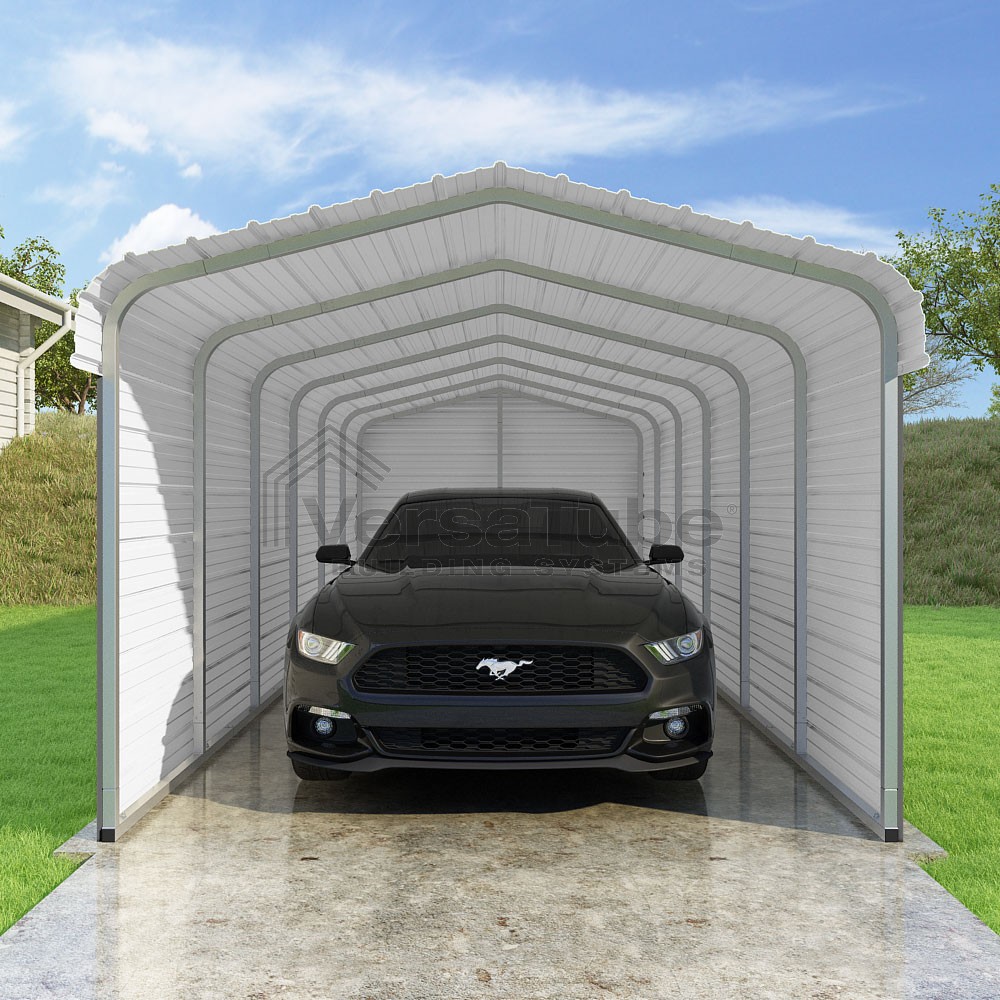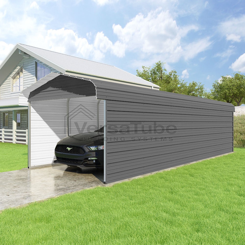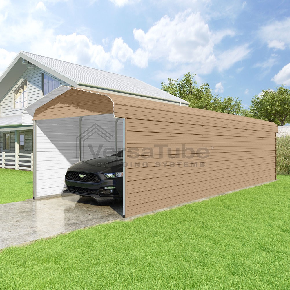 Classic Series DIY carport kit features horizontal application of sheet metal panels with the extra protection of rounded eaves.