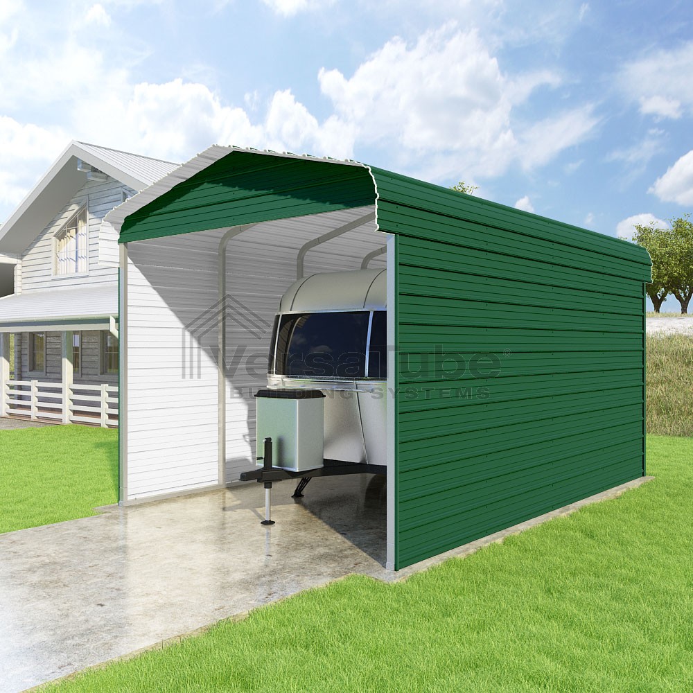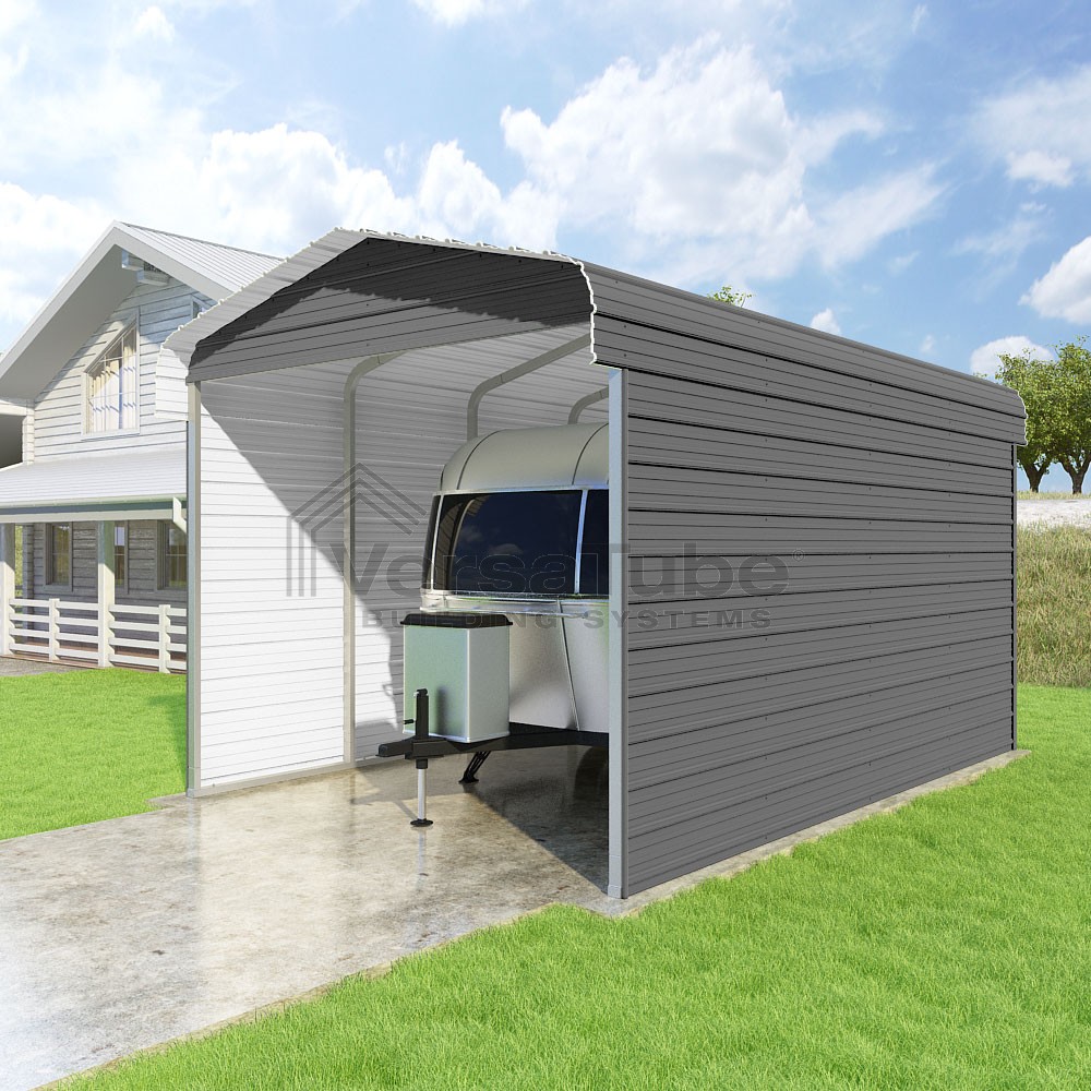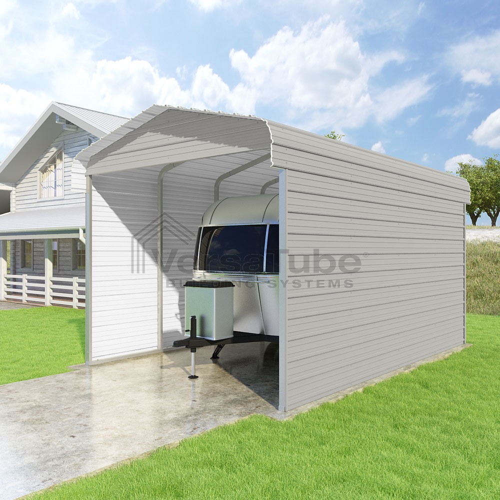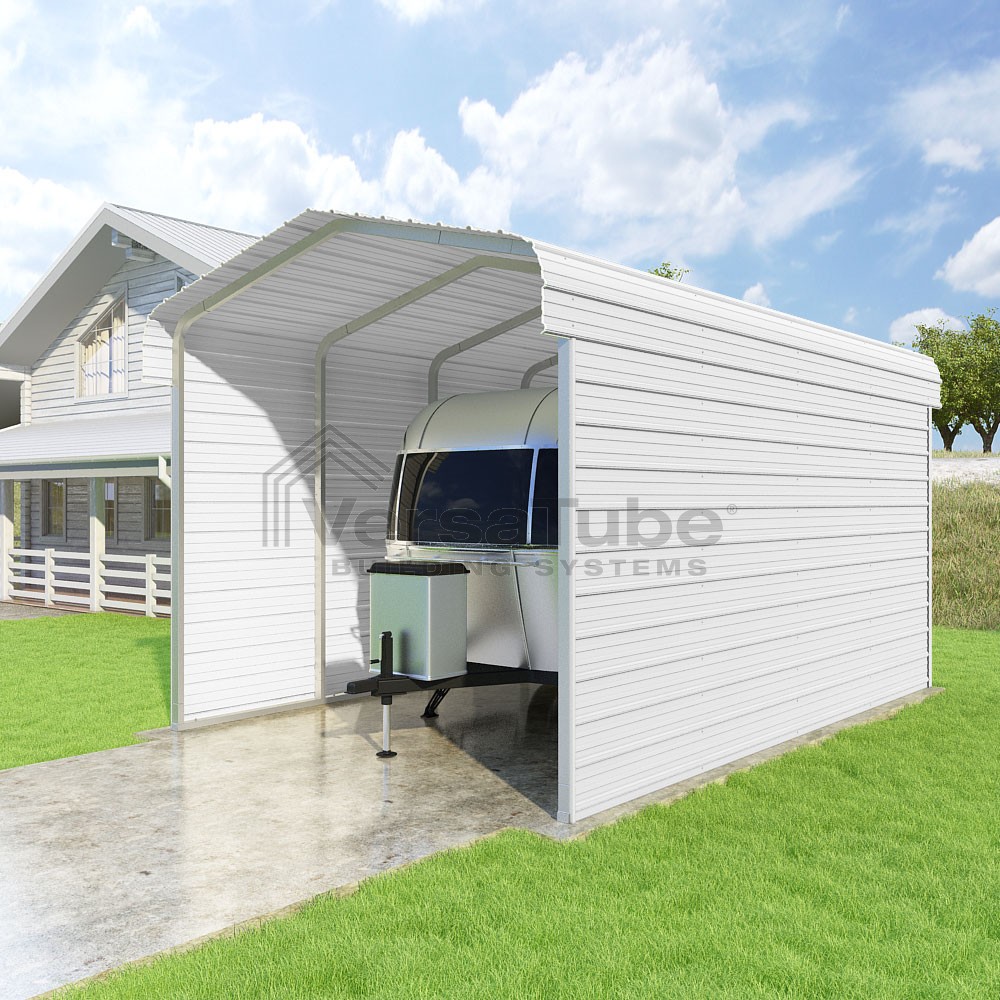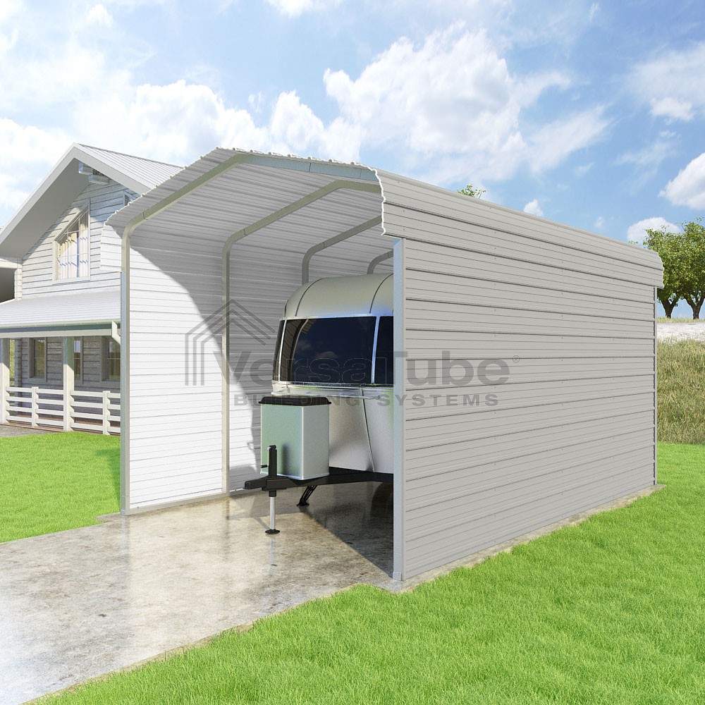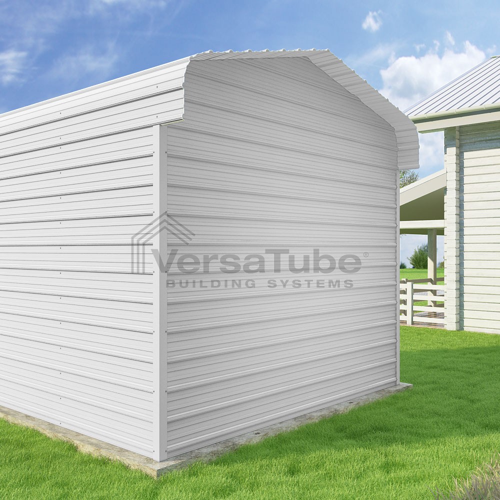 Classic Series DIY carport kit features horizontal application of sheet metal panels with the extra protection of rounded eaves.