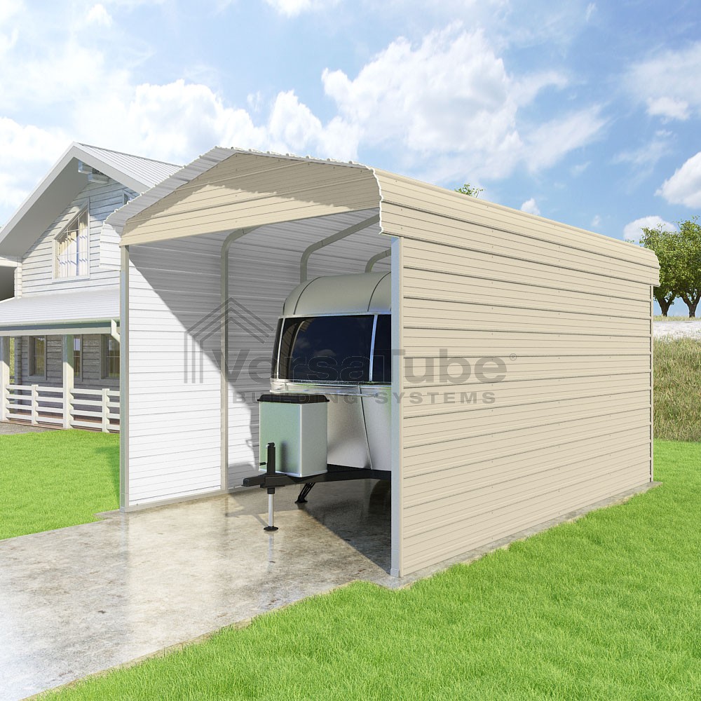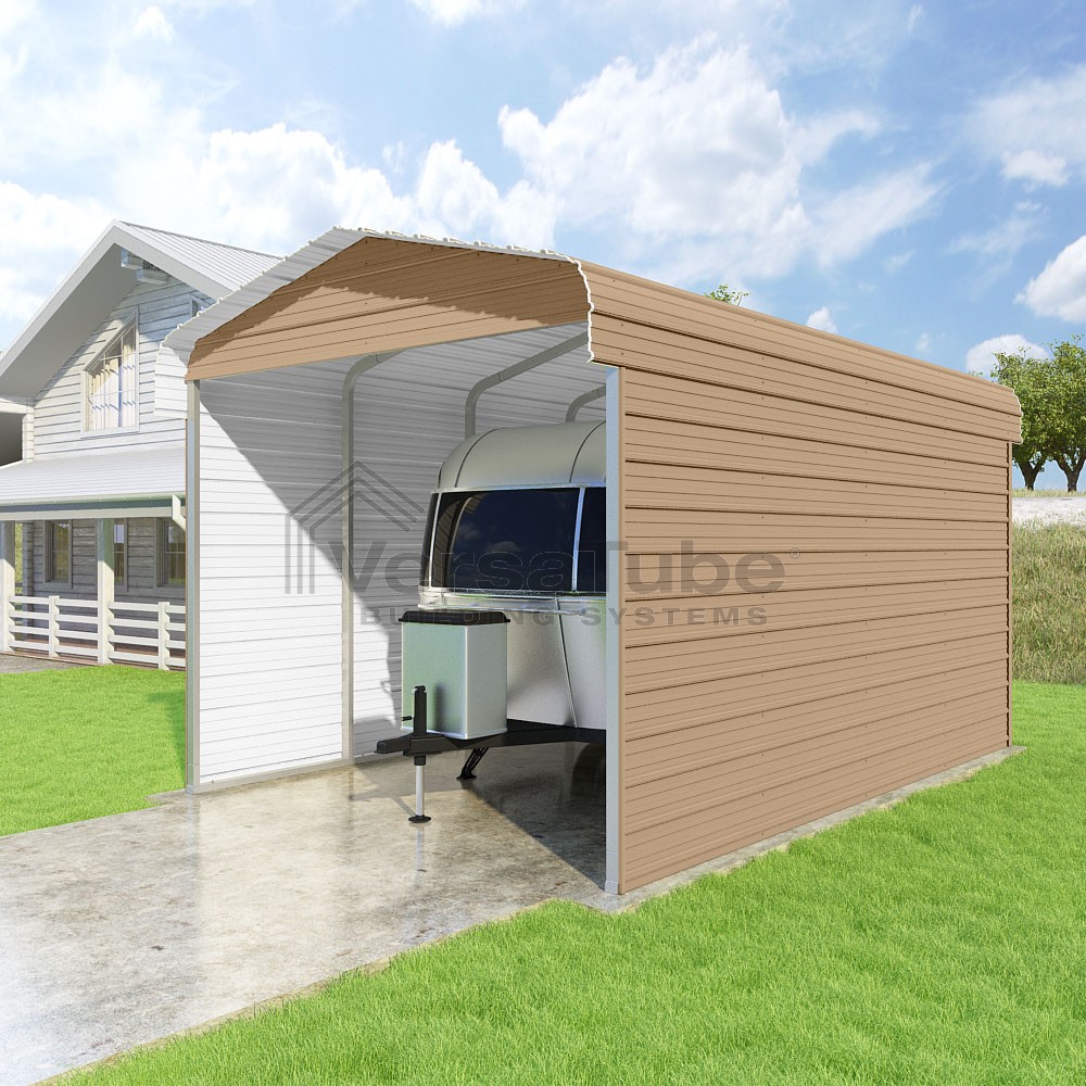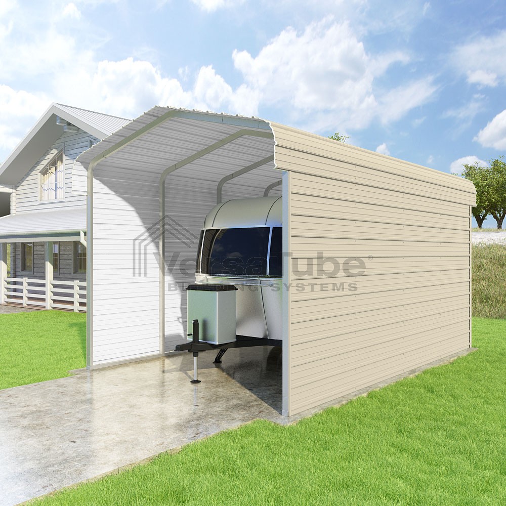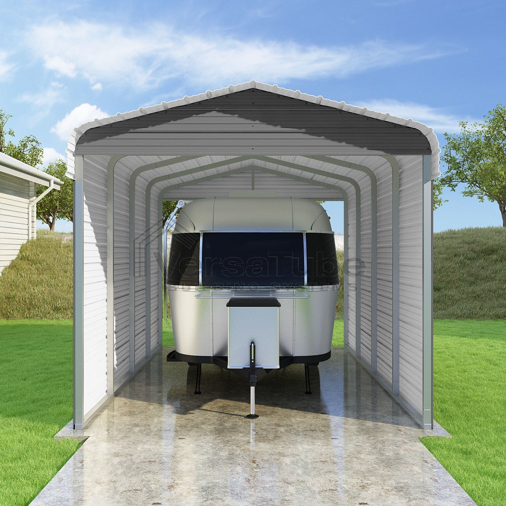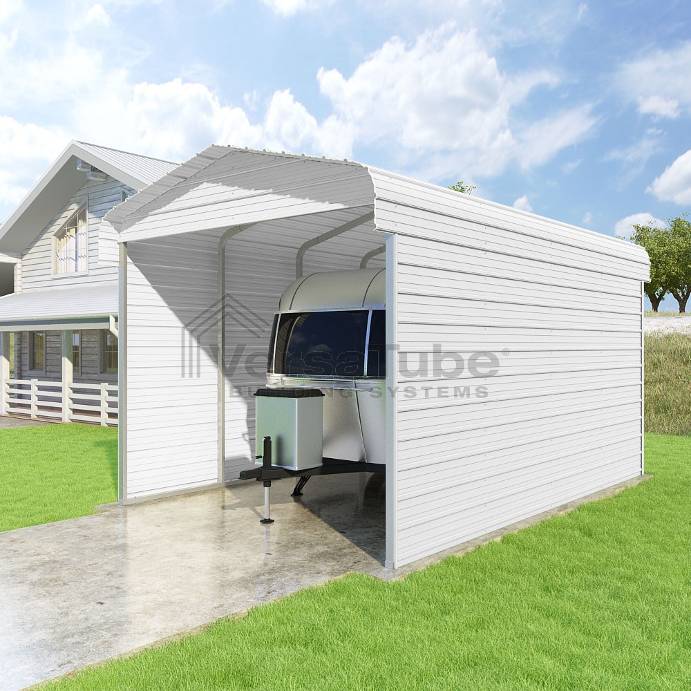 Classic Series DIY carport kit features horizontal application of sheet metal panels with the extra protection of rounded eaves.