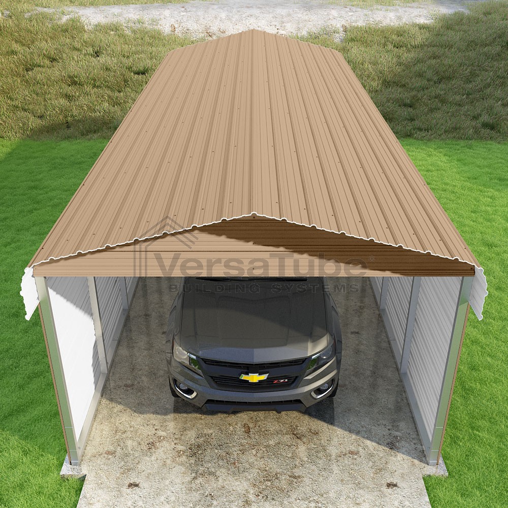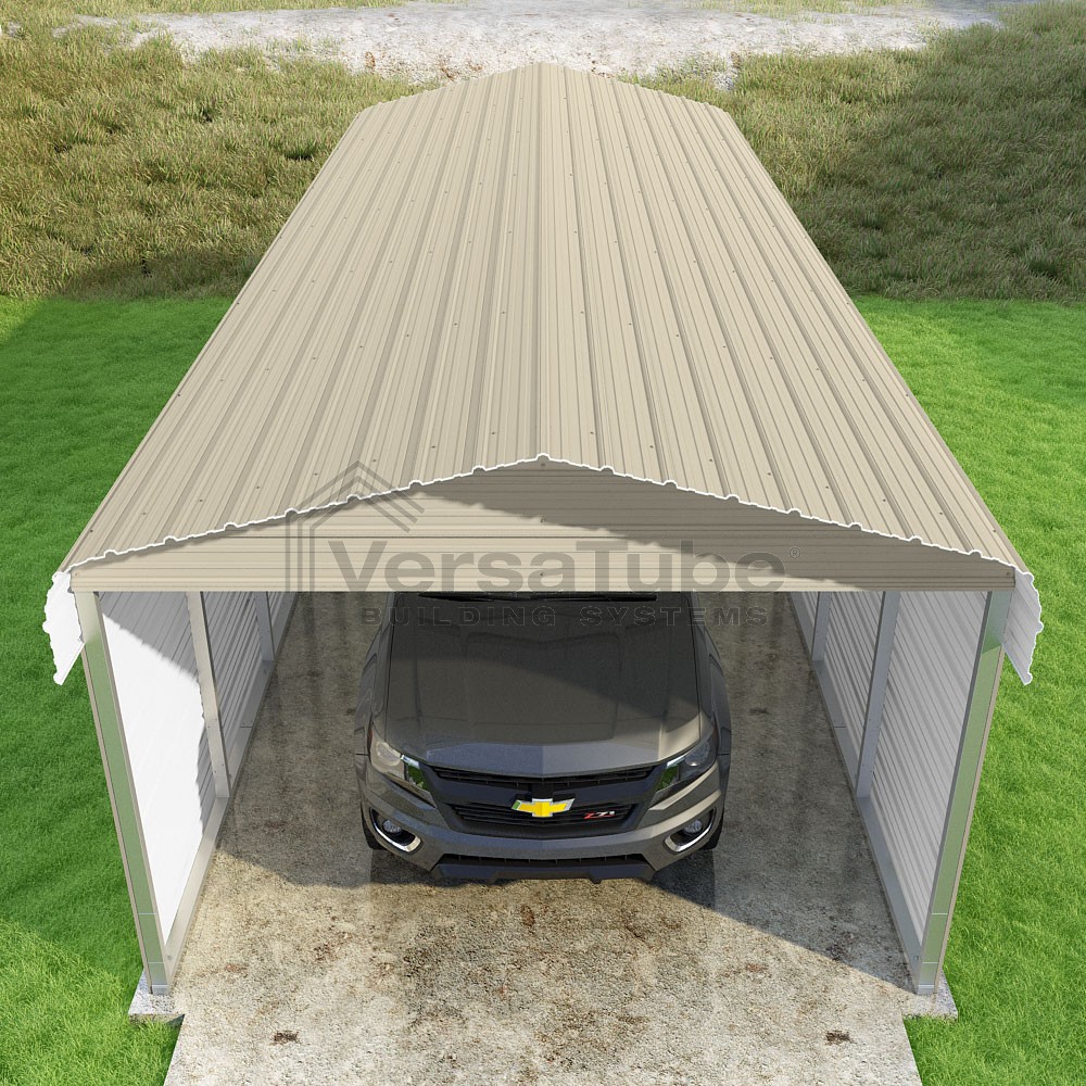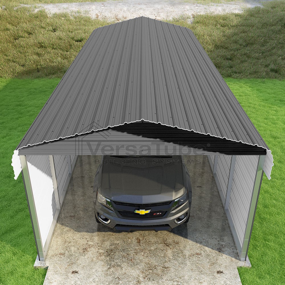 Classic Series DIY carport kit features horizontal application of sheet metal panels with the extra protection of rounded eaves.
