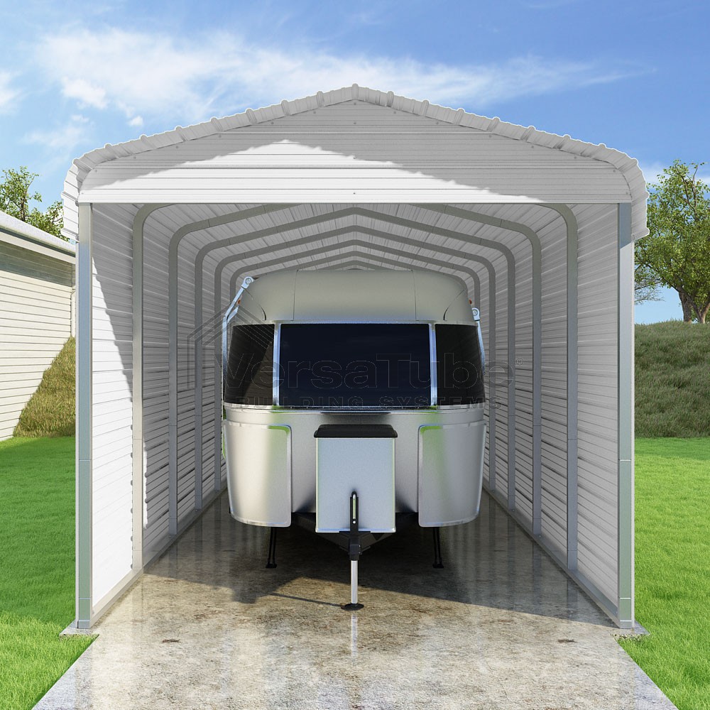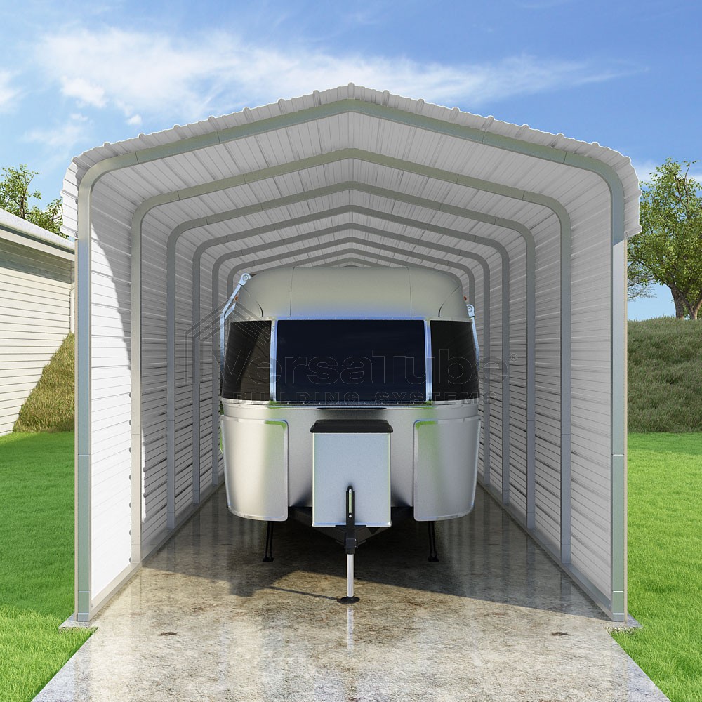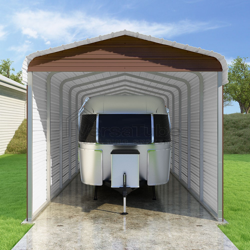 Classic Series DIY carport kit features horizontal application of sheet metal panels with the extra protection of rounded eaves.