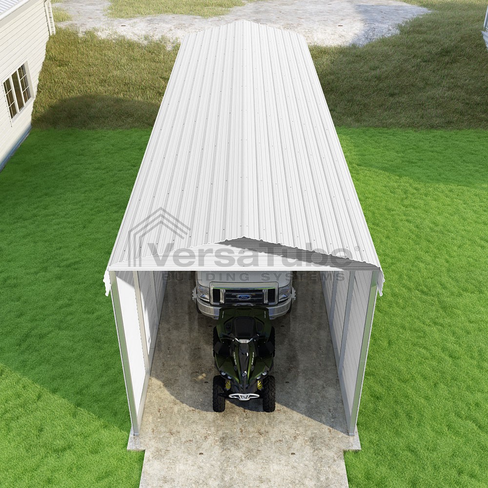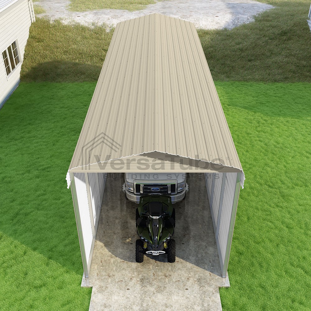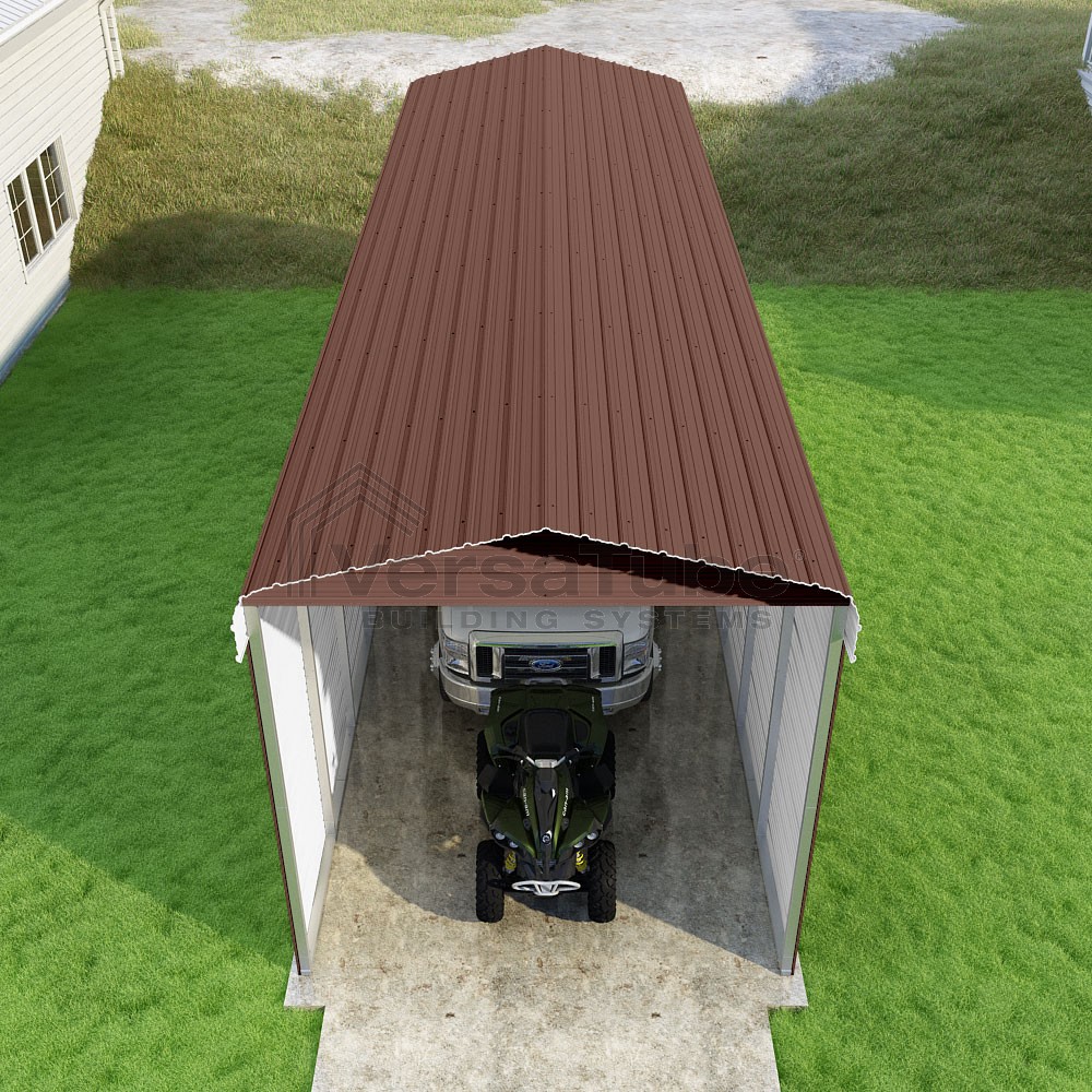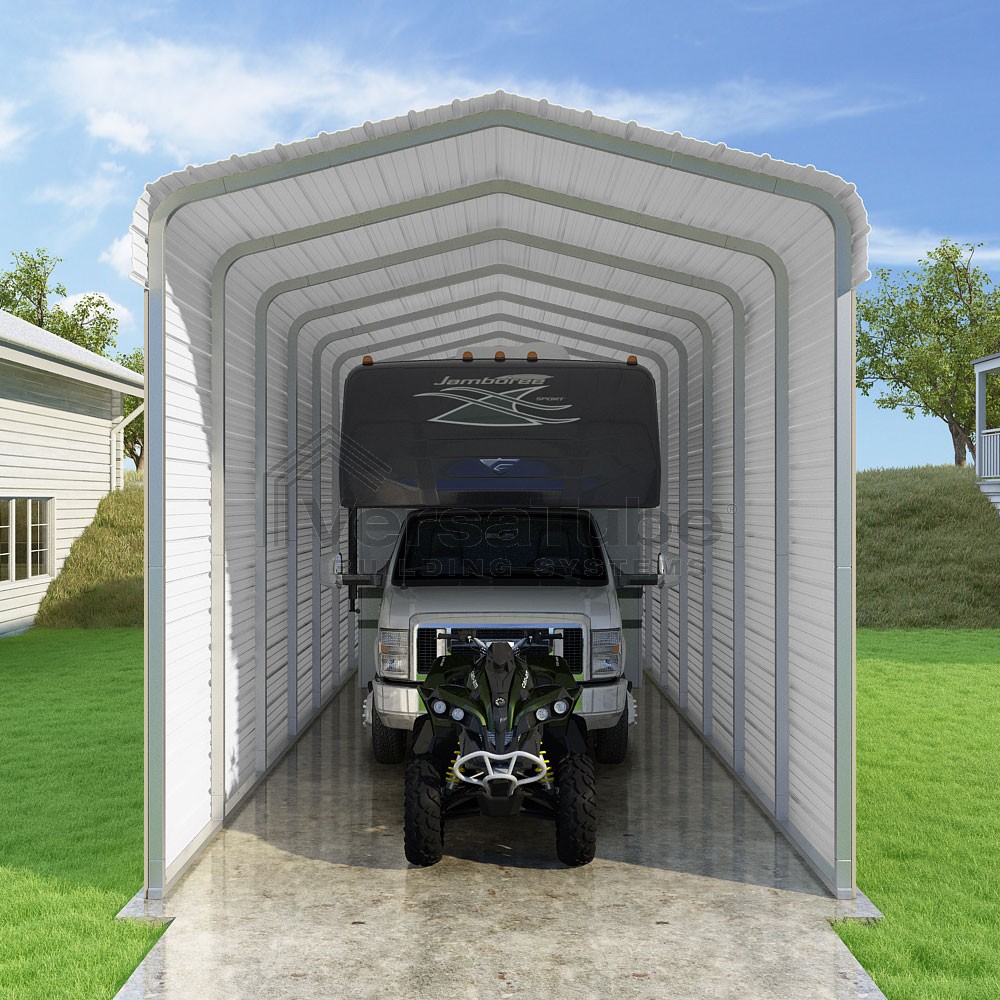 Classic Series DIY carport kit features horizontal application of sheet metal panels with the extra protection of rounded eaves.