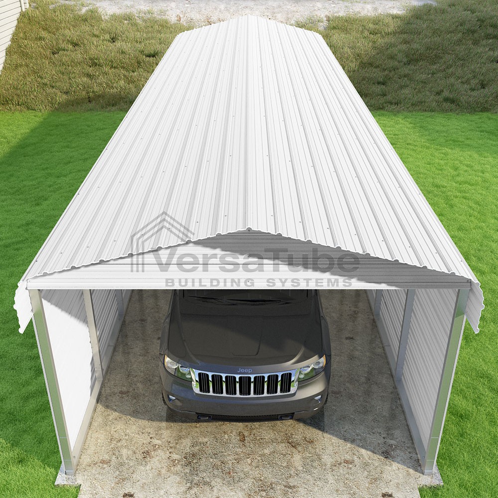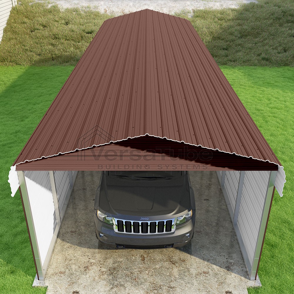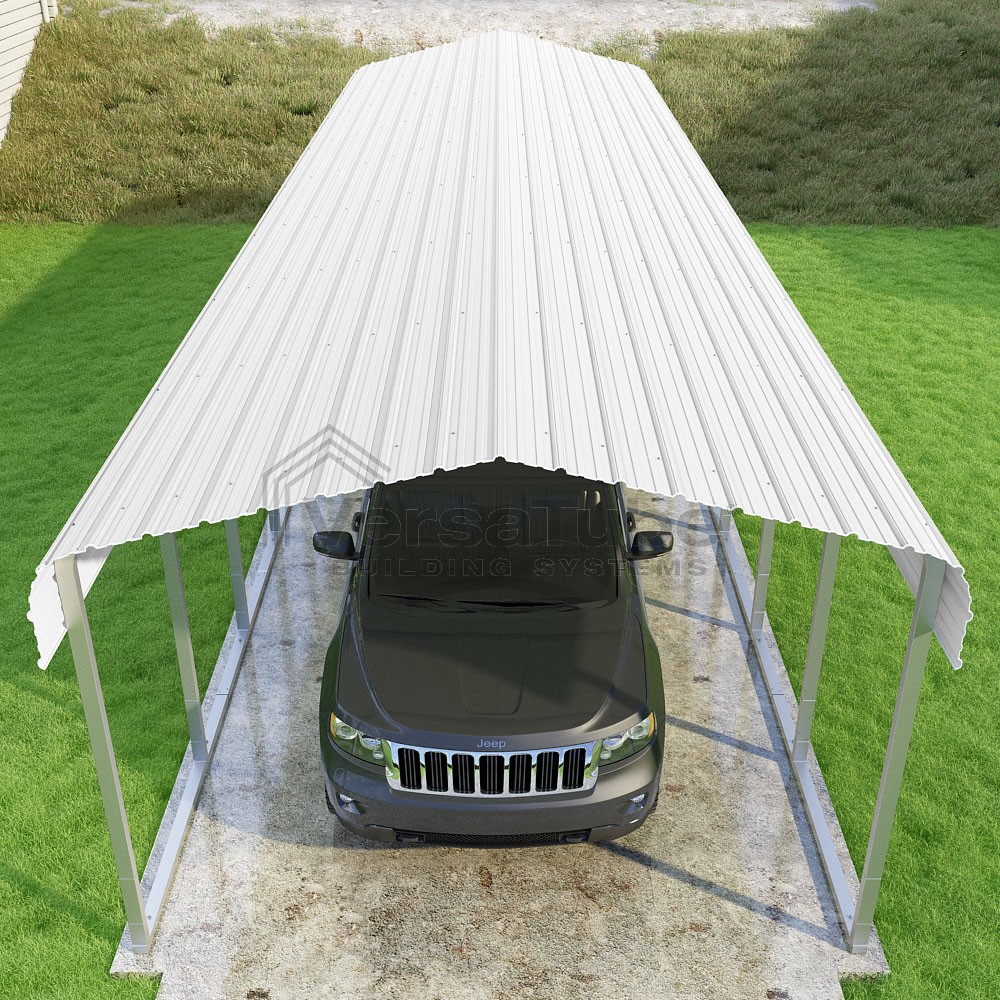 Classic Series DIY carport kit features horizontal application of sheet metal panels with the extra protection of rounded eaves.
