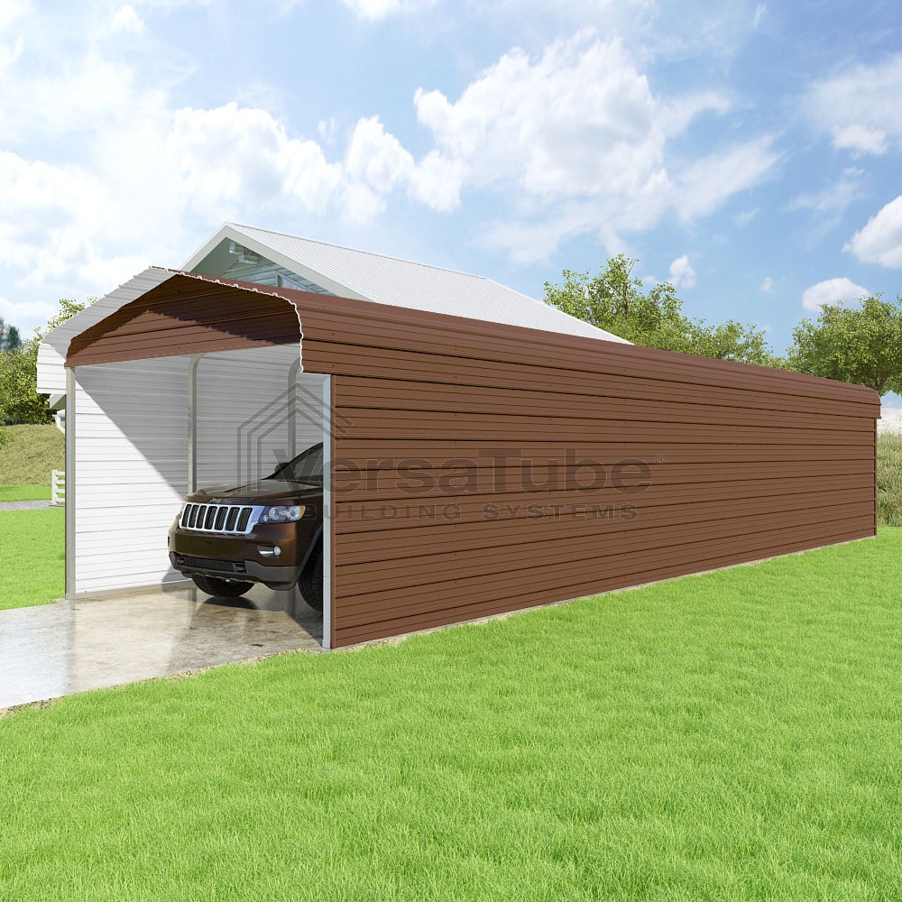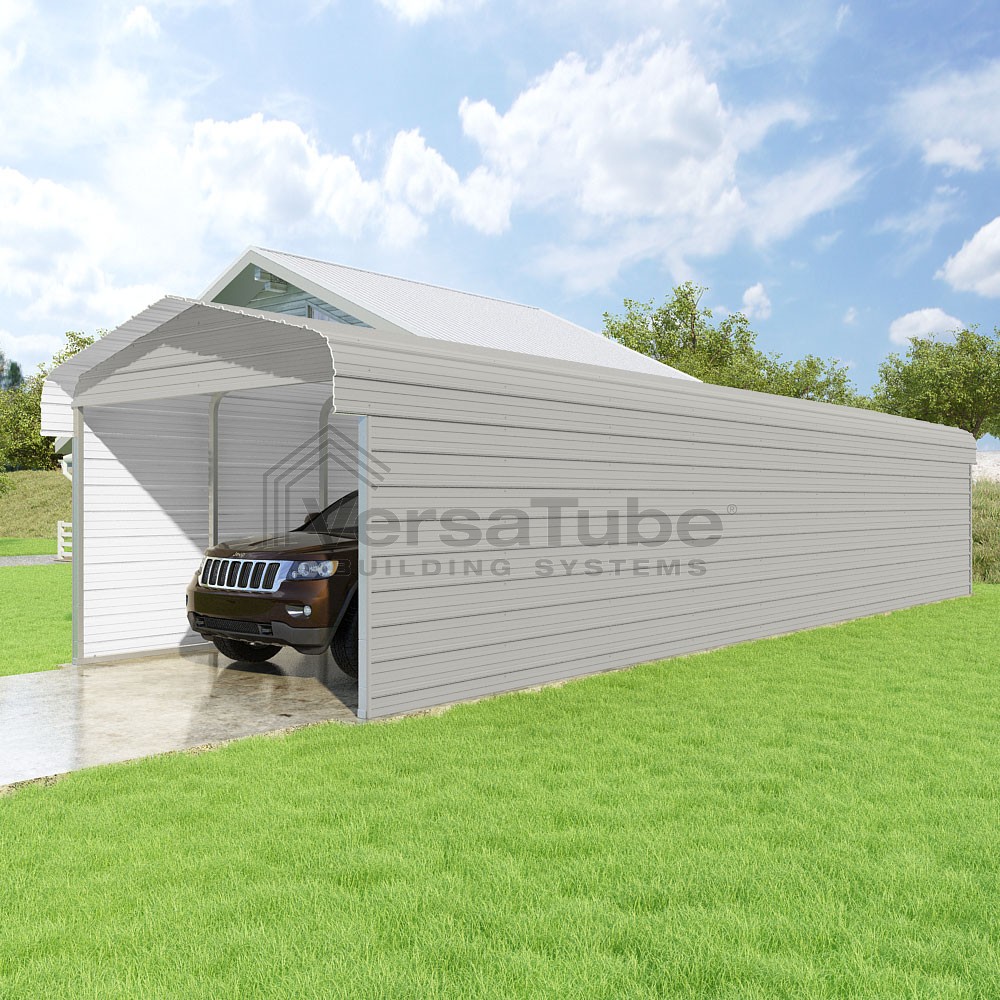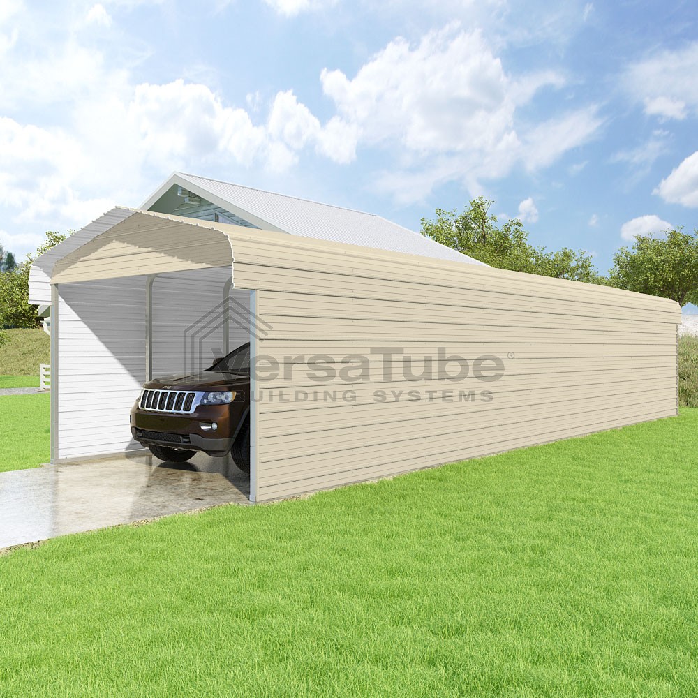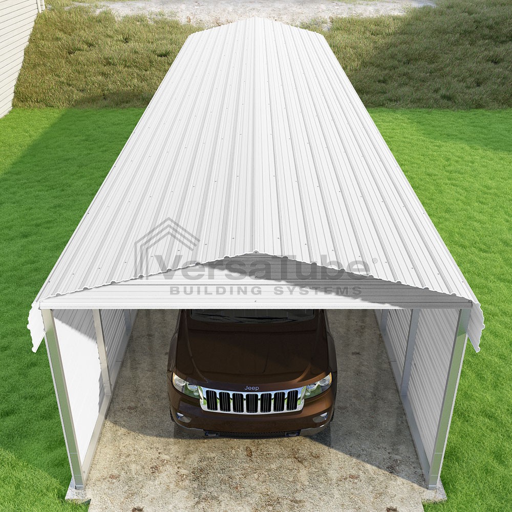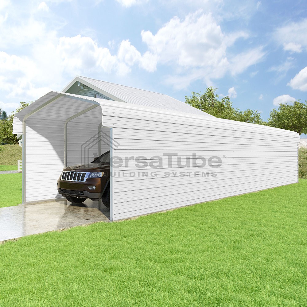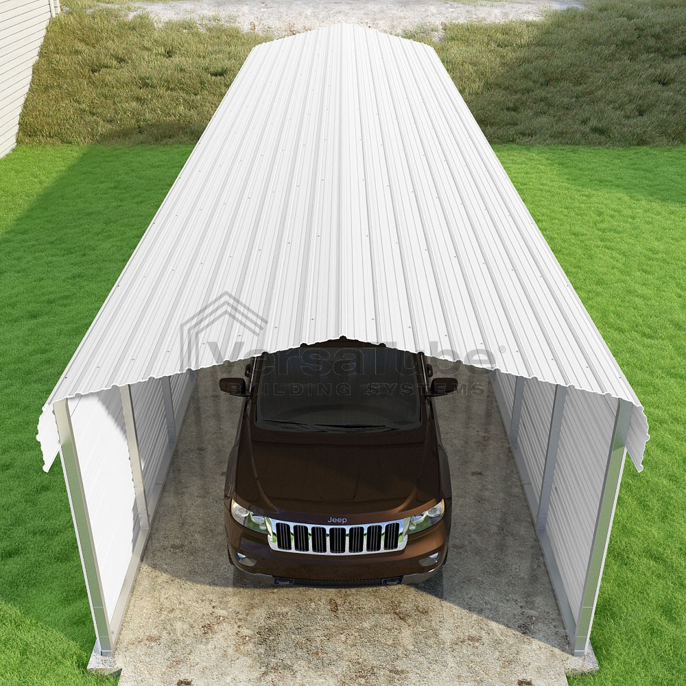 Classic Series DIY carport kit features horizontal application of sheet metal panels with the extra protection of rounded eaves.