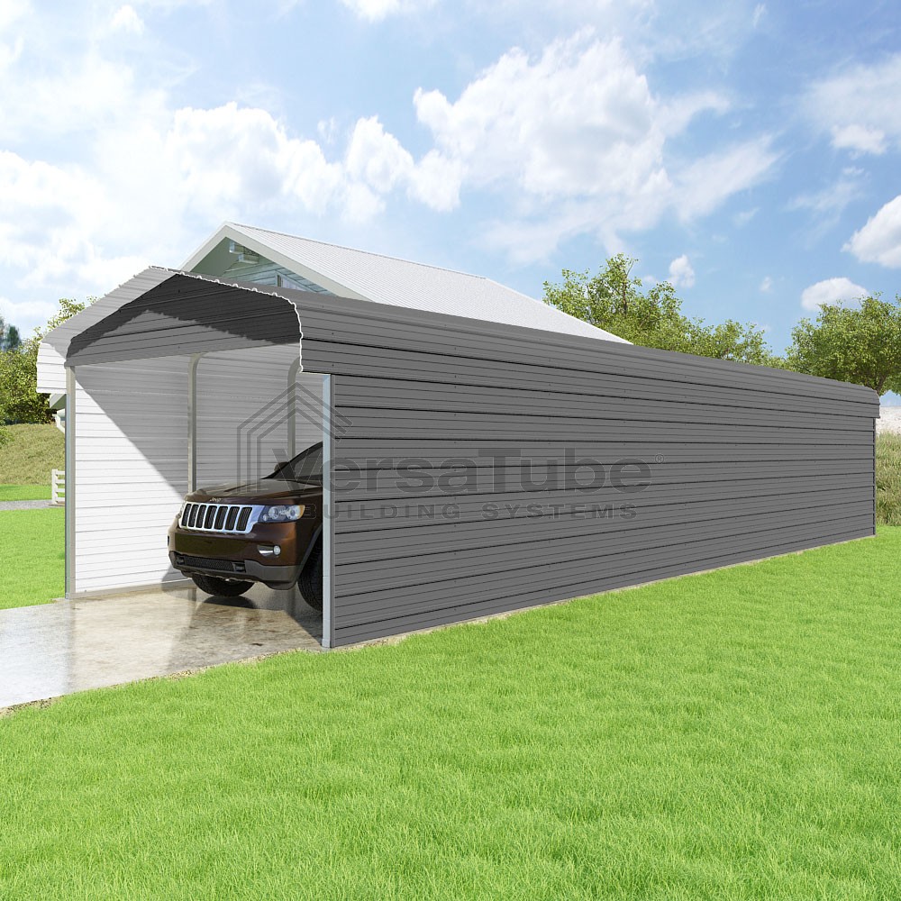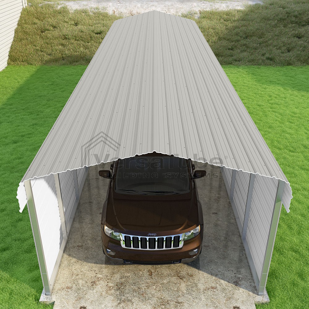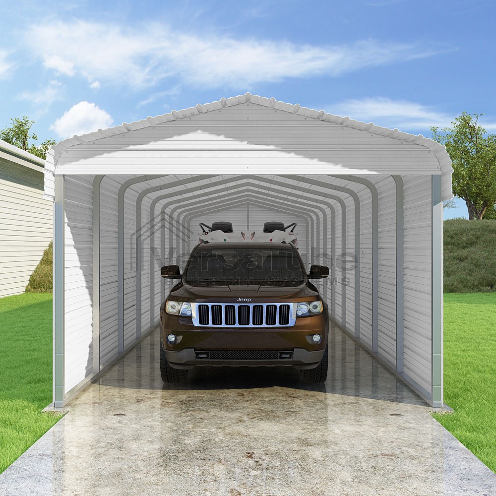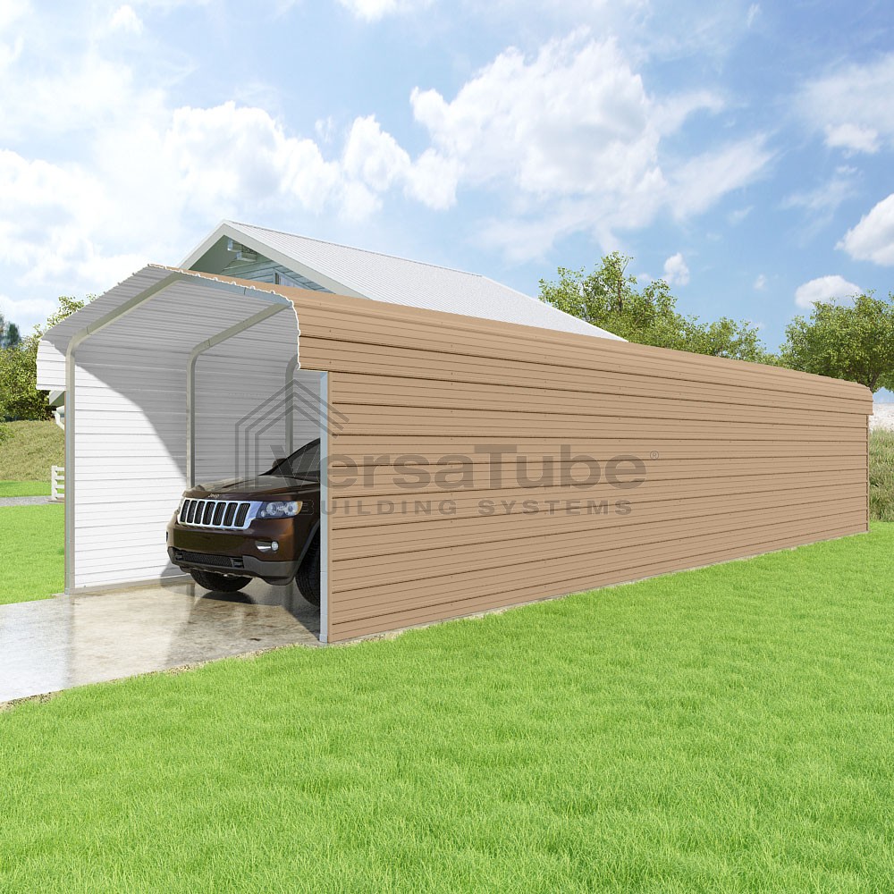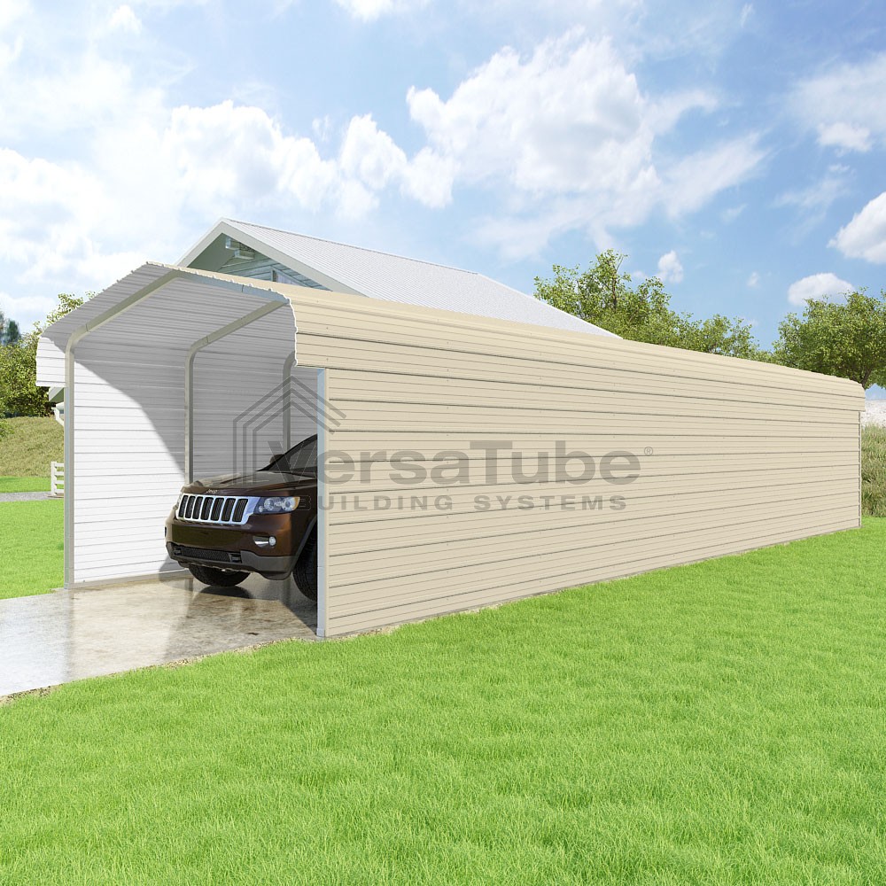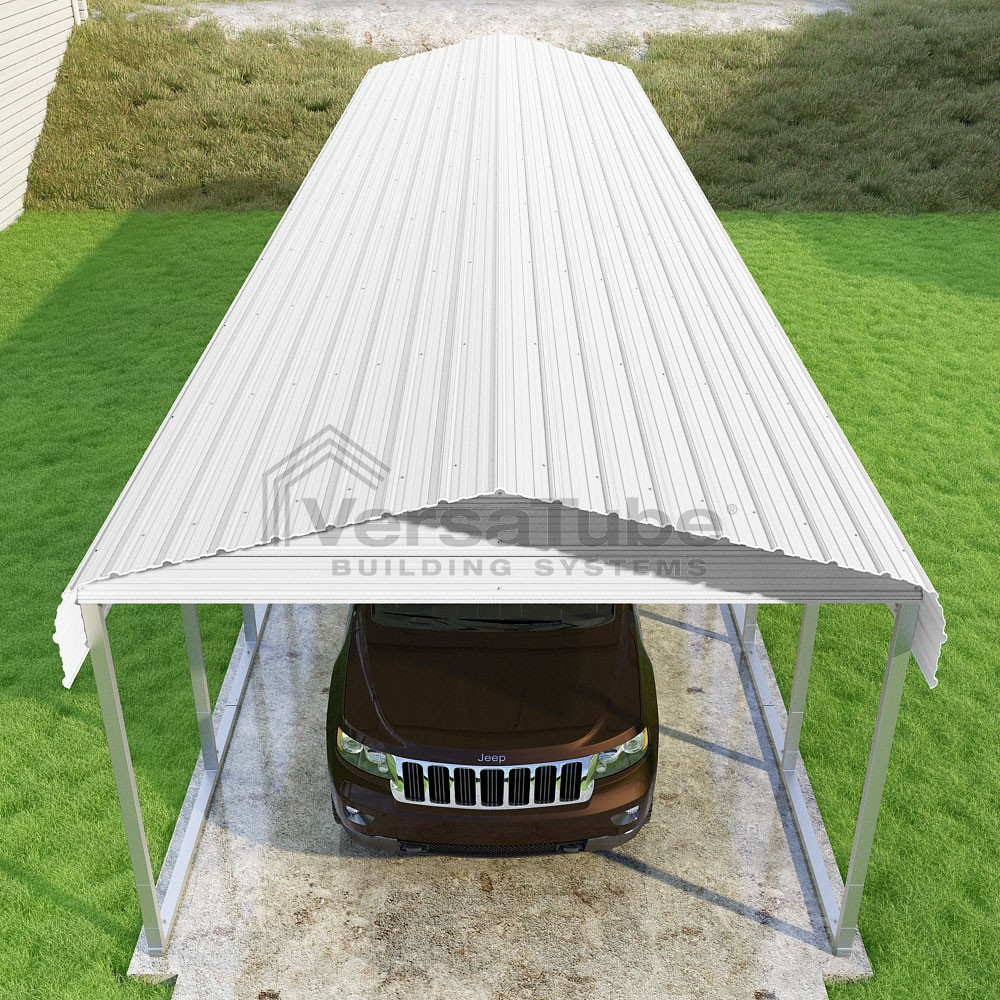 Classic Series DIY carport kit features horizontal application of sheet metal panels with the extra protection of rounded eaves.