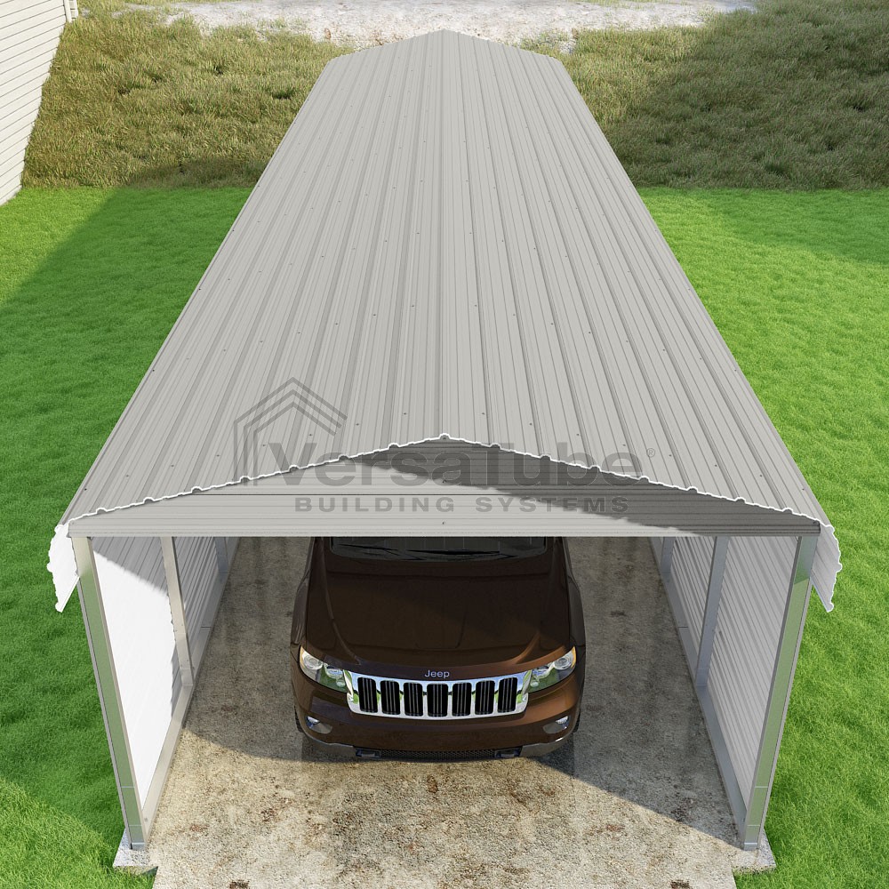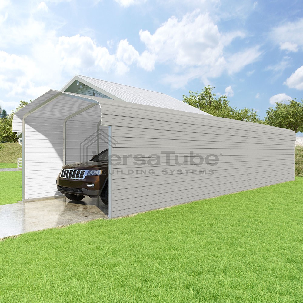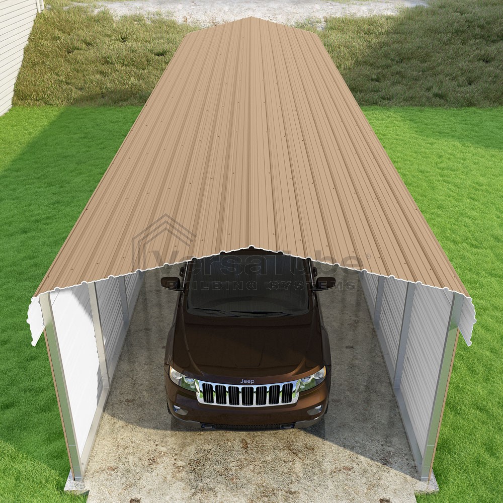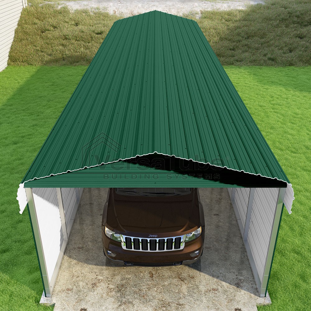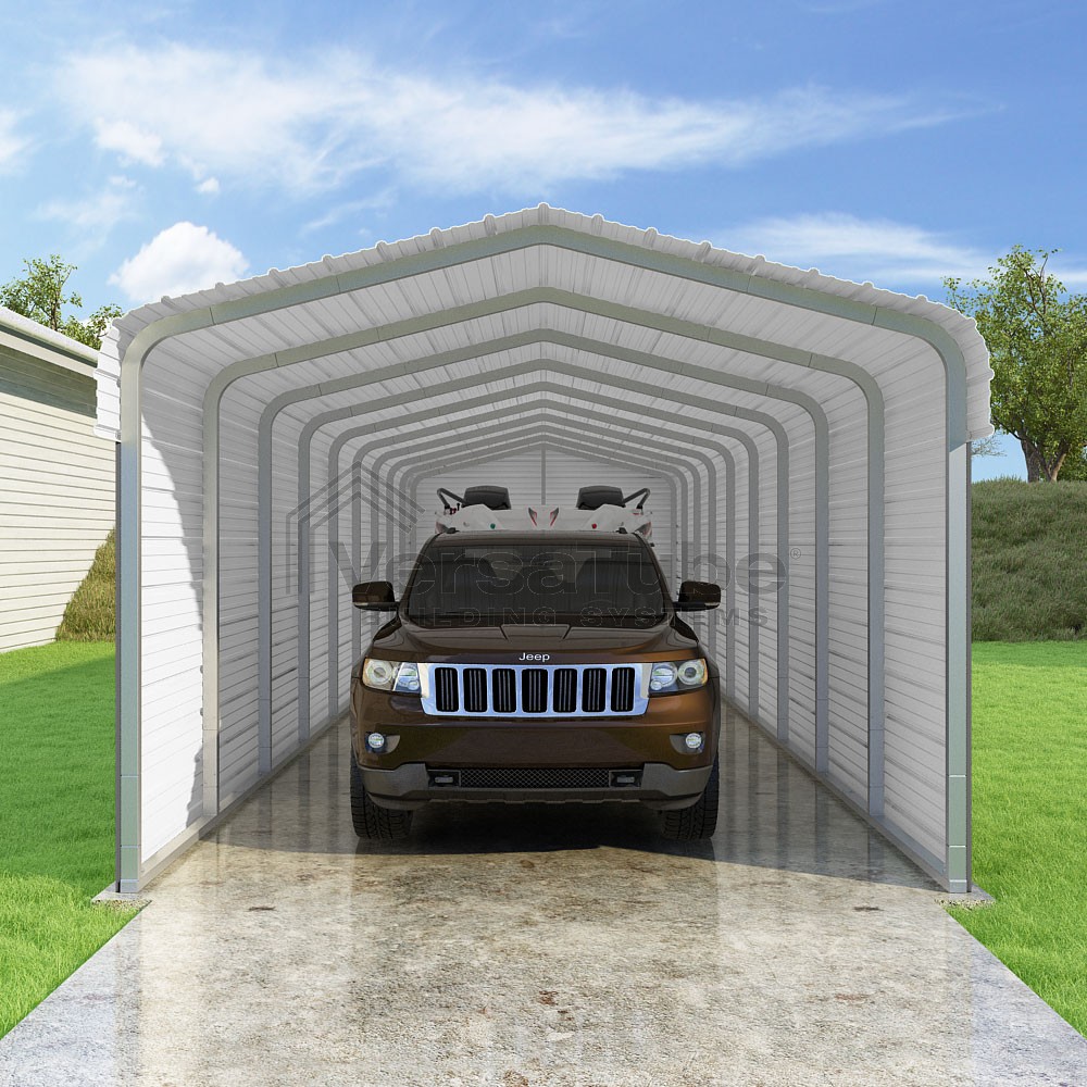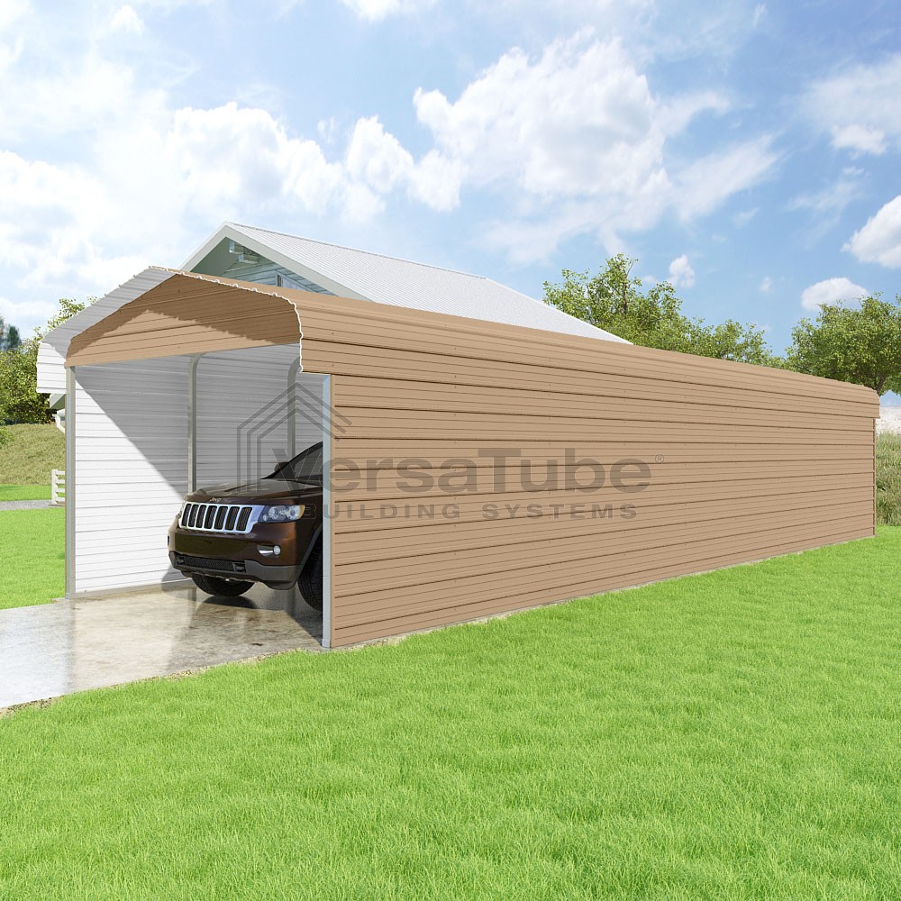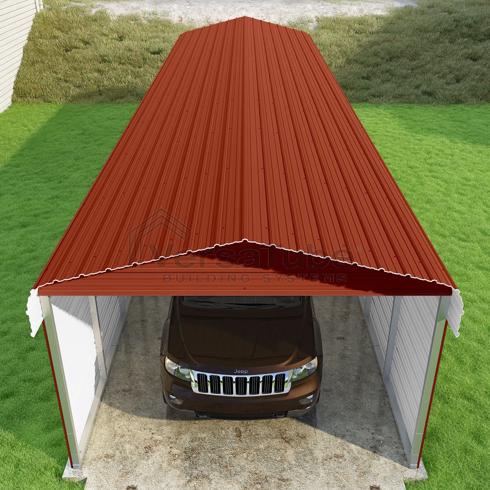 Classic Series DIY carport kit features horizontal application of sheet metal panels with the extra protection of rounded eaves.