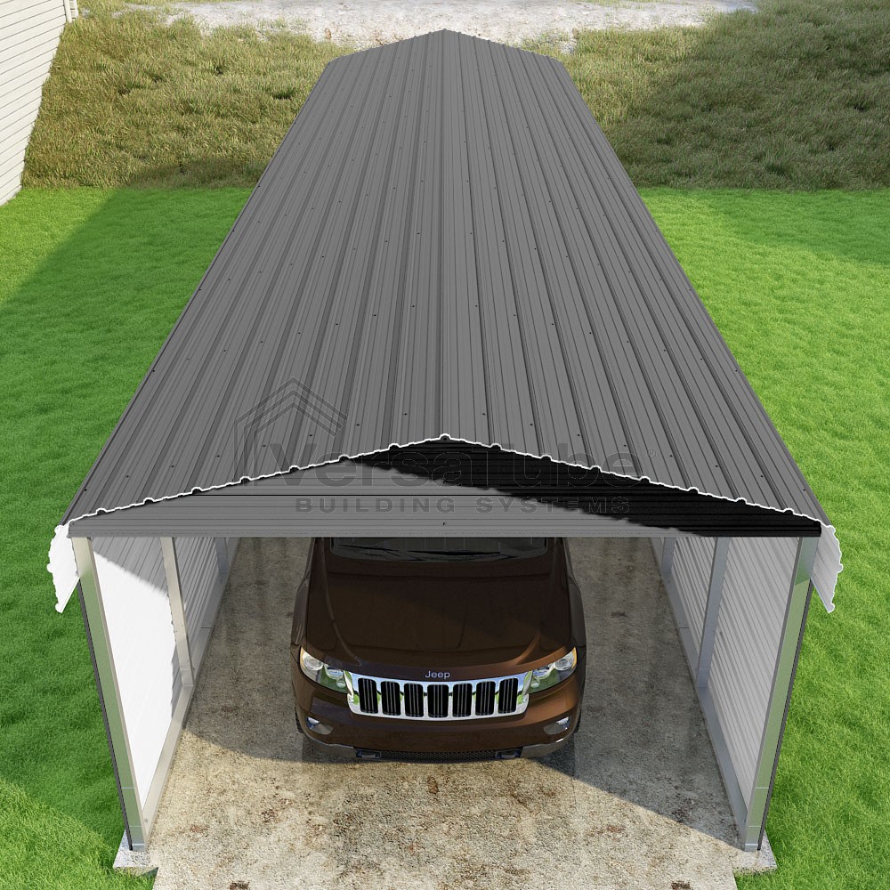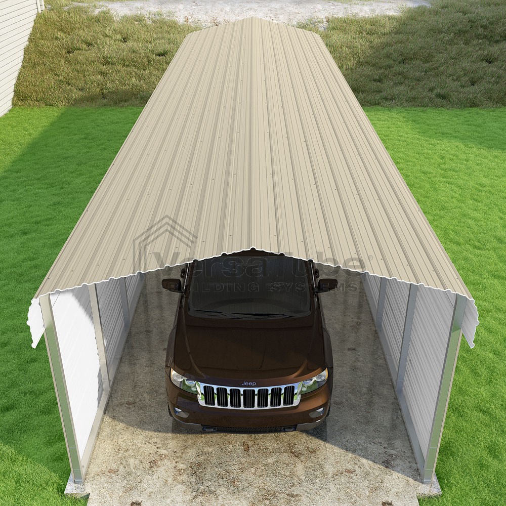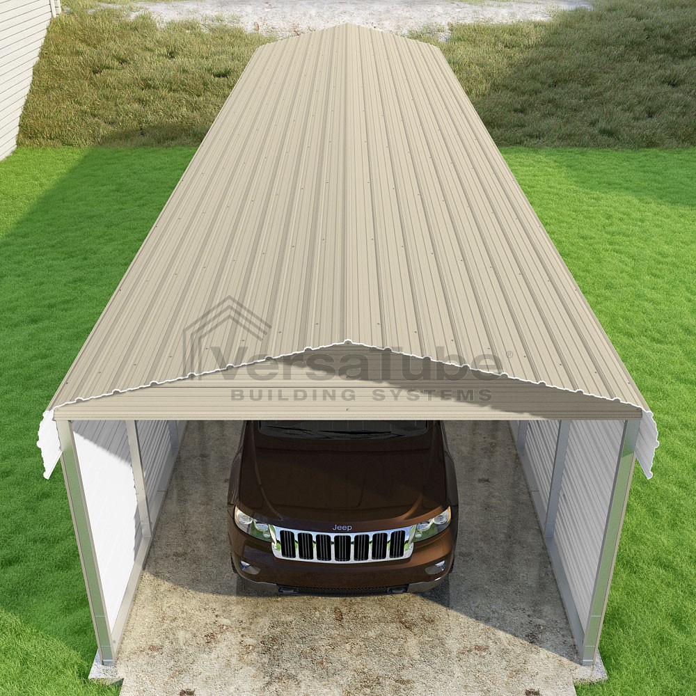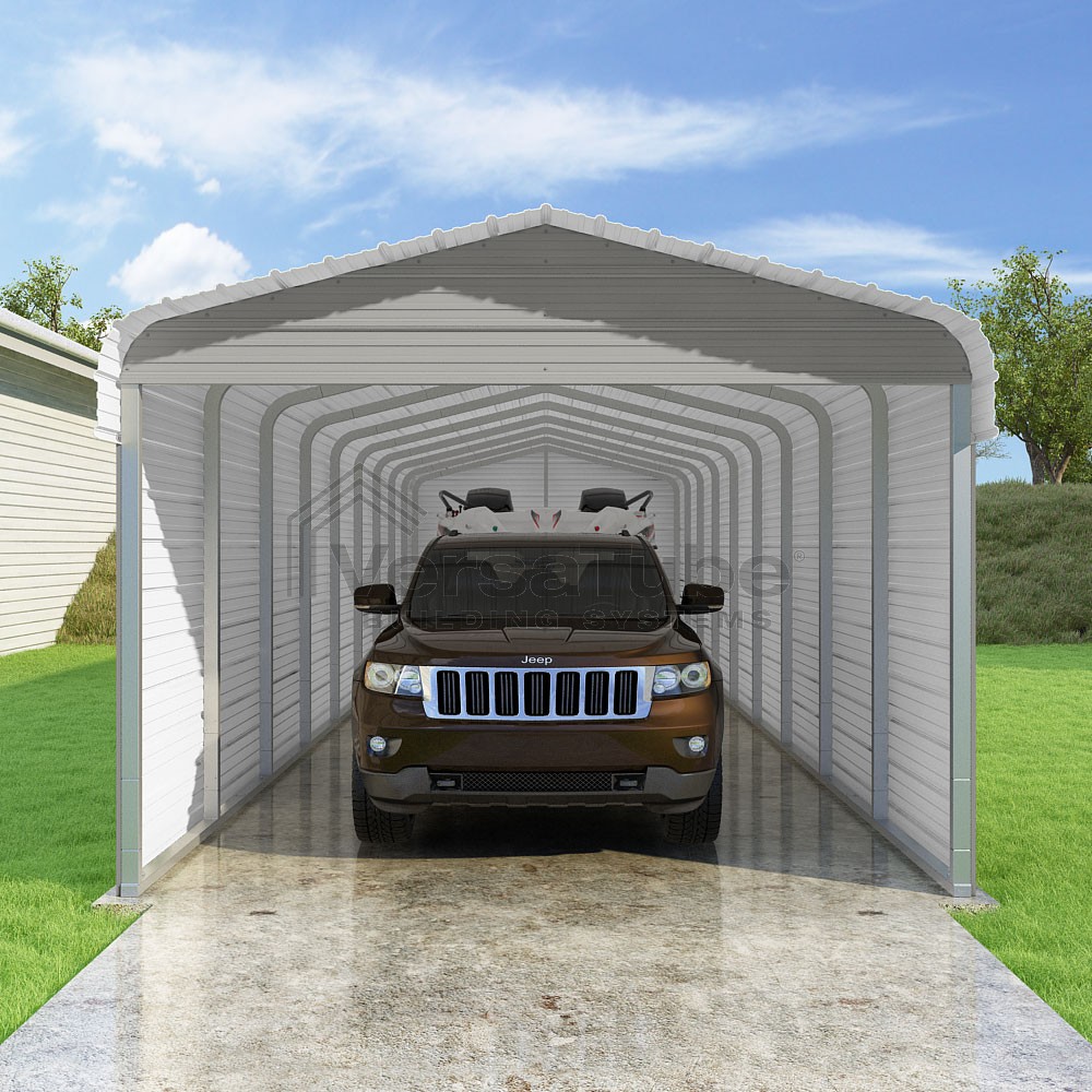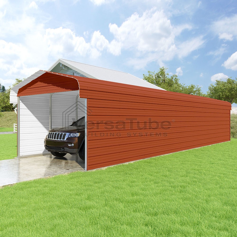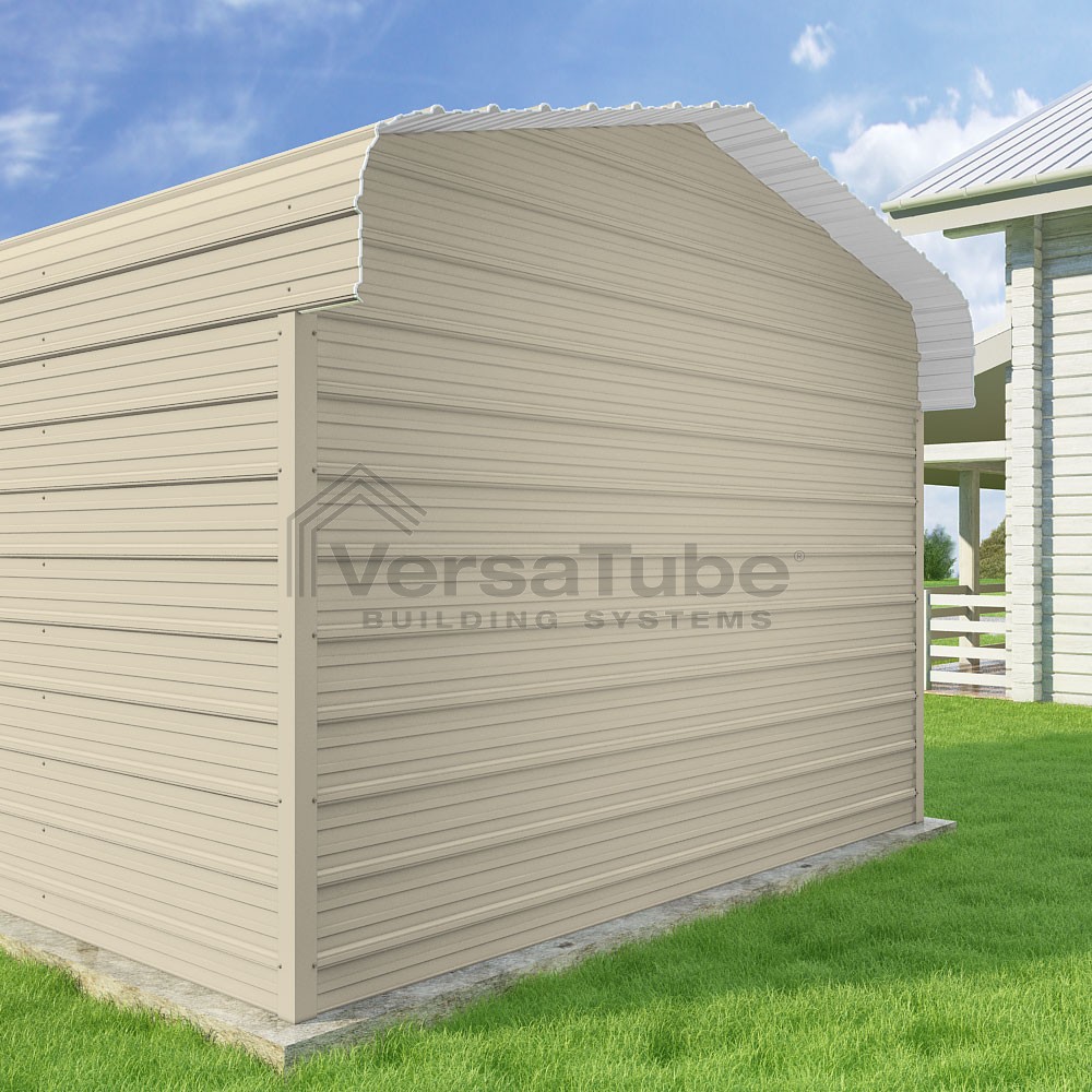 Classic Series DIY carport kit features horizontal application of sheet metal panels with the extra protection of rounded eaves.