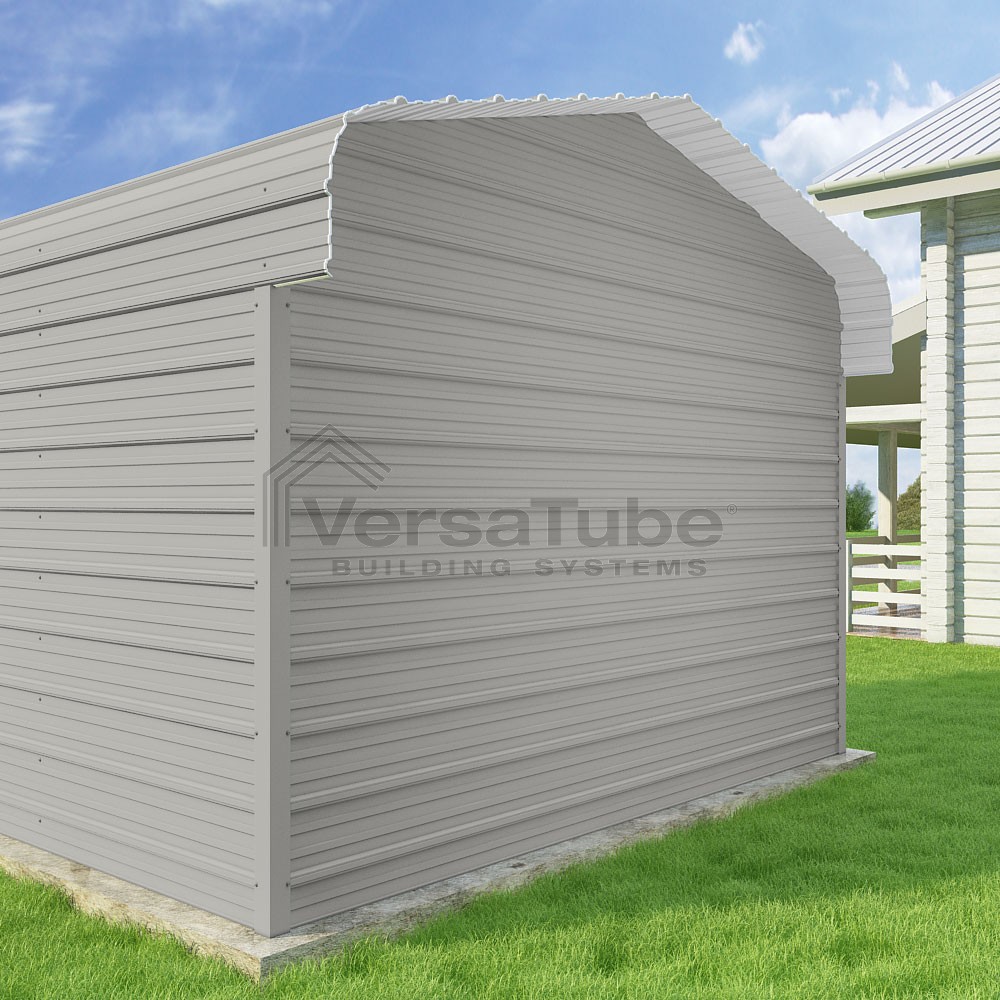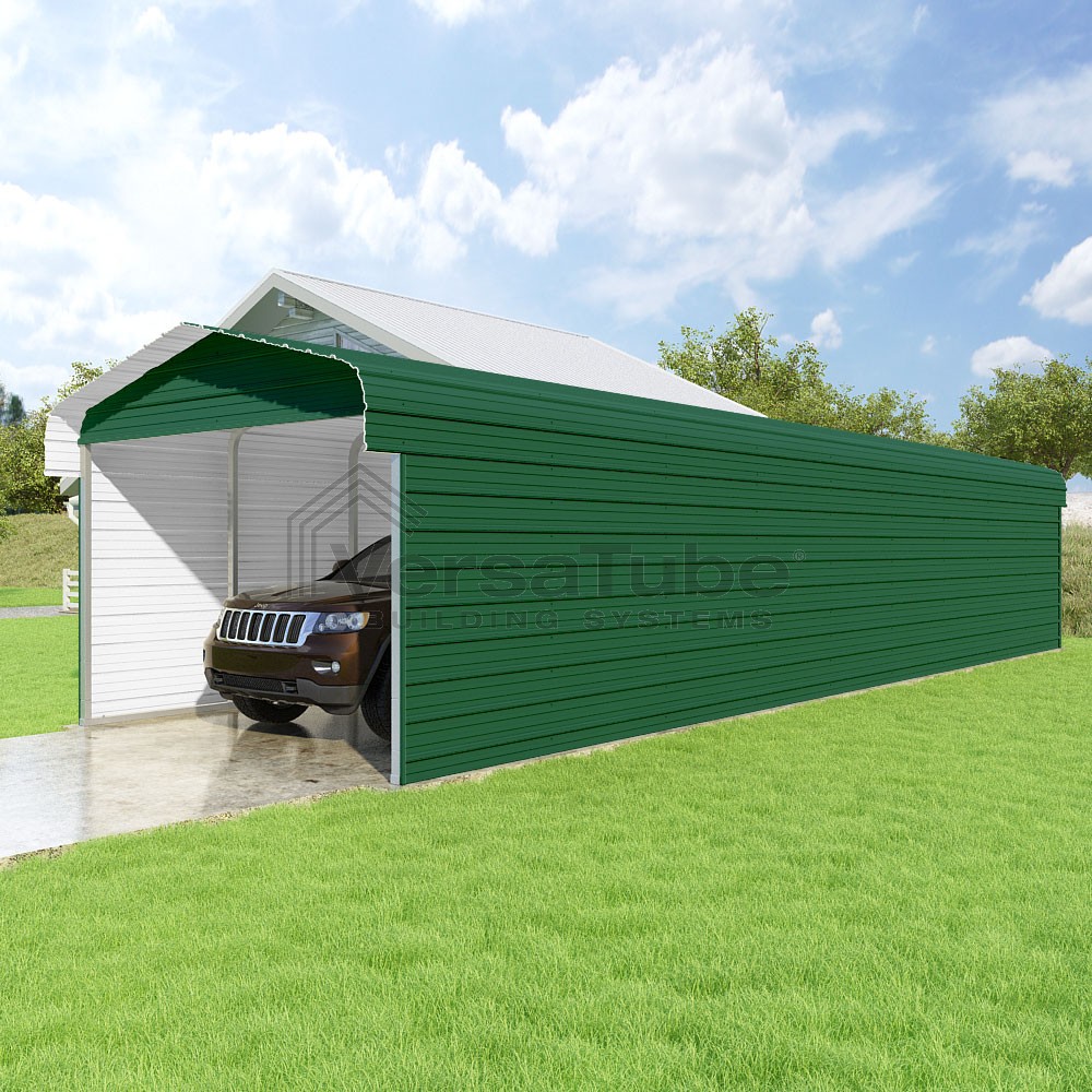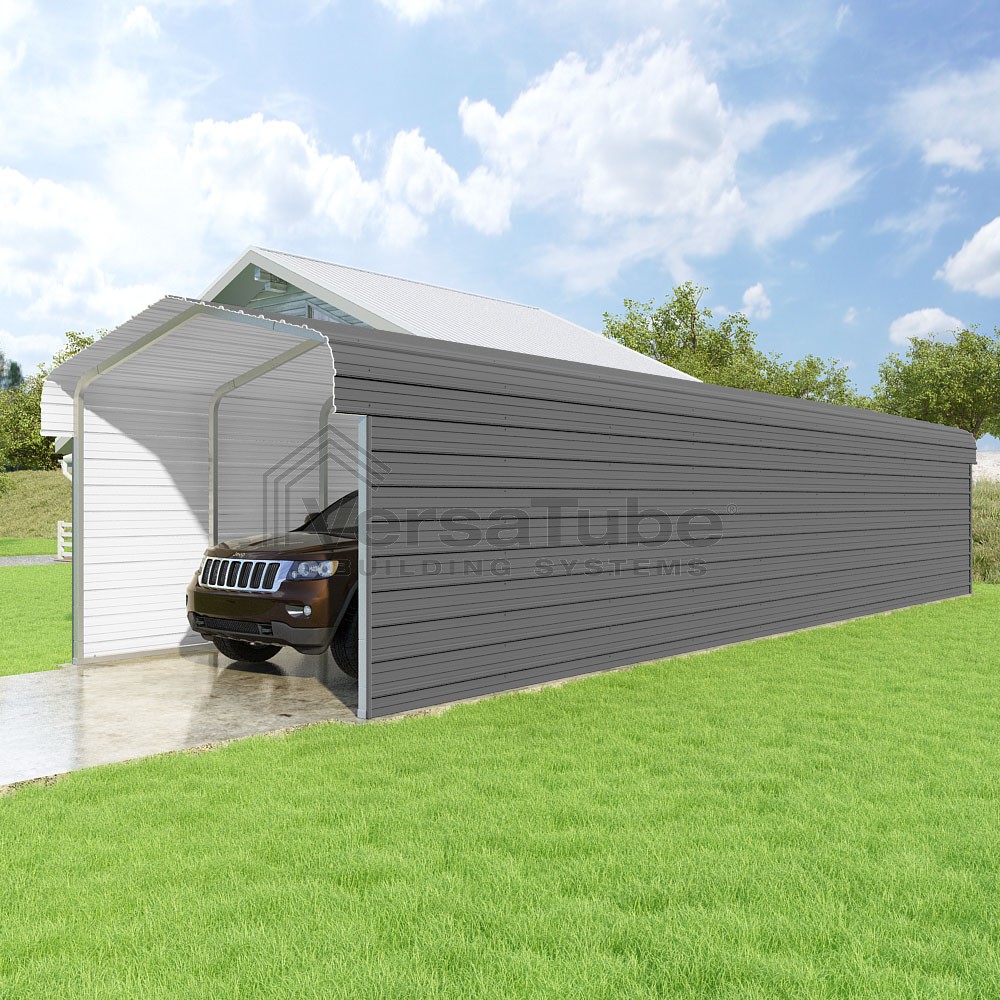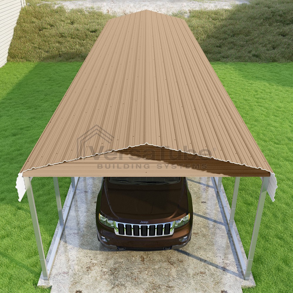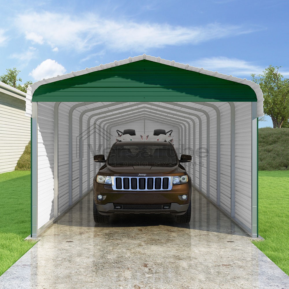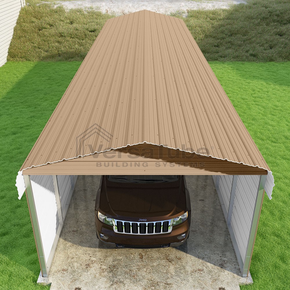 Classic Series DIY carport kit features horizontal application of sheet metal panels with the extra protection of rounded eaves.