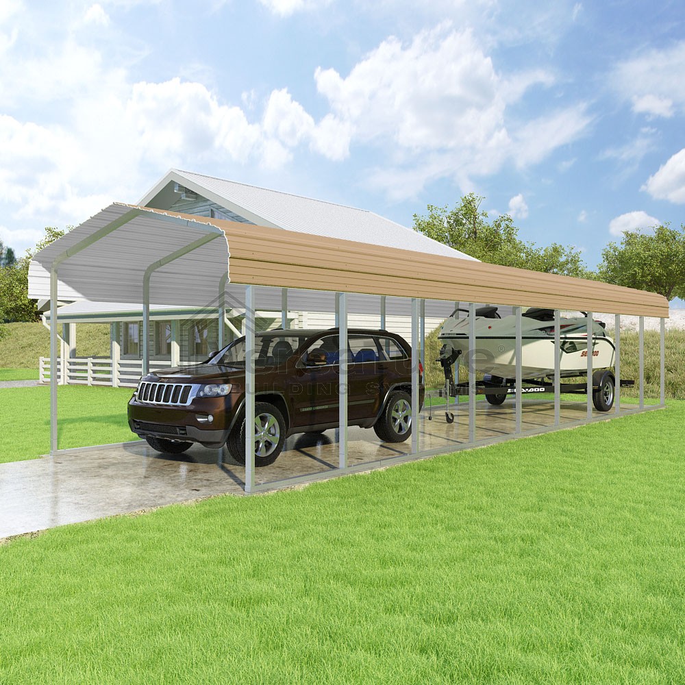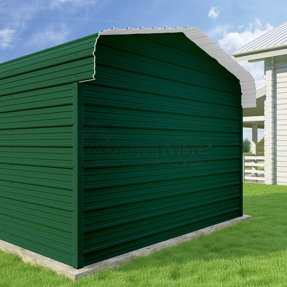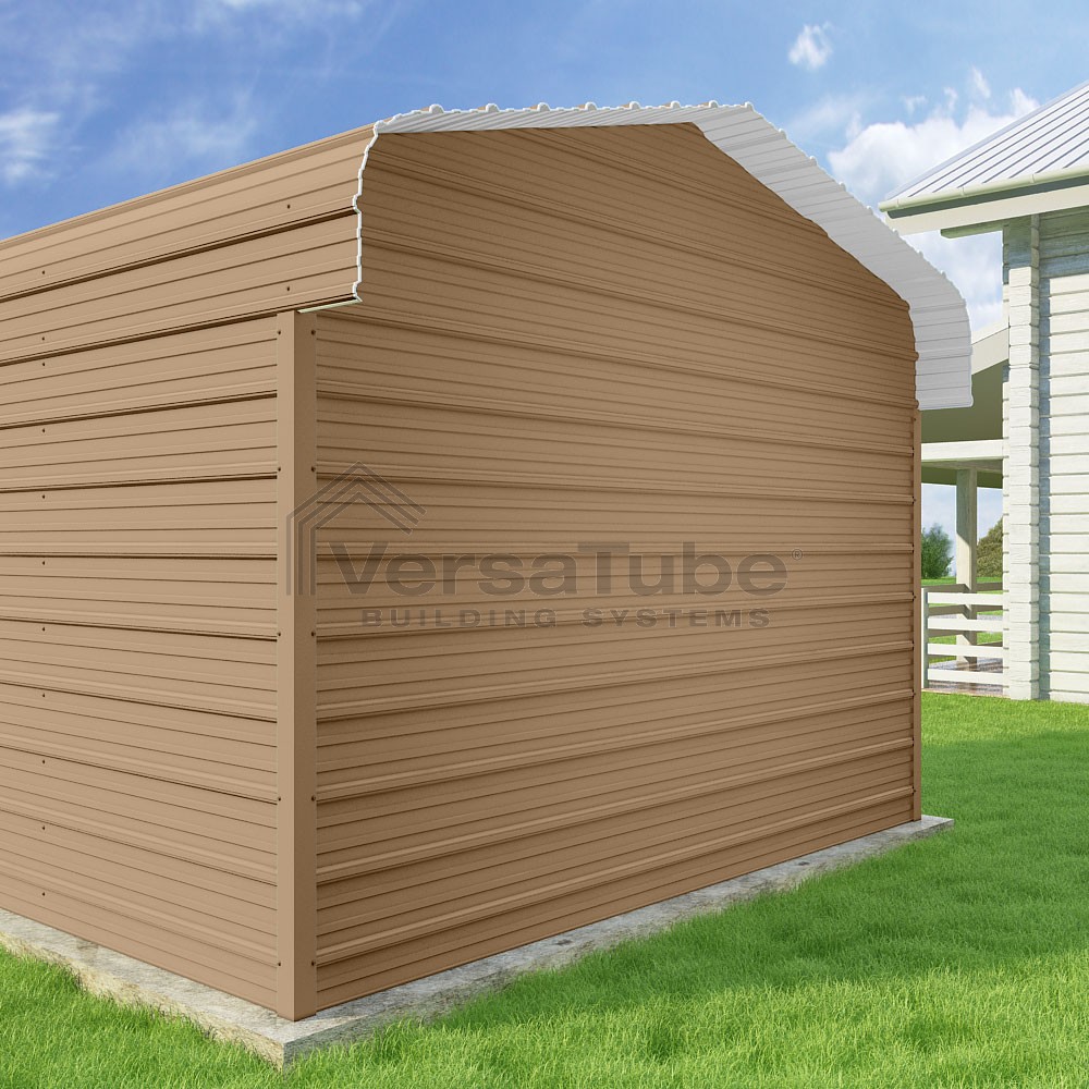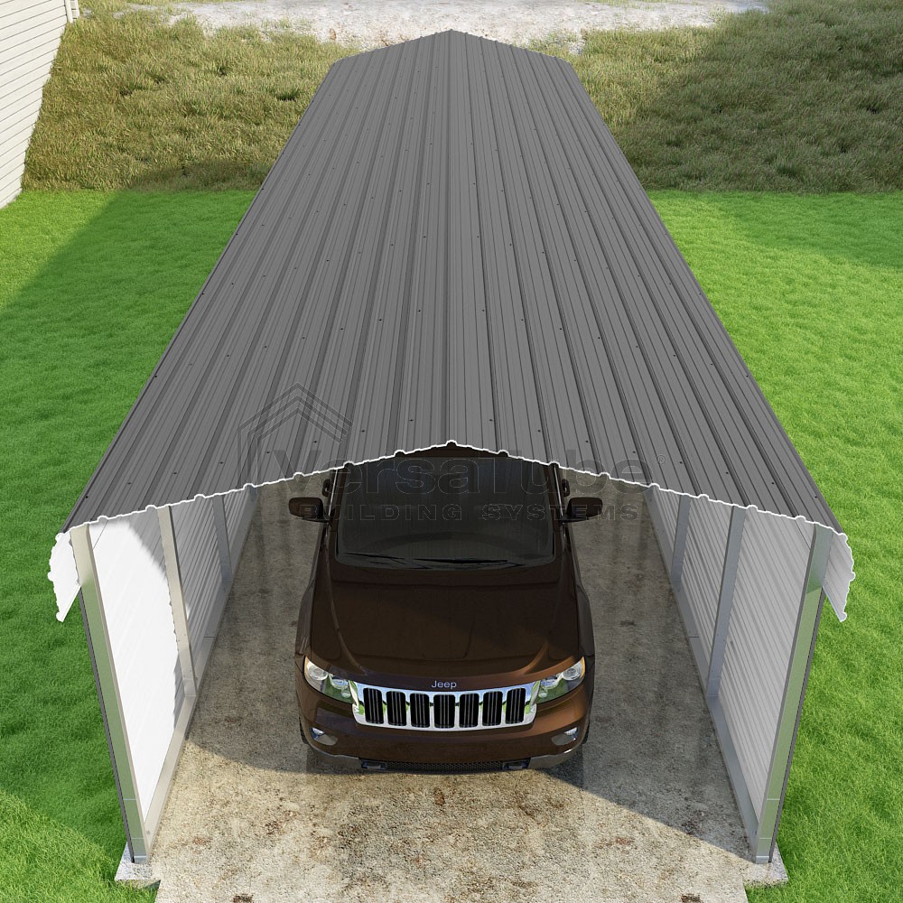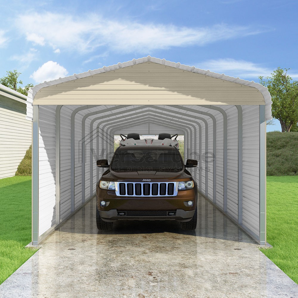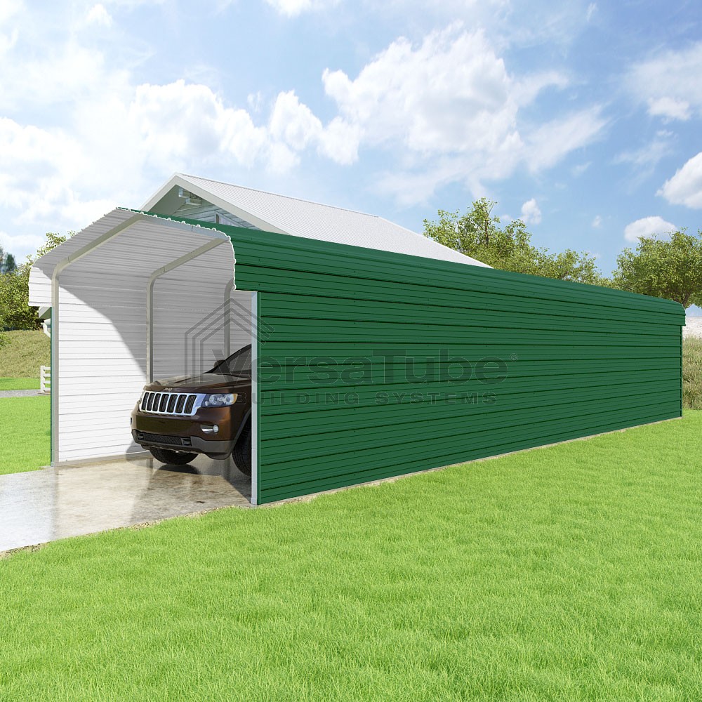 Classic Series DIY carport kit features horizontal application of sheet metal panels with the extra protection of rounded eaves.