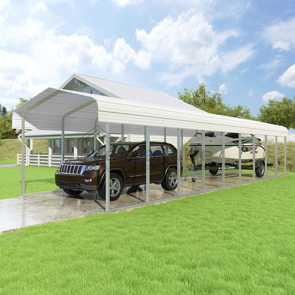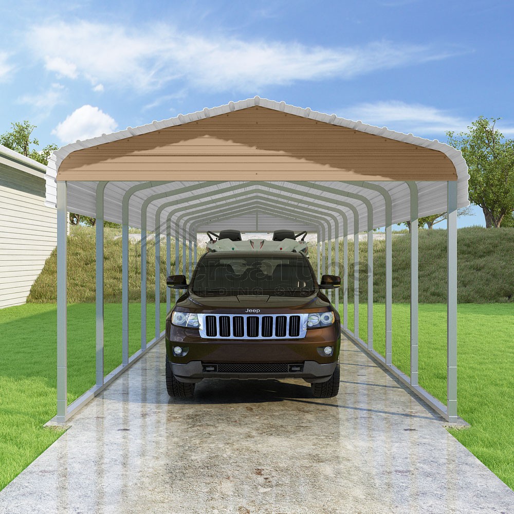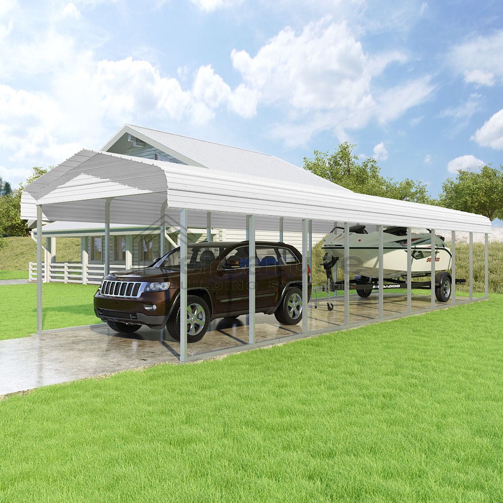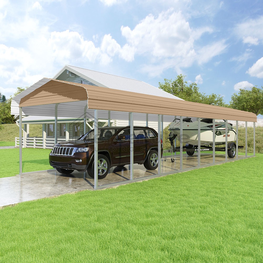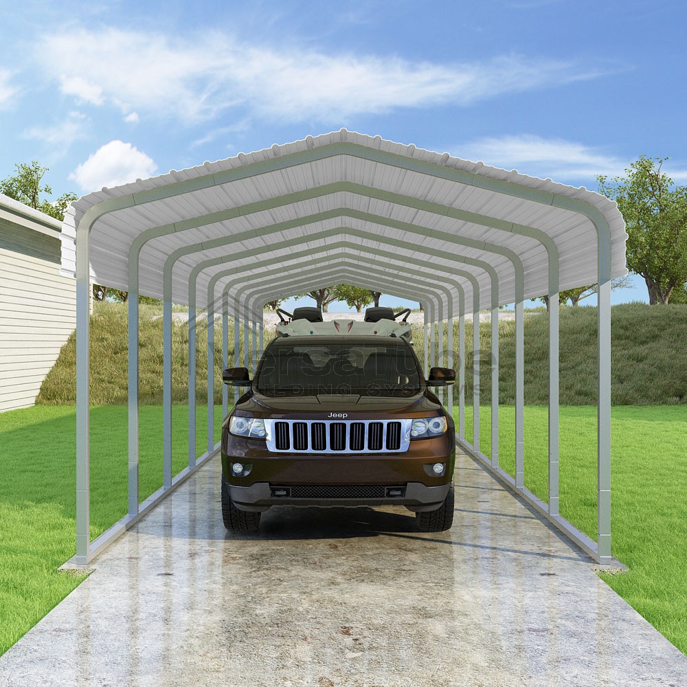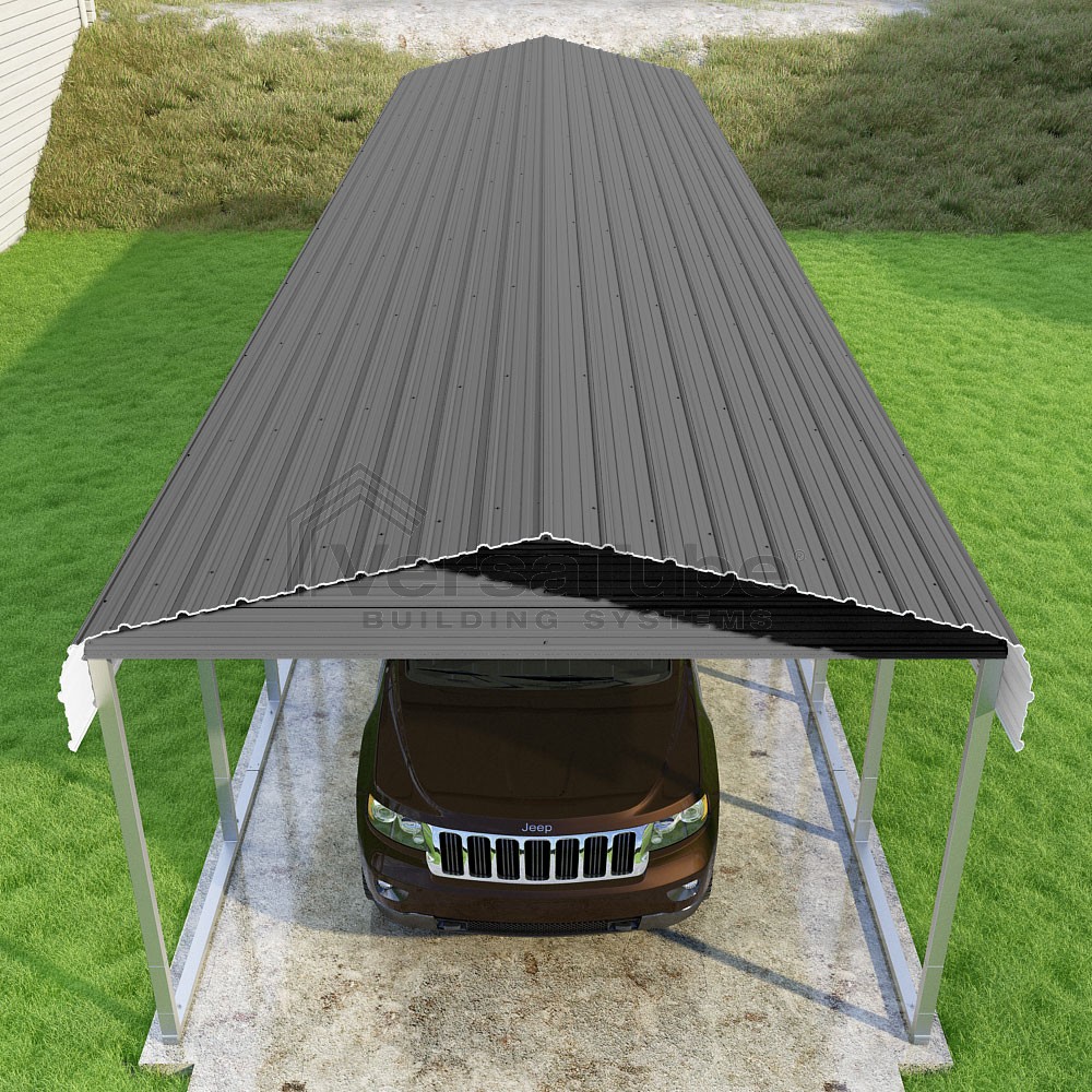 Classic Series DIY carport kit features horizontal application of sheet metal panels with the extra protection of rounded eaves.