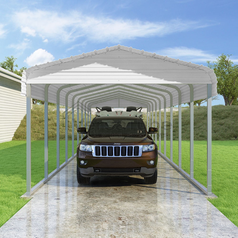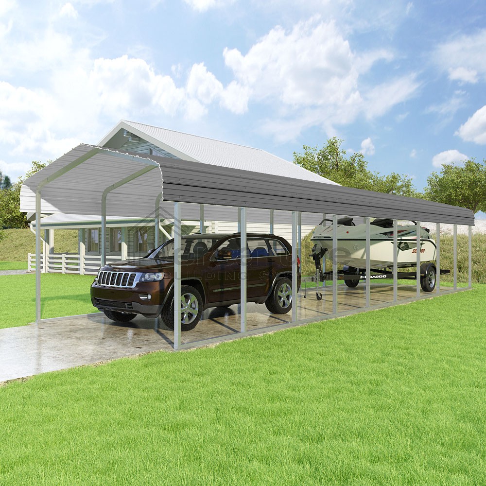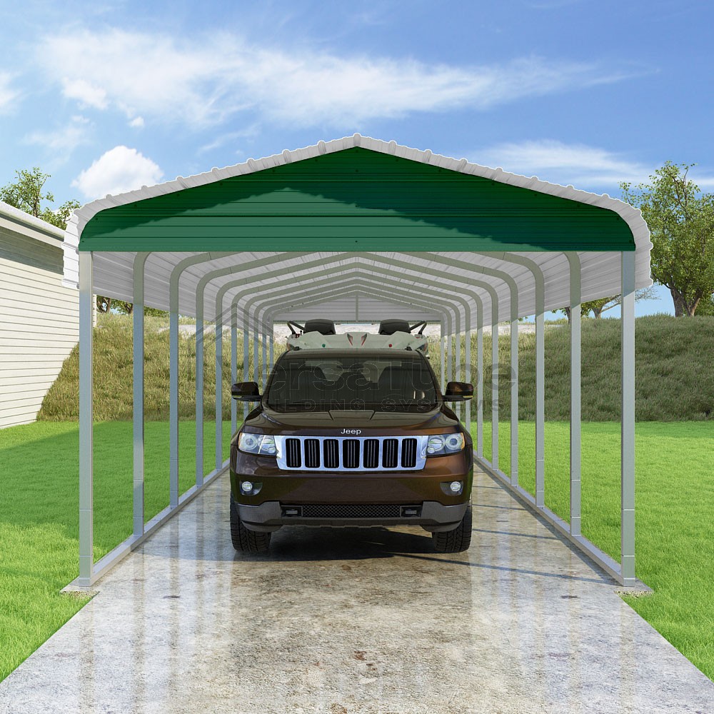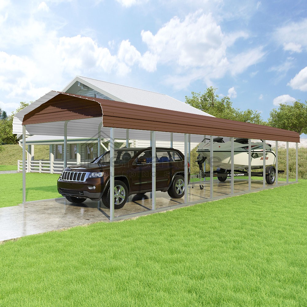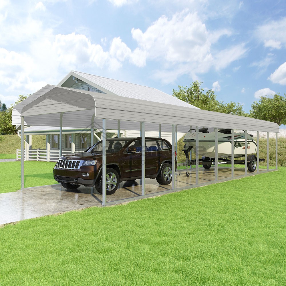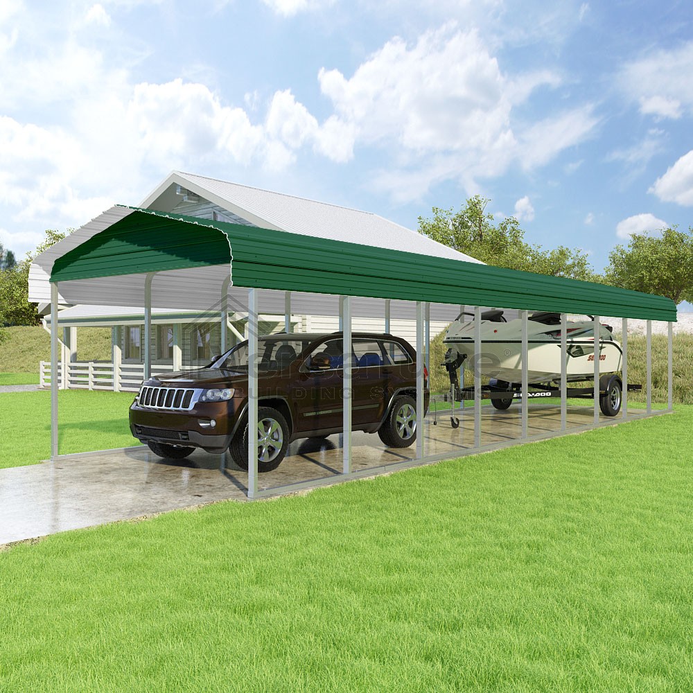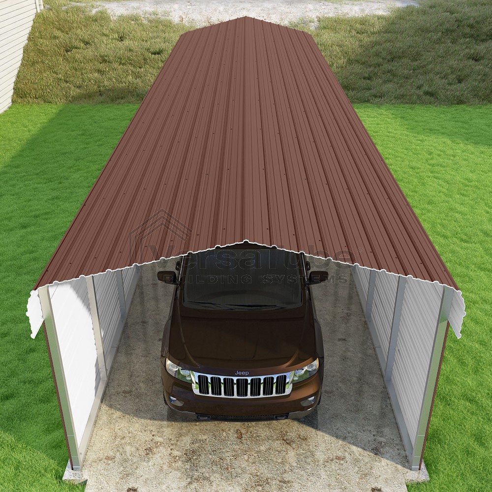 Classic Series DIY carport kit features horizontal application of sheet metal panels with the extra protection of rounded eaves.