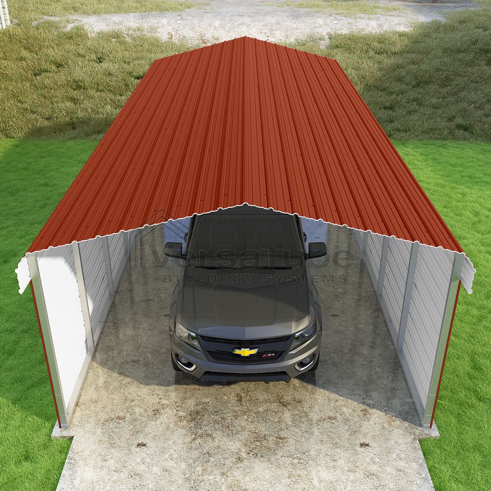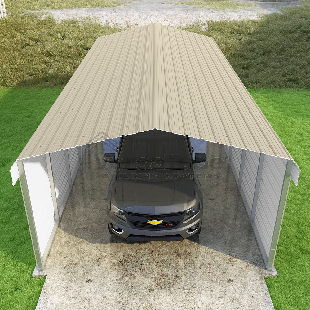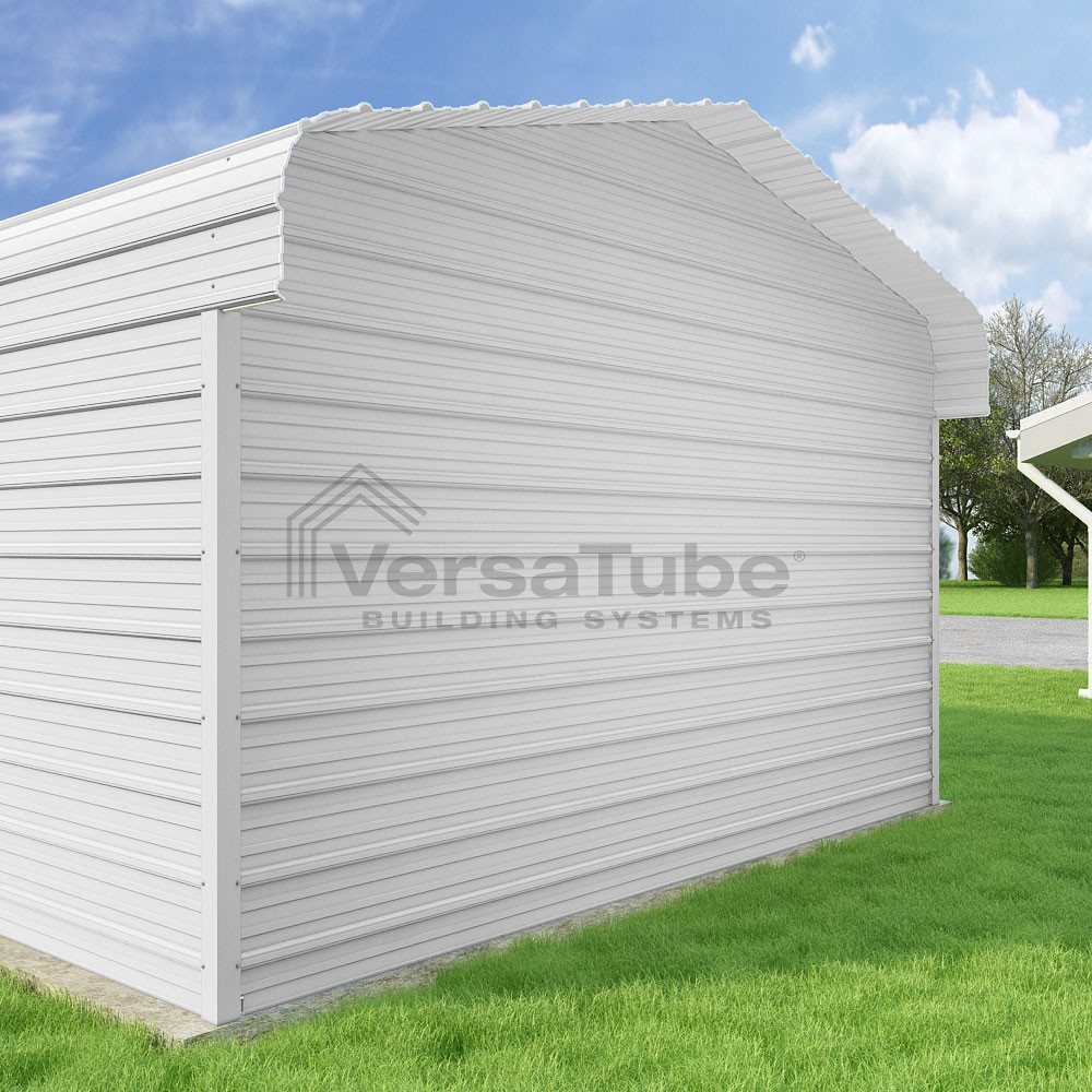 Classic Series DIY carport kit features horizontal application of sheet metal panels with the extra protection of rounded eaves.
