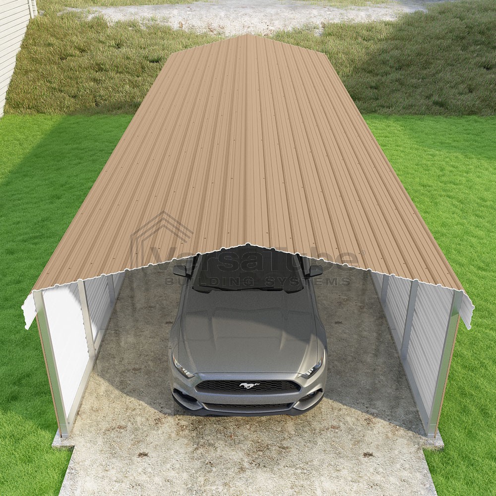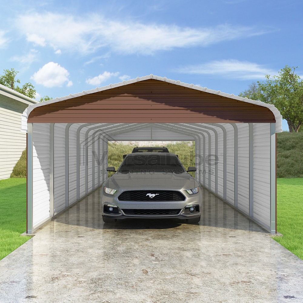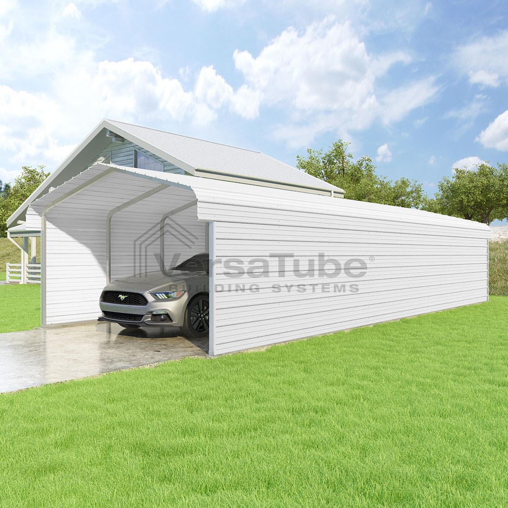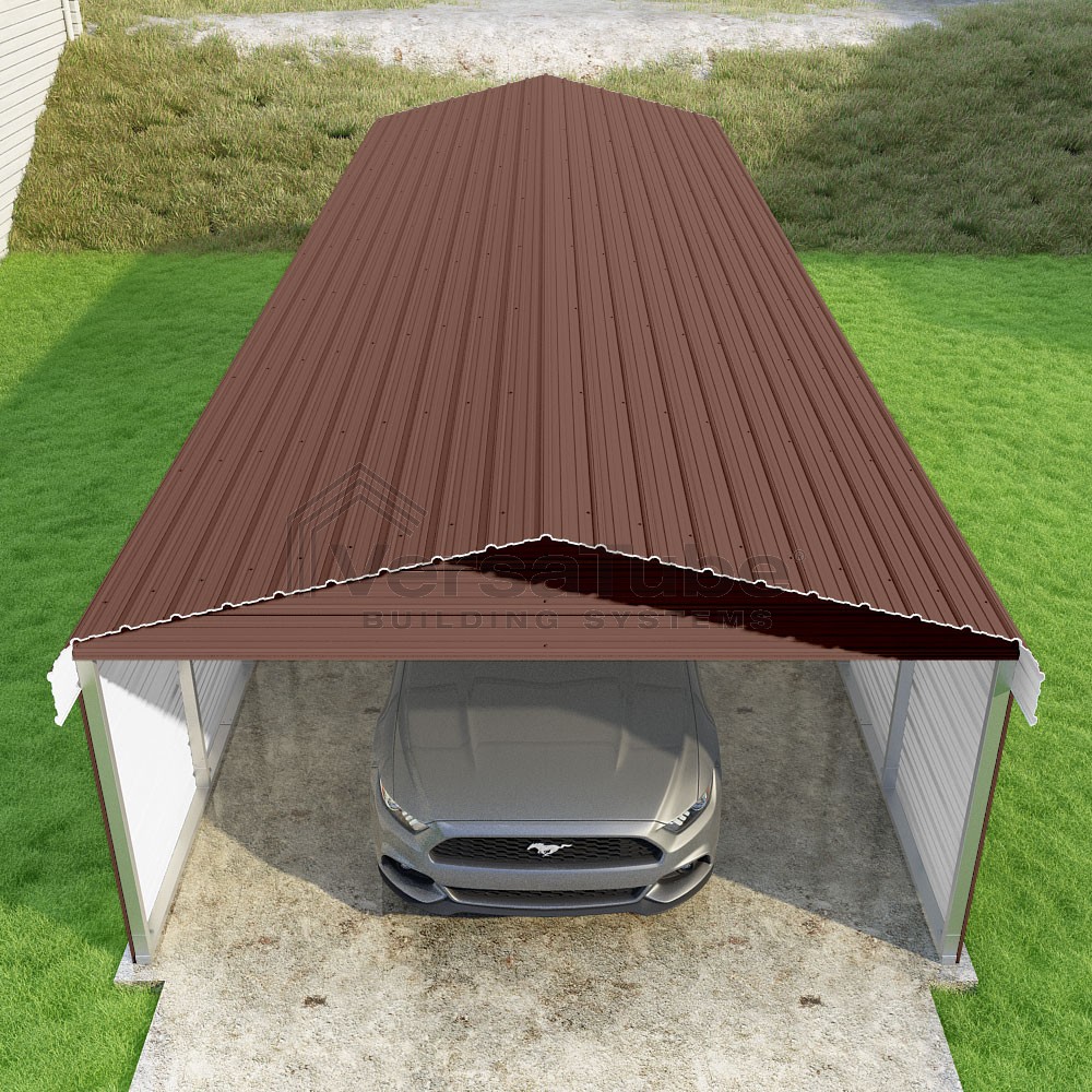 Classic Series DIY carport kit features horizontal application of sheet metal panels with the extra protection of rounded eaves.