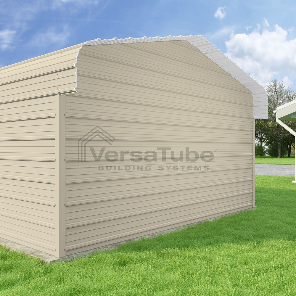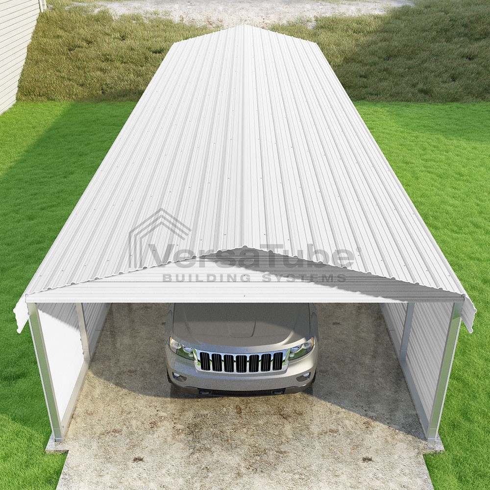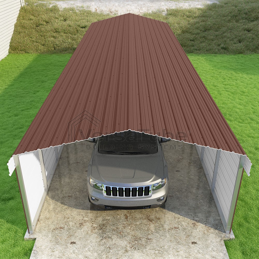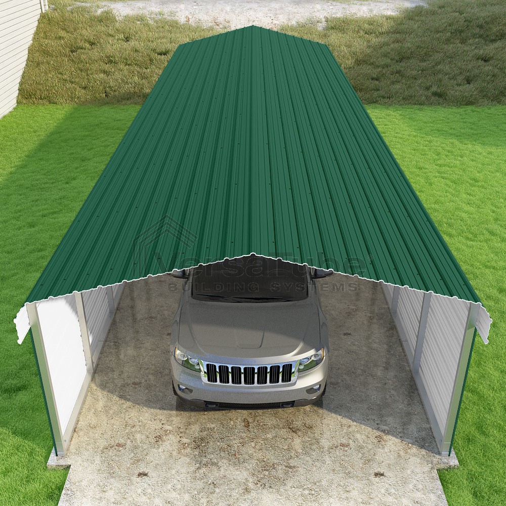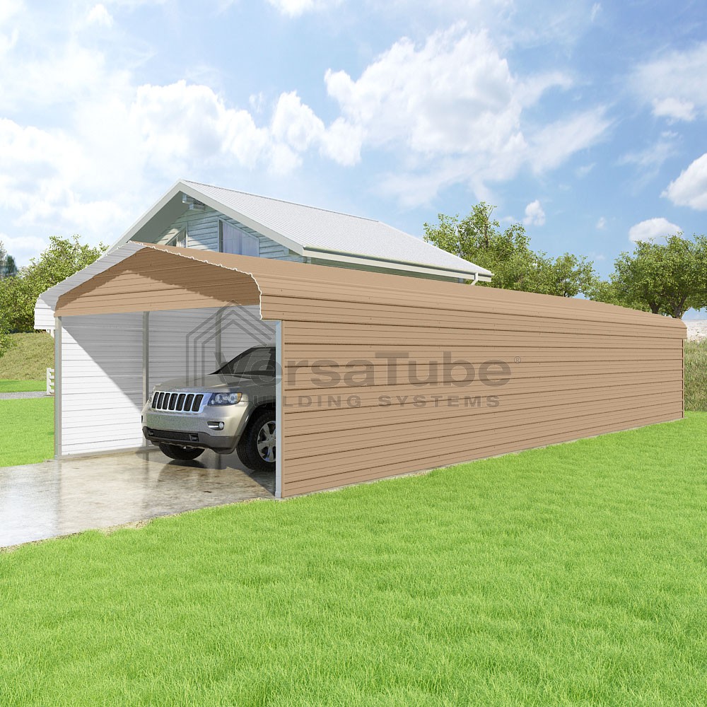 Classic Series DIY carport kit features horizontal application of sheet metal panels with the extra protection of rounded eaves.