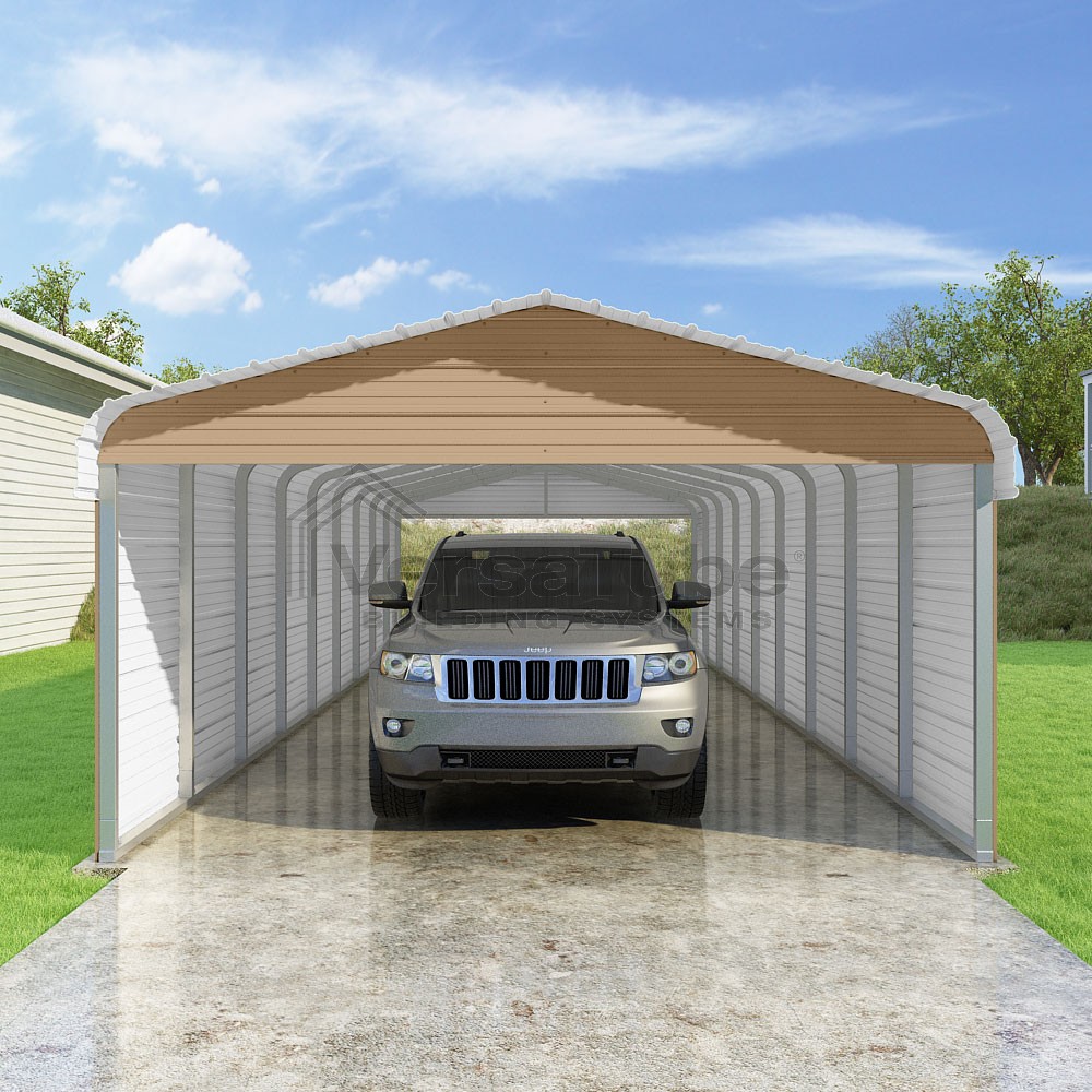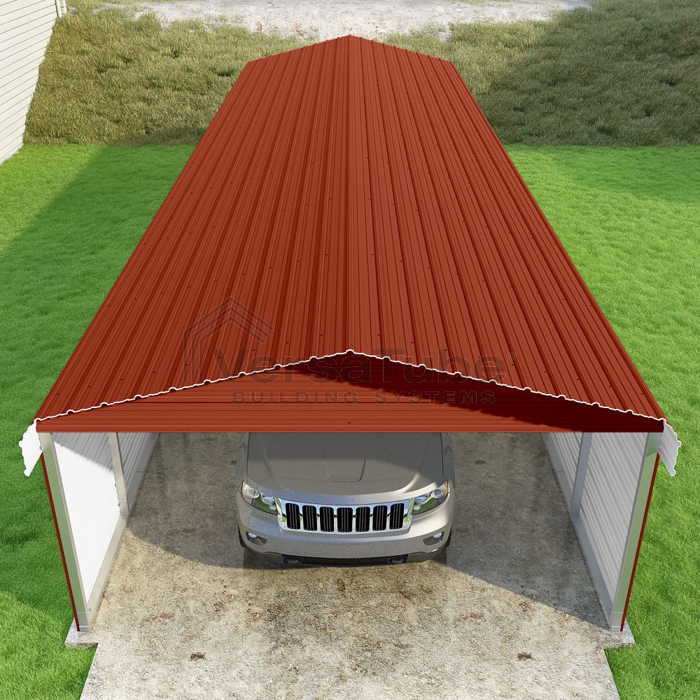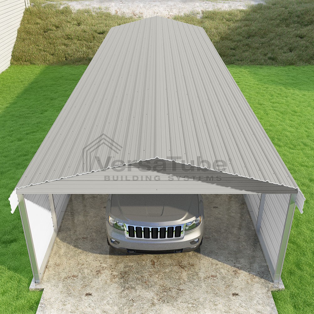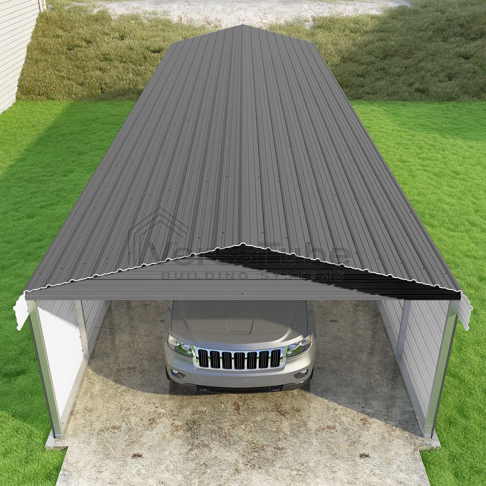 Classic Series DIY carport kit features horizontal application of sheet metal panels with the extra protection of rounded eaves.