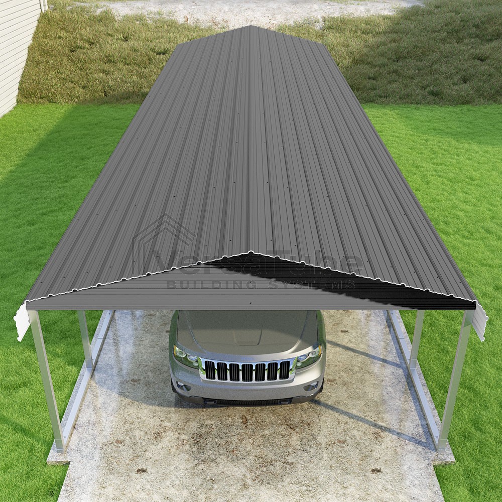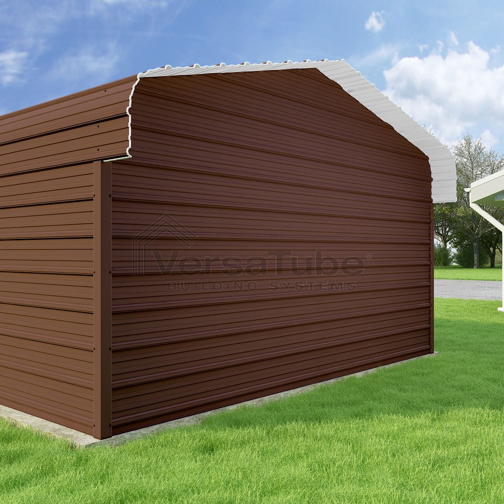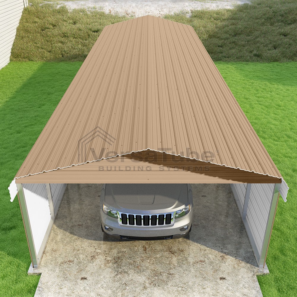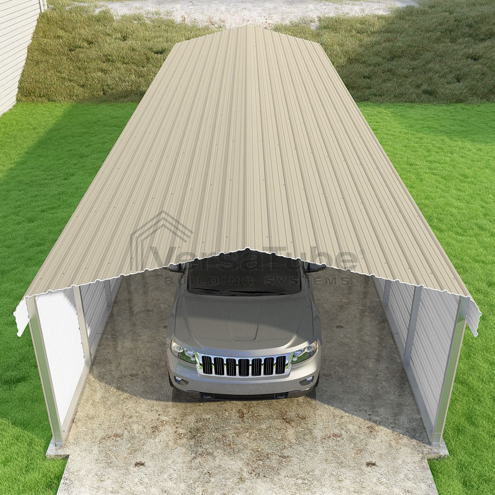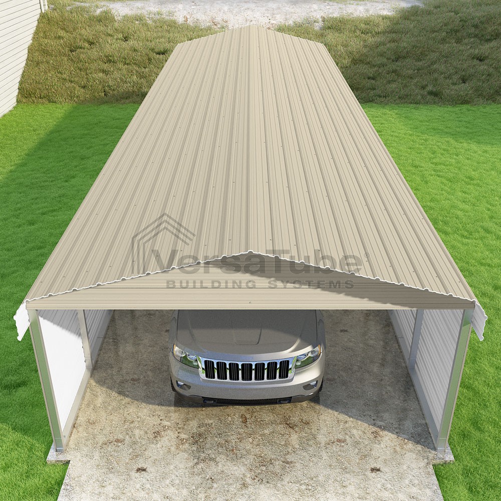 Classic Series DIY carport kit features horizontal application of sheet metal panels with the extra protection of rounded eaves.