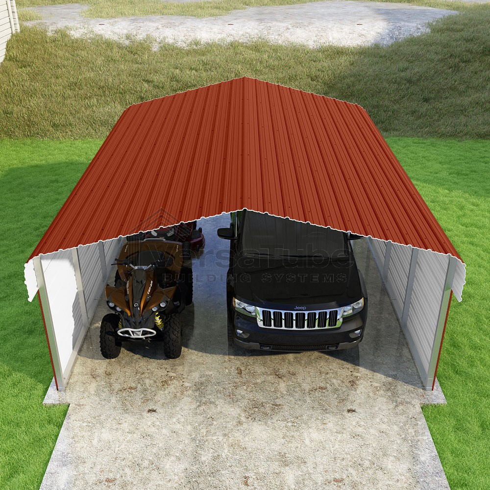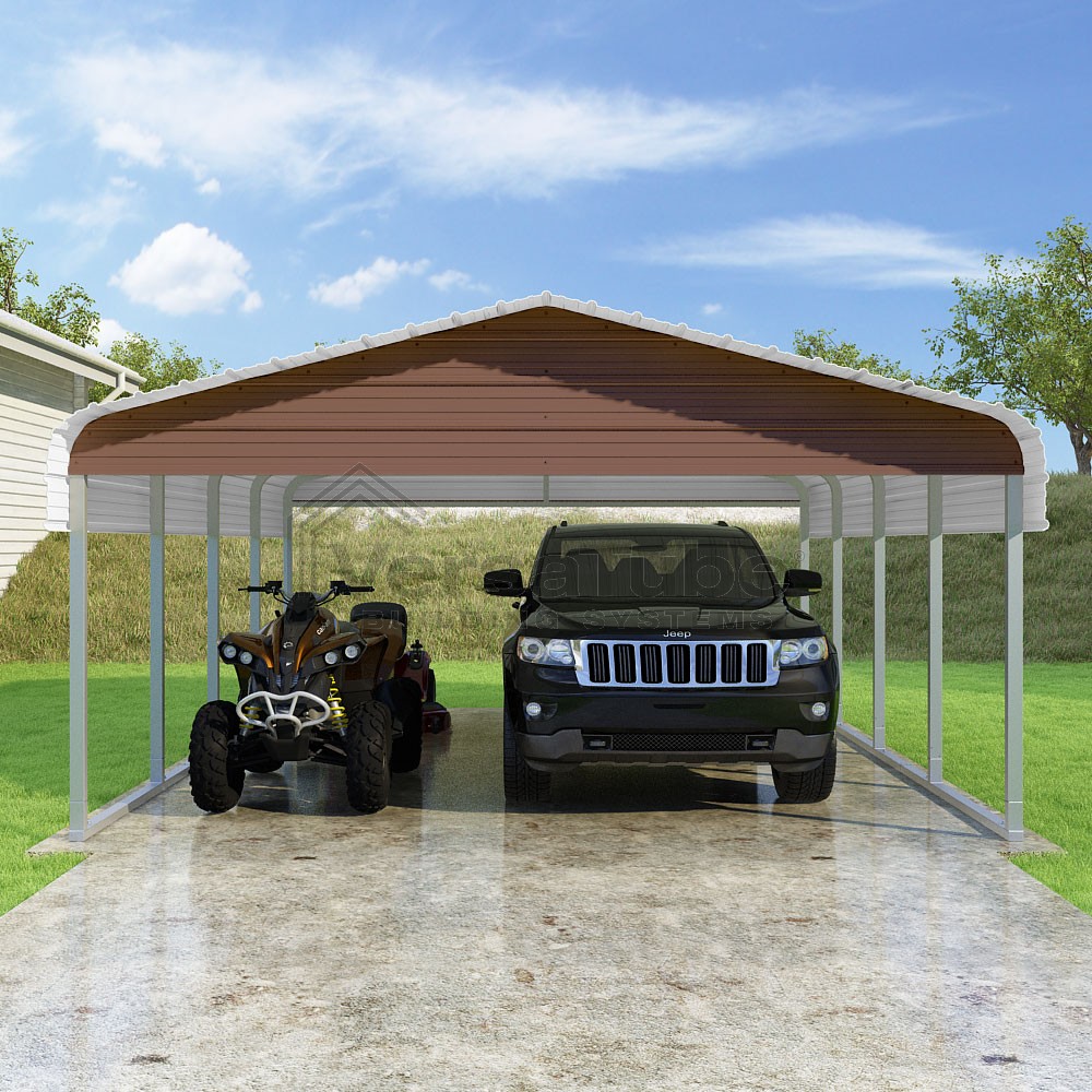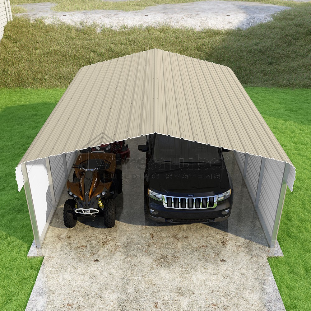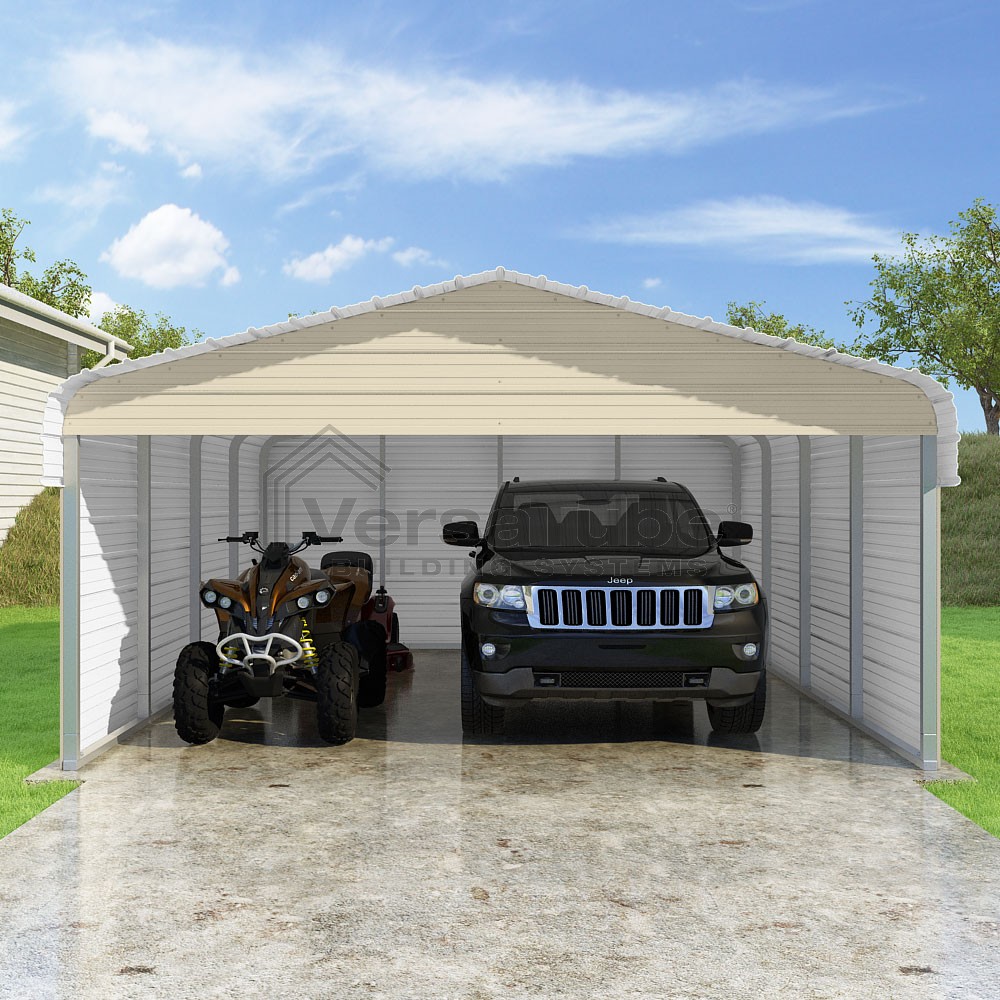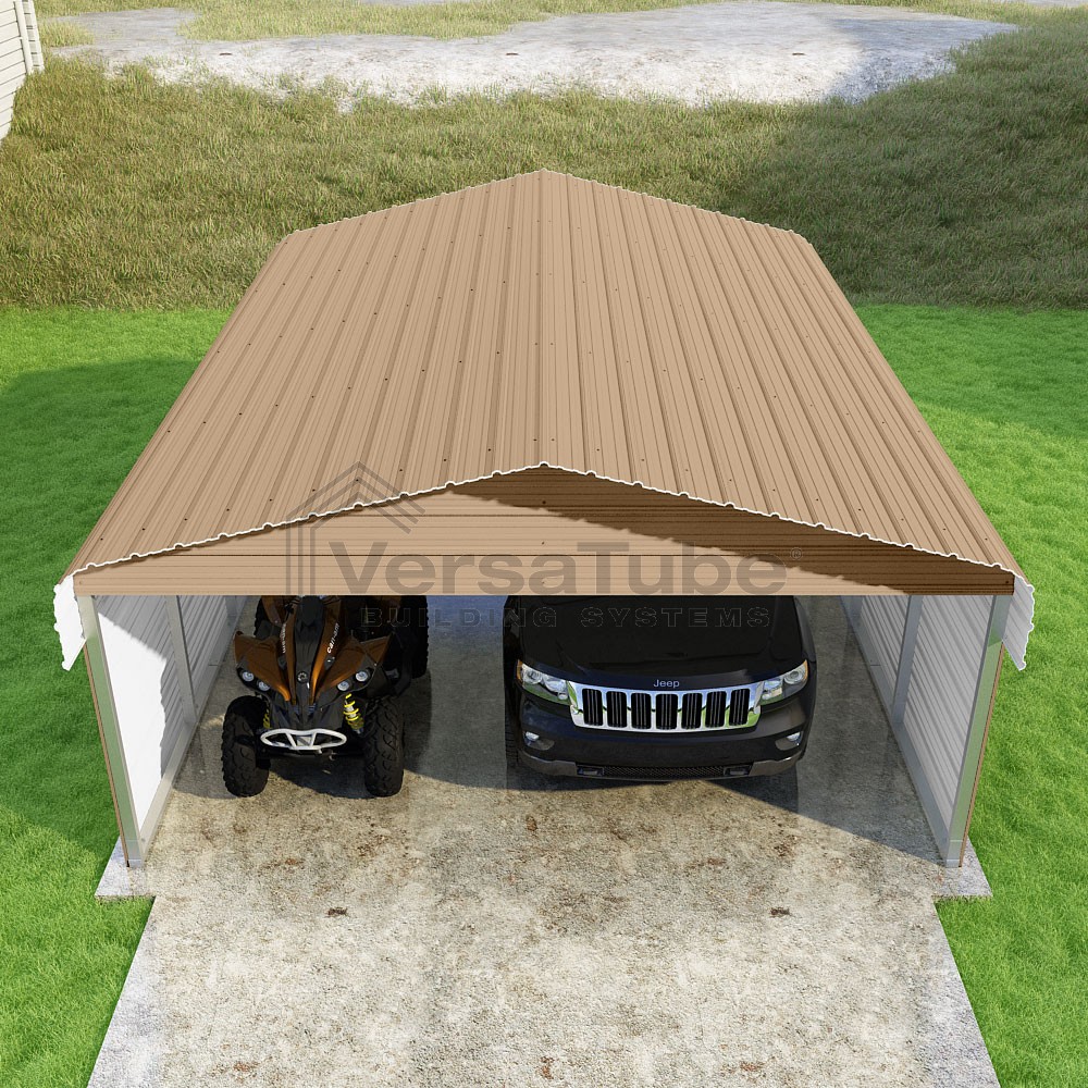 Classic Series DIY carport kit features horizontal application of sheet metal panels with the extra protection of rounded eaves.