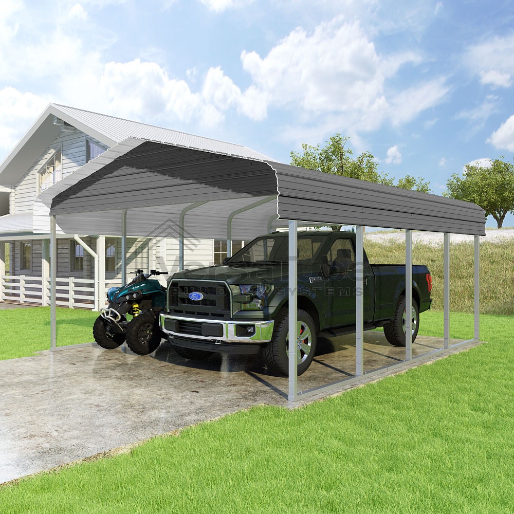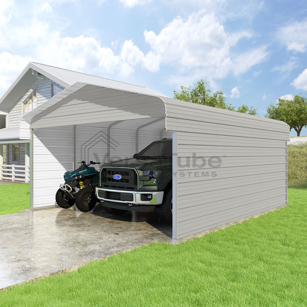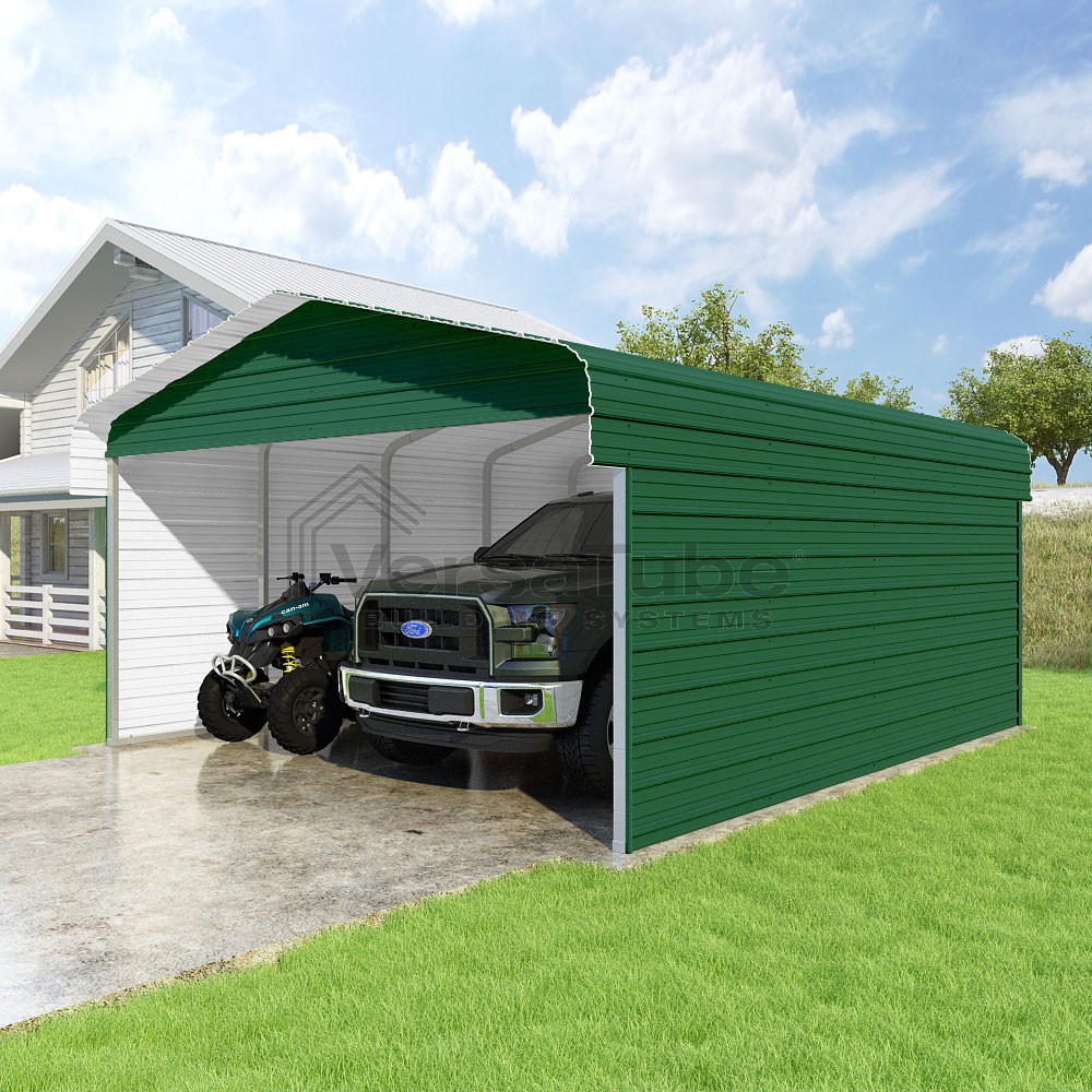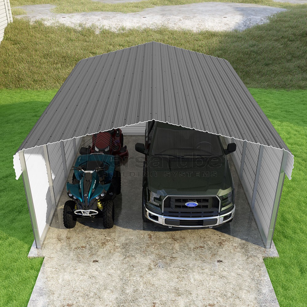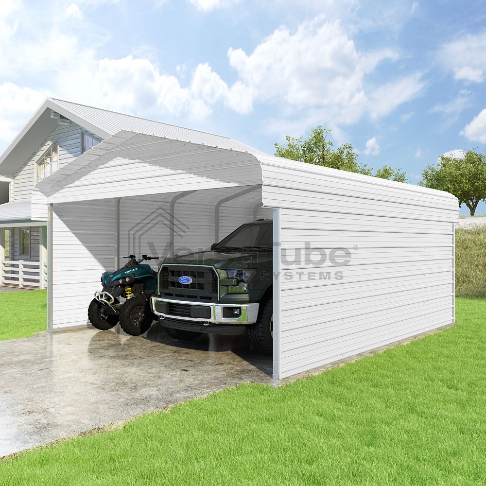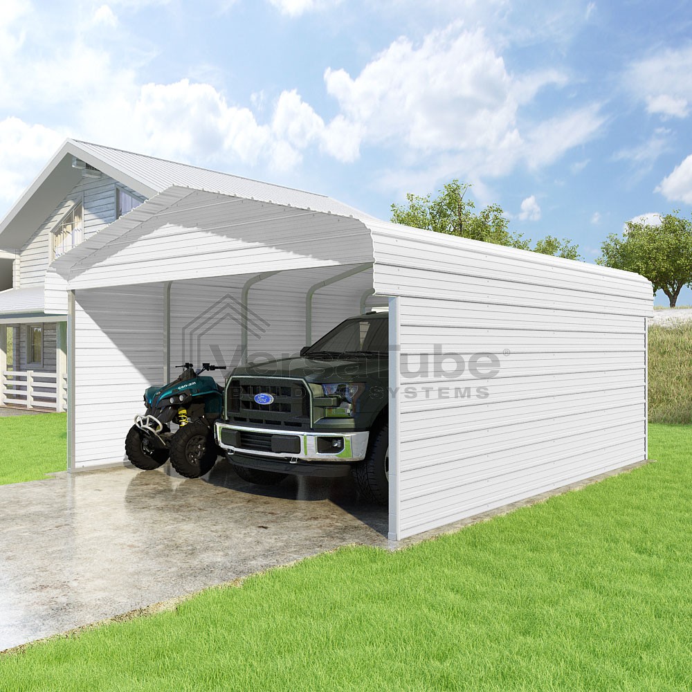 Classic Series DIY carport kit features horizontal application of sheet metal panels with the extra protection of rounded eaves.
