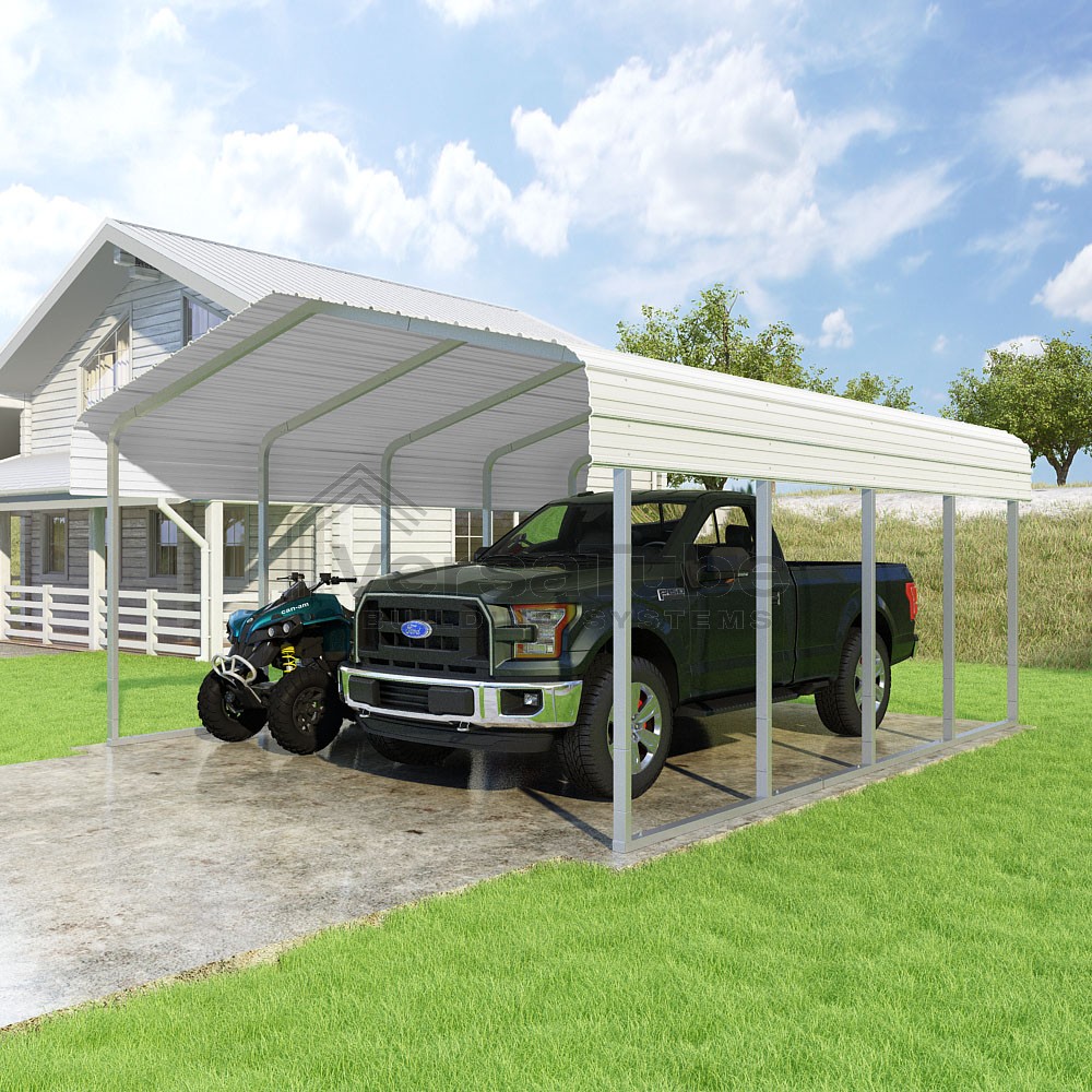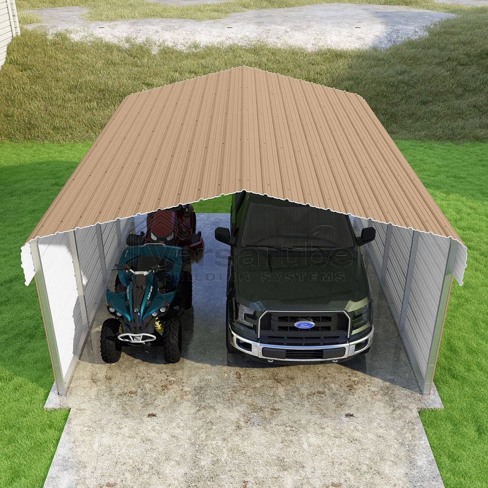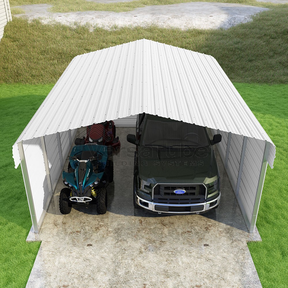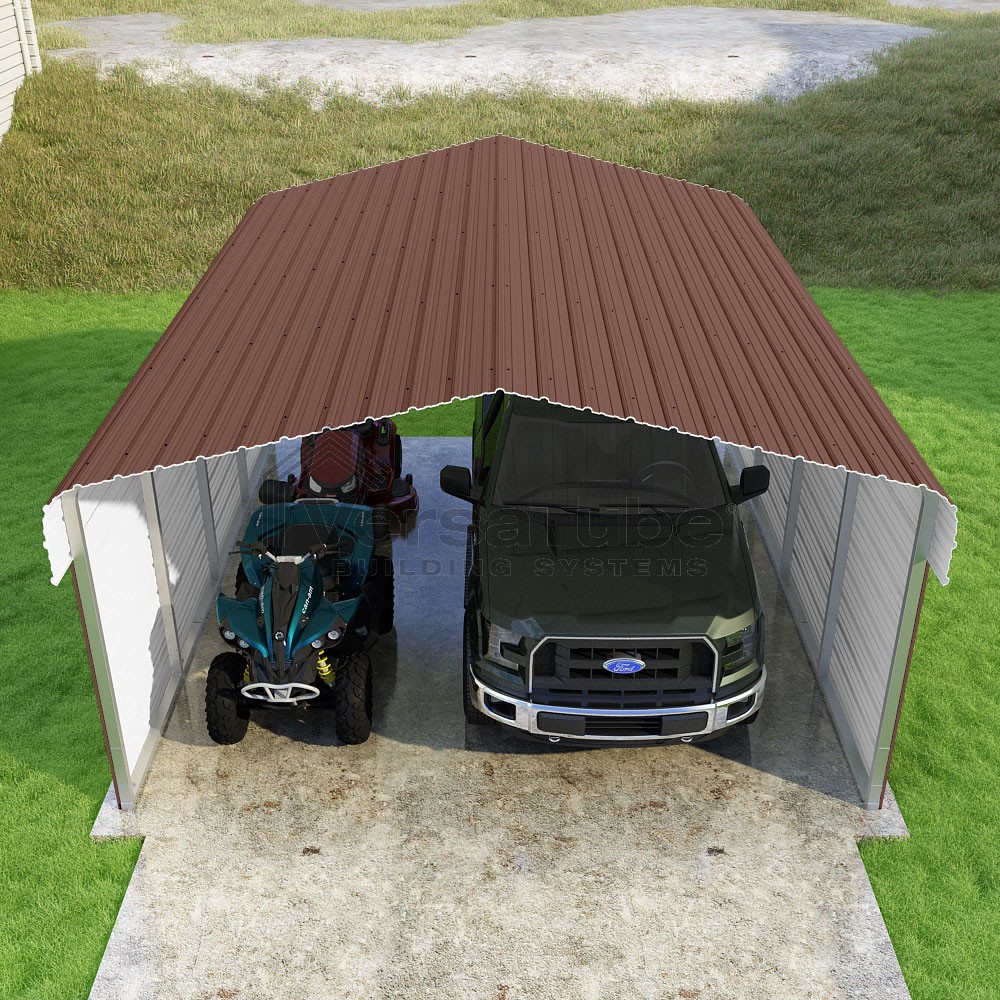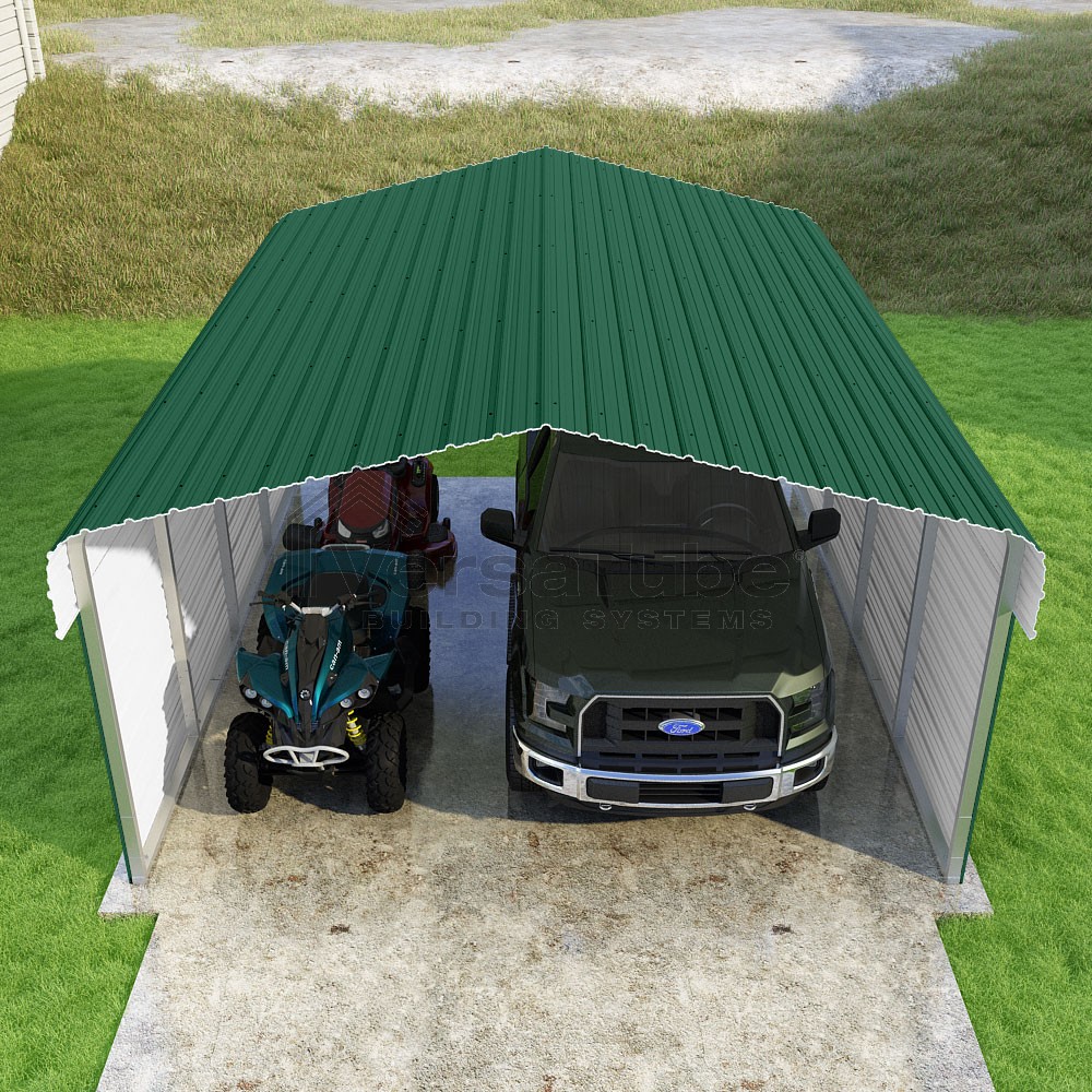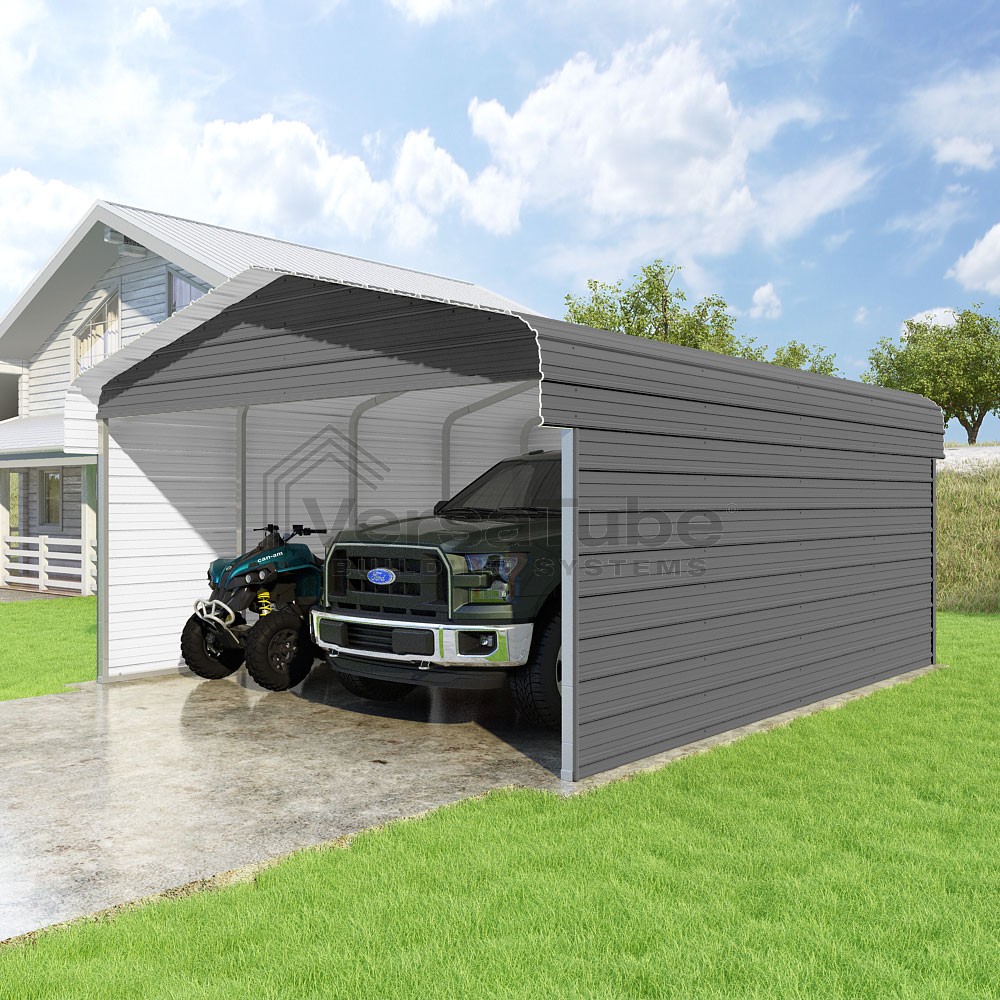 Classic Series DIY carport kit features horizontal application of sheet metal panels with the extra protection of rounded eaves.