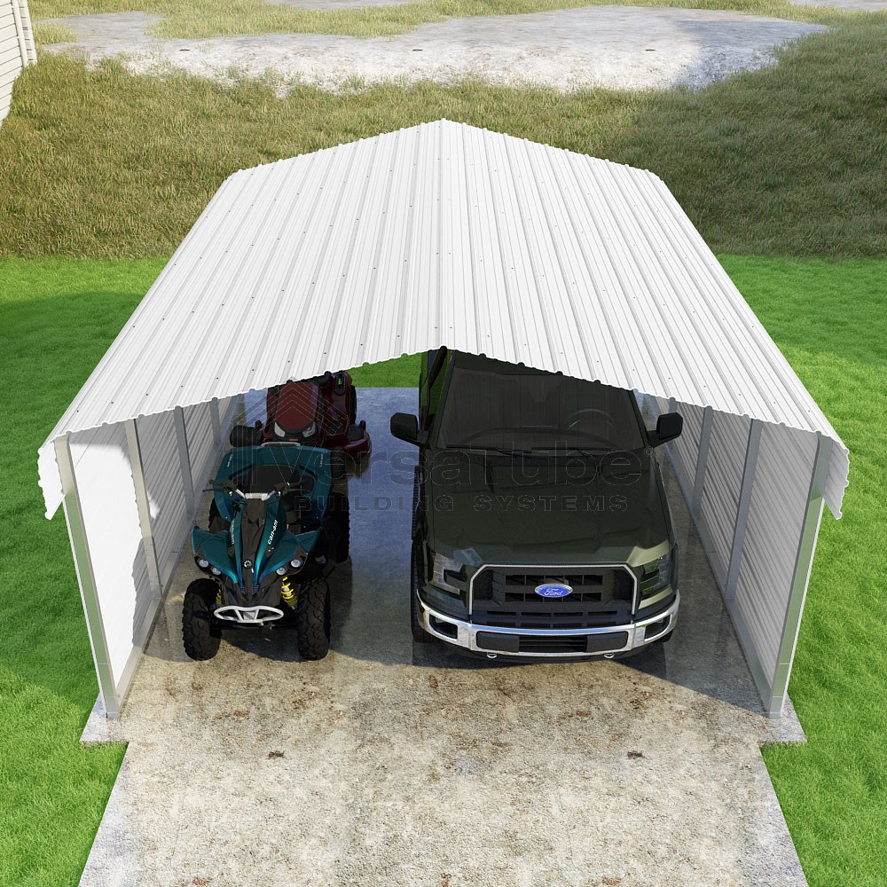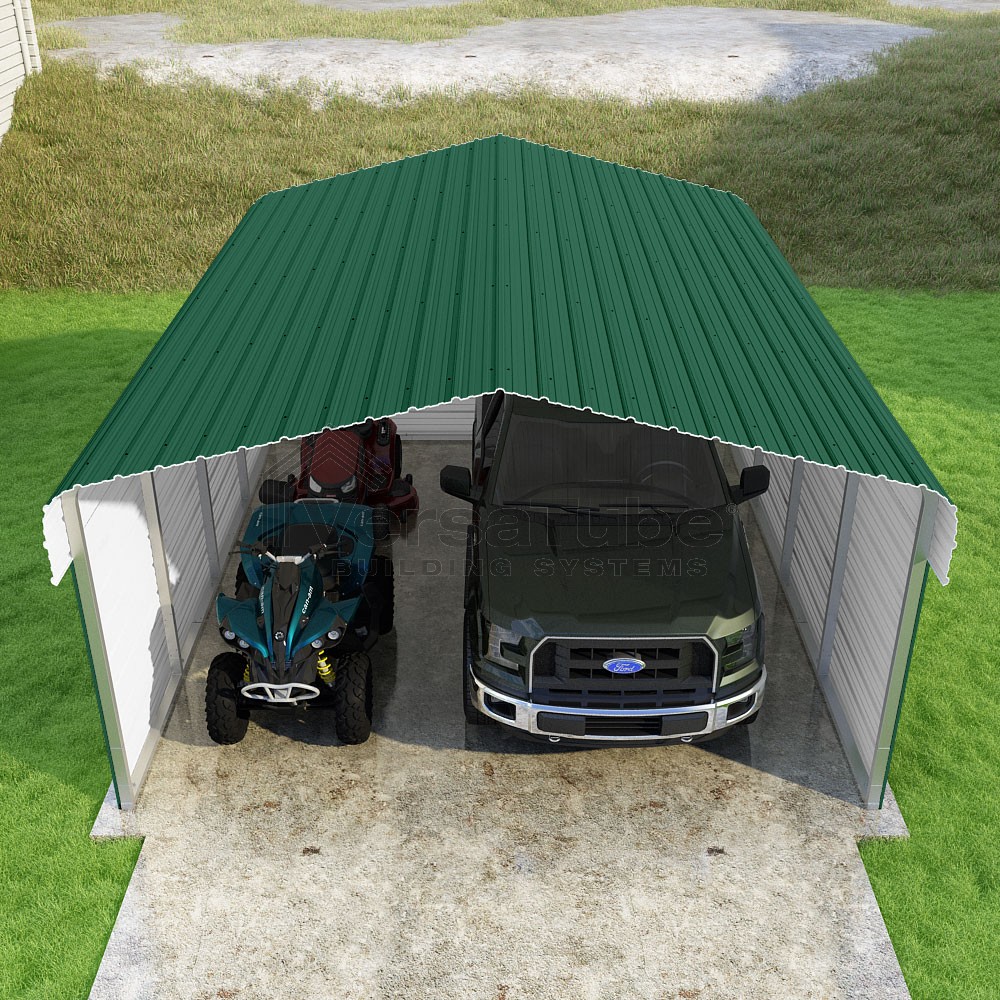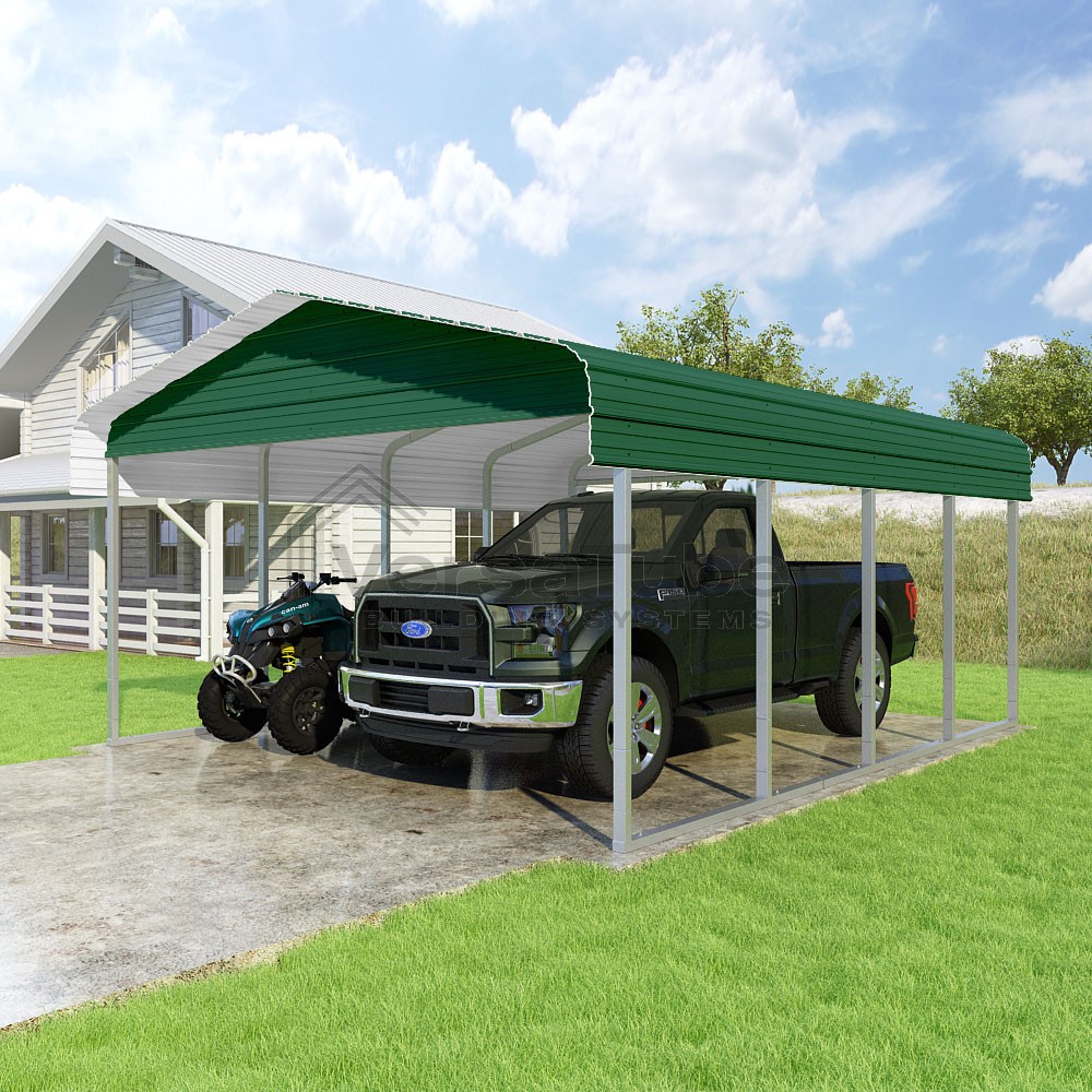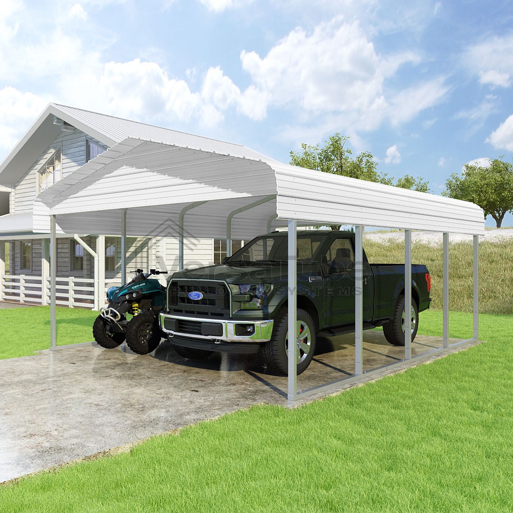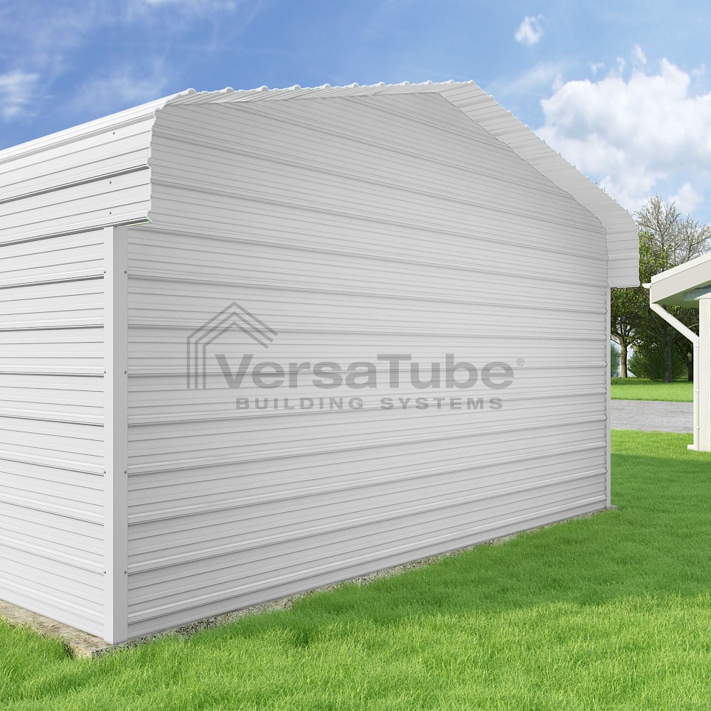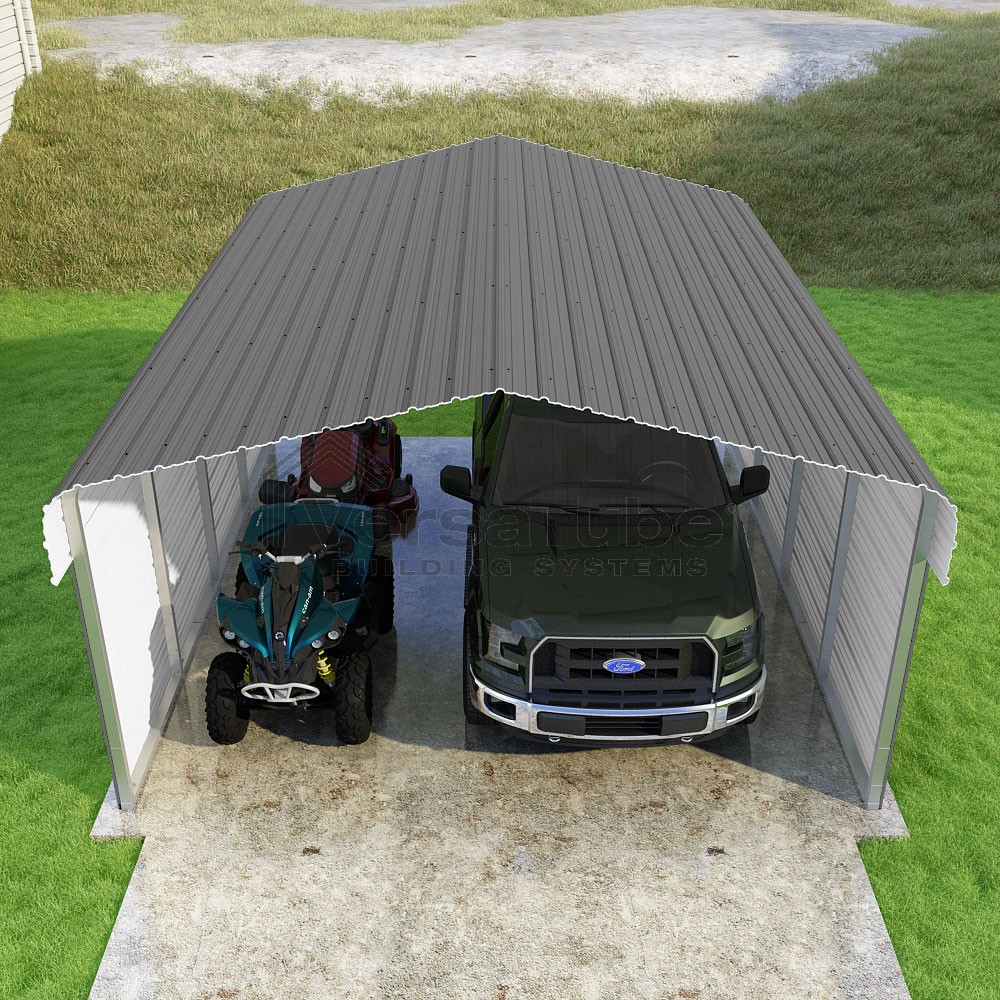 Classic Series DIY carport kit features horizontal application of sheet metal panels with the extra protection of rounded eaves.