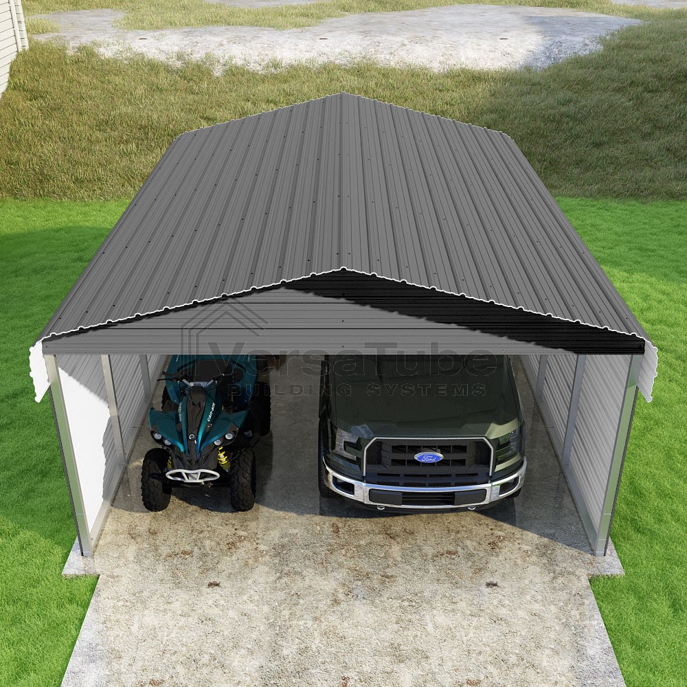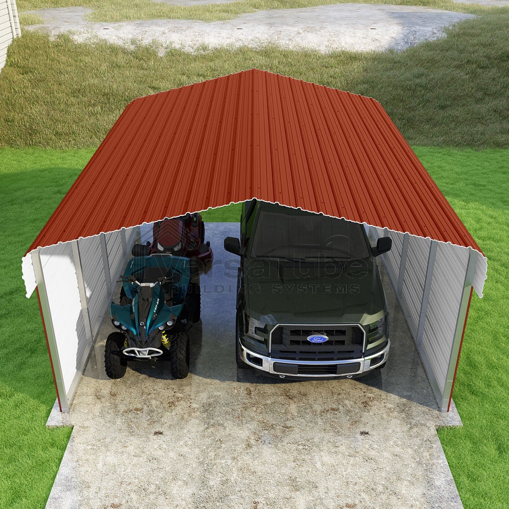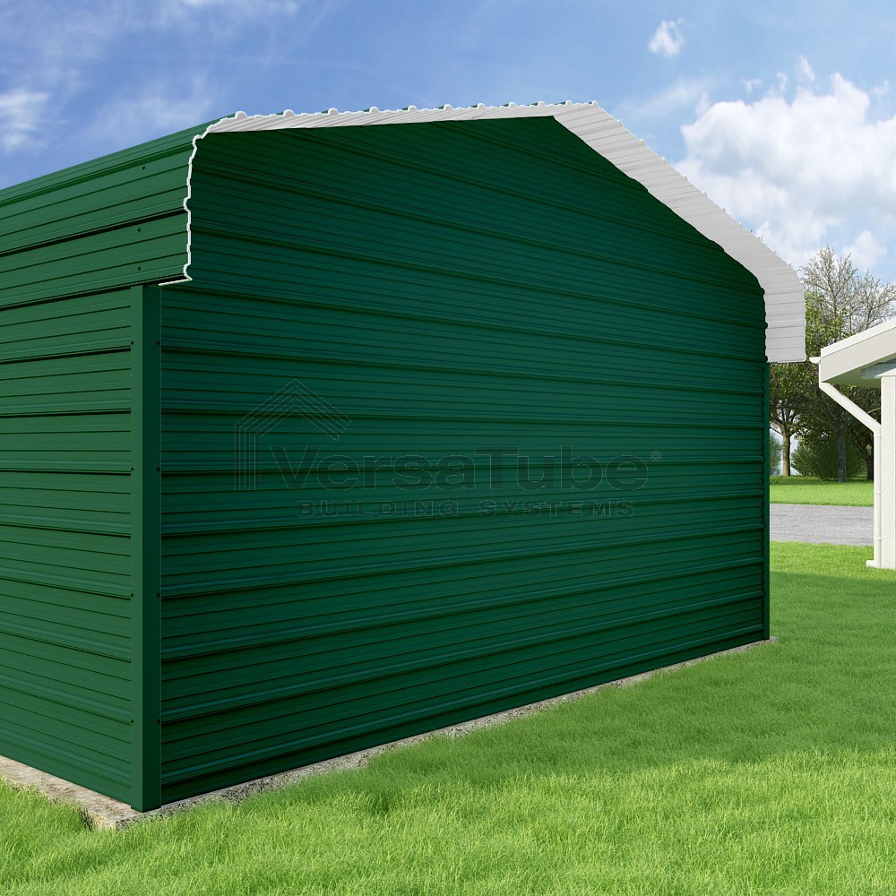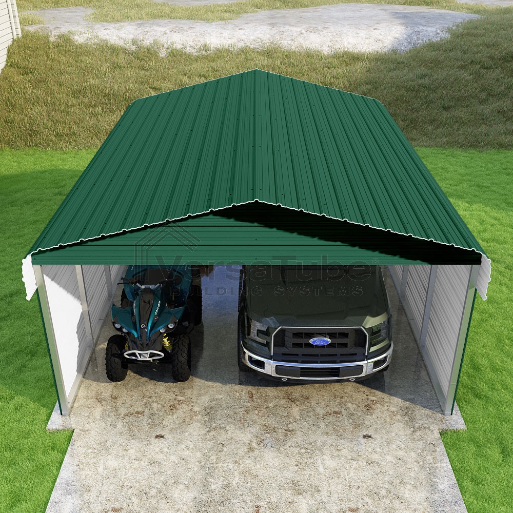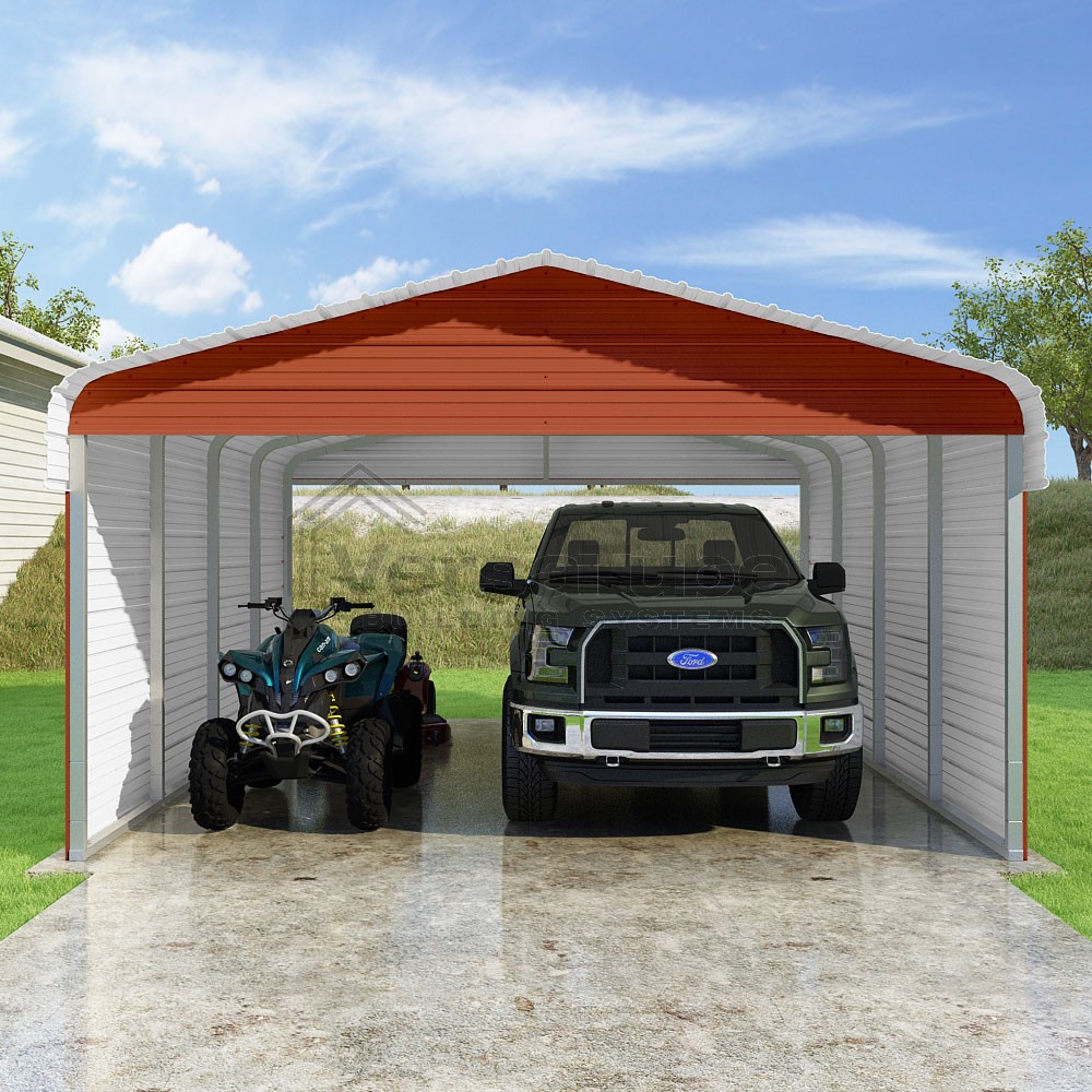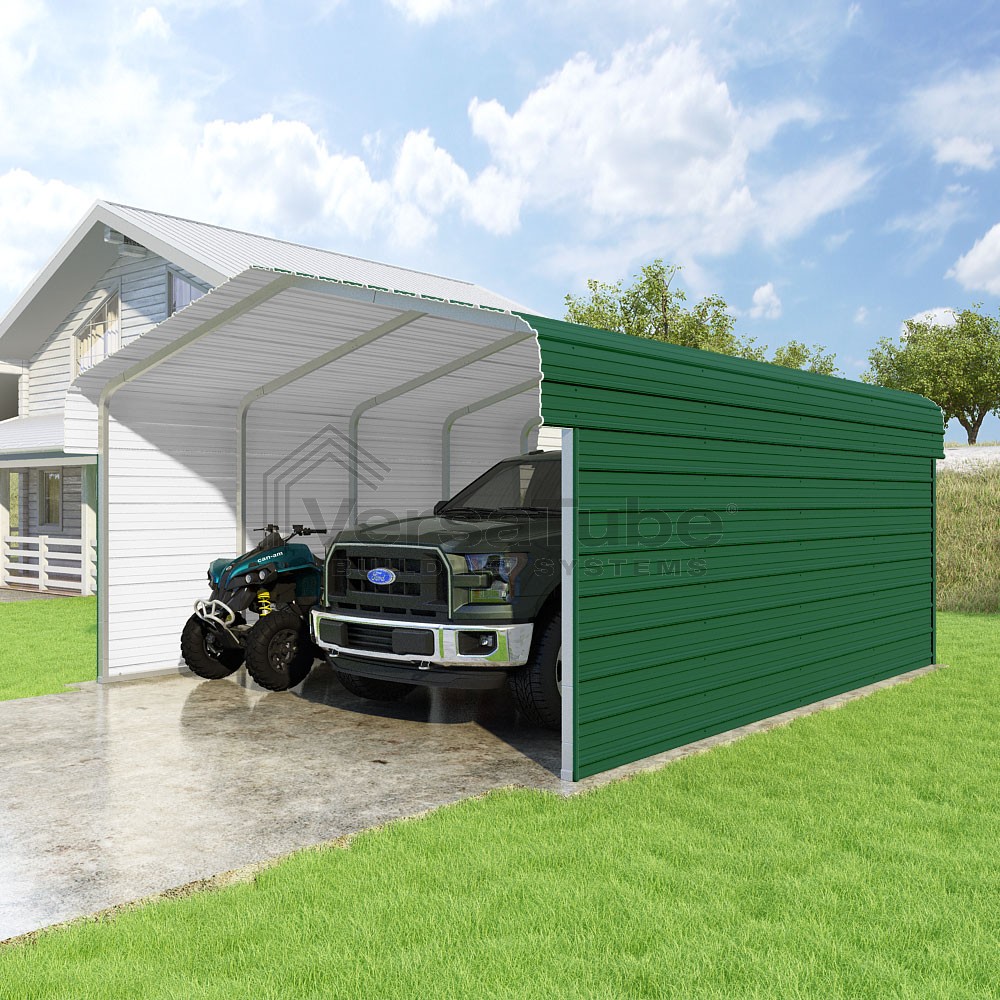 Classic Series DIY carport kit features horizontal application of sheet metal panels with the extra protection of rounded eaves.