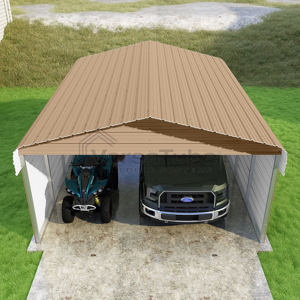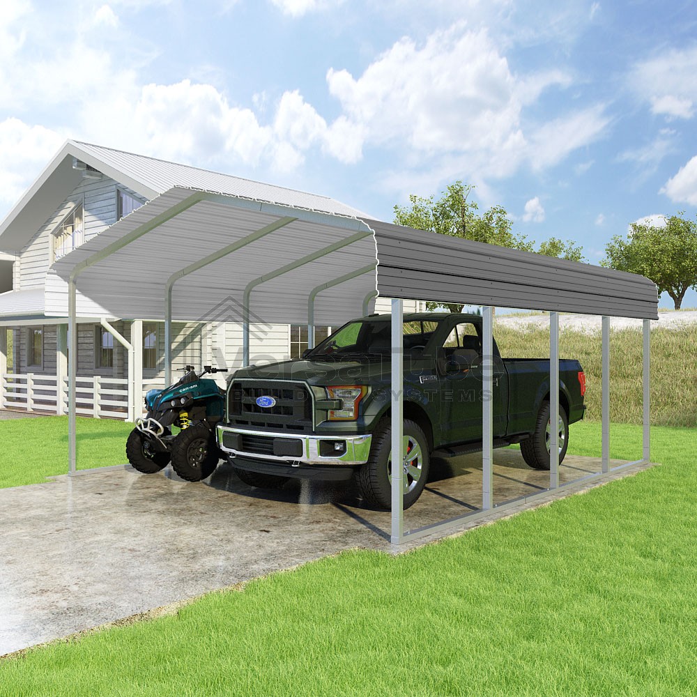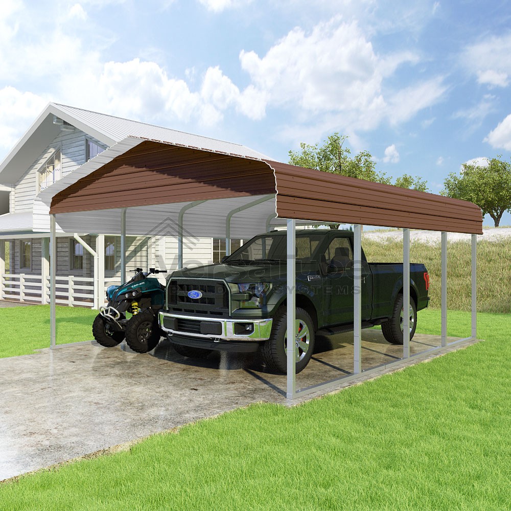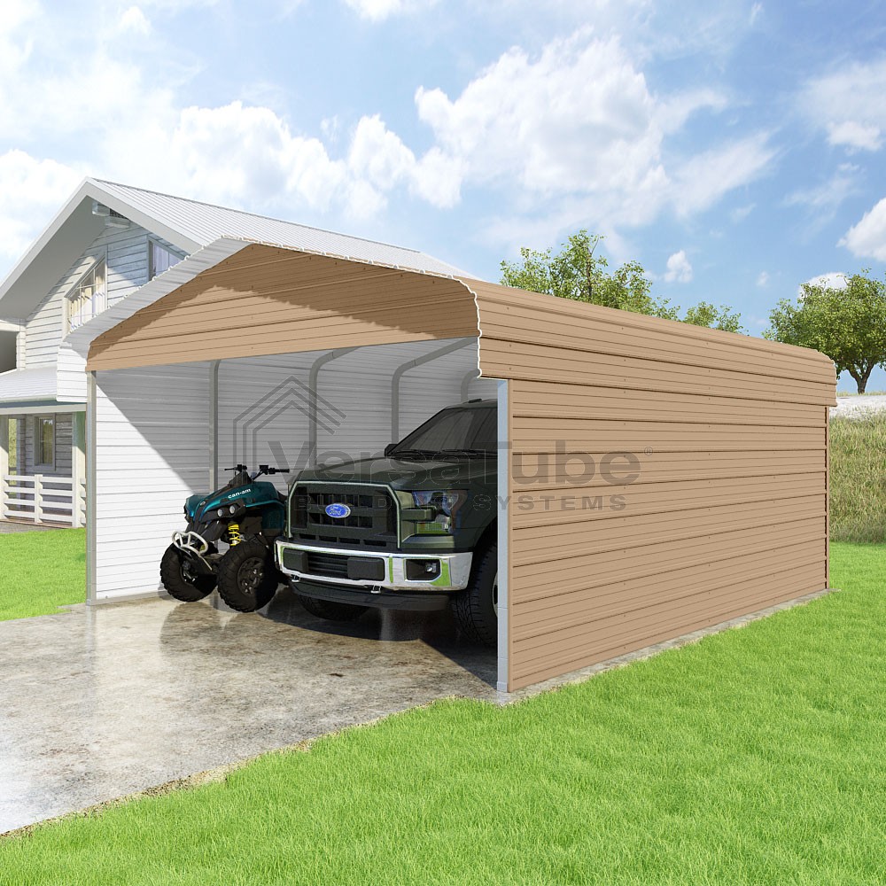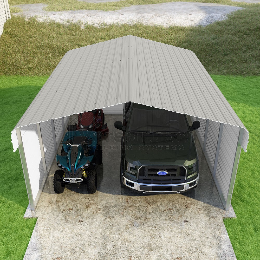 Classic Series DIY carport kit features horizontal application of sheet metal panels with the extra protection of rounded eaves.