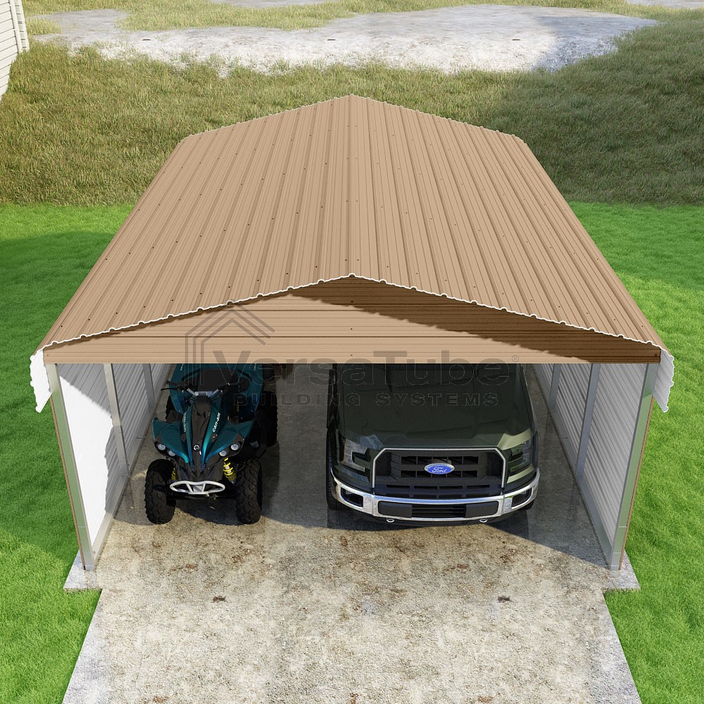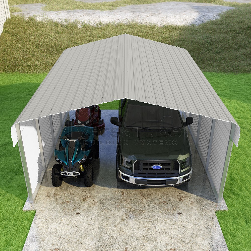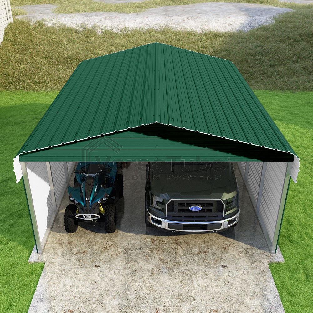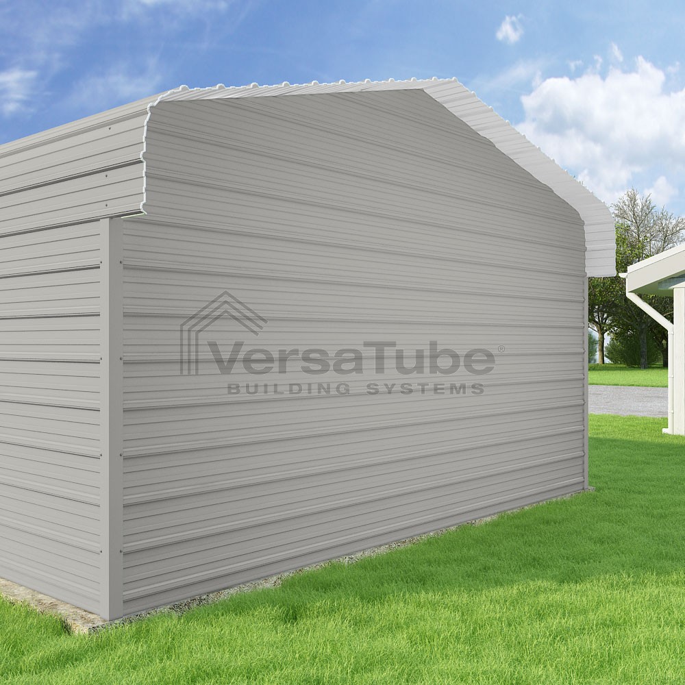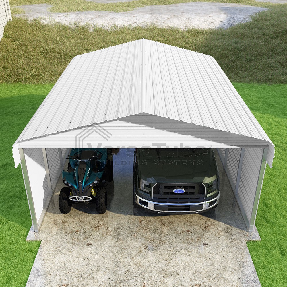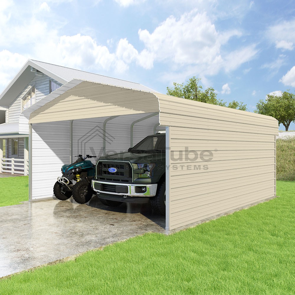 Classic Series DIY carport kit features horizontal application of sheet metal panels with the extra protection of rounded eaves.