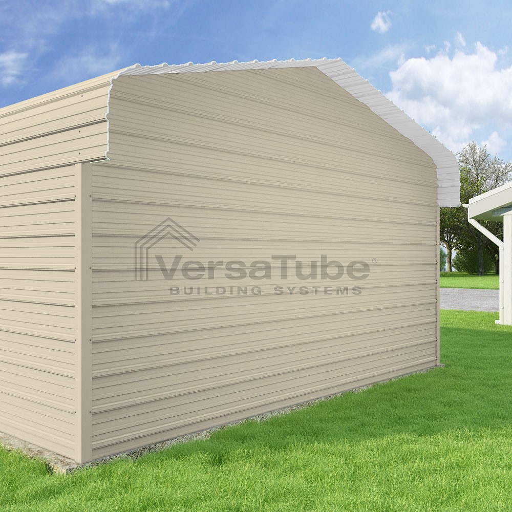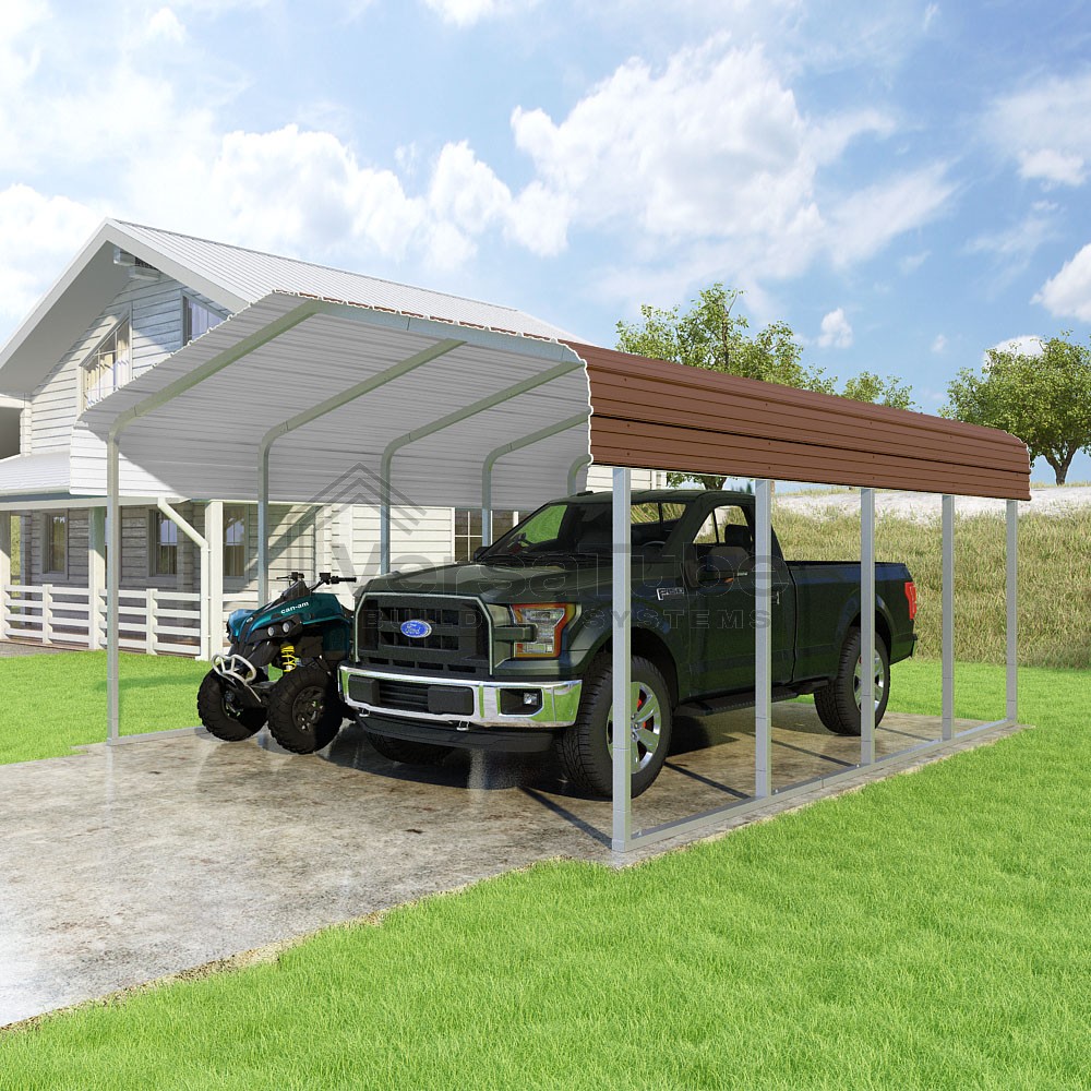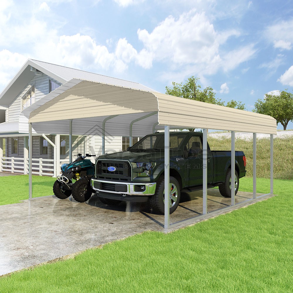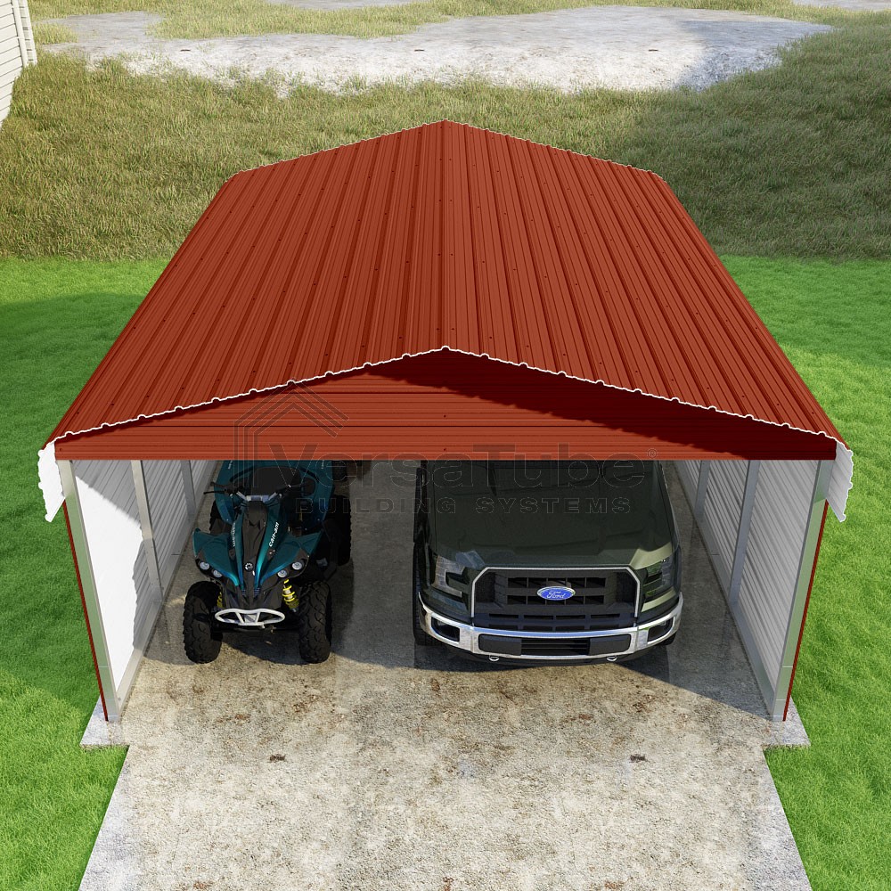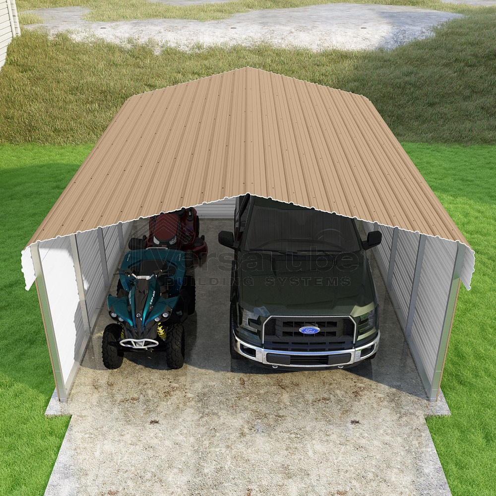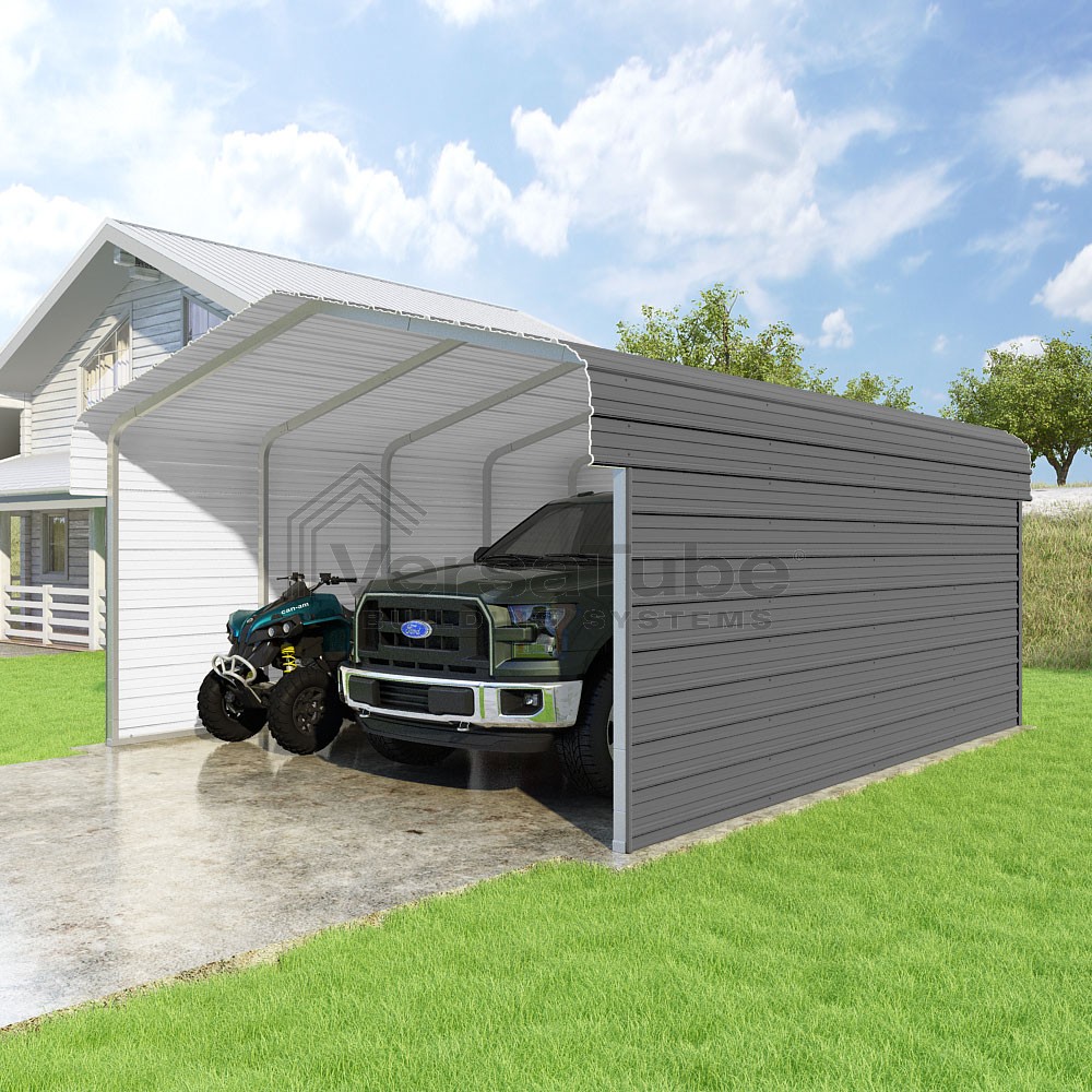 Classic Series DIY carport kit features horizontal application of sheet metal panels with the extra protection of rounded eaves.