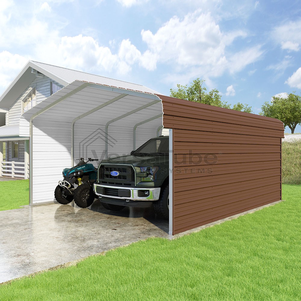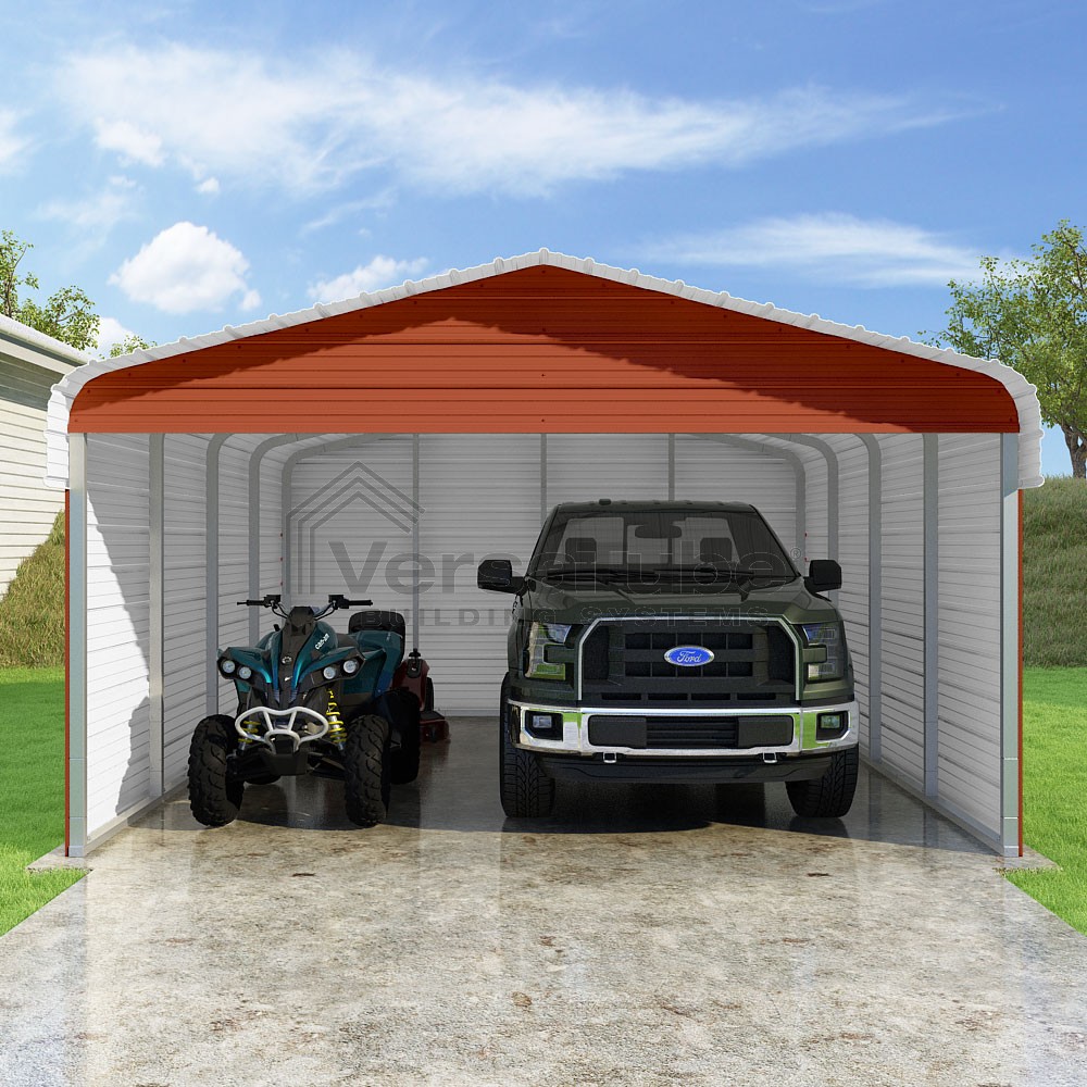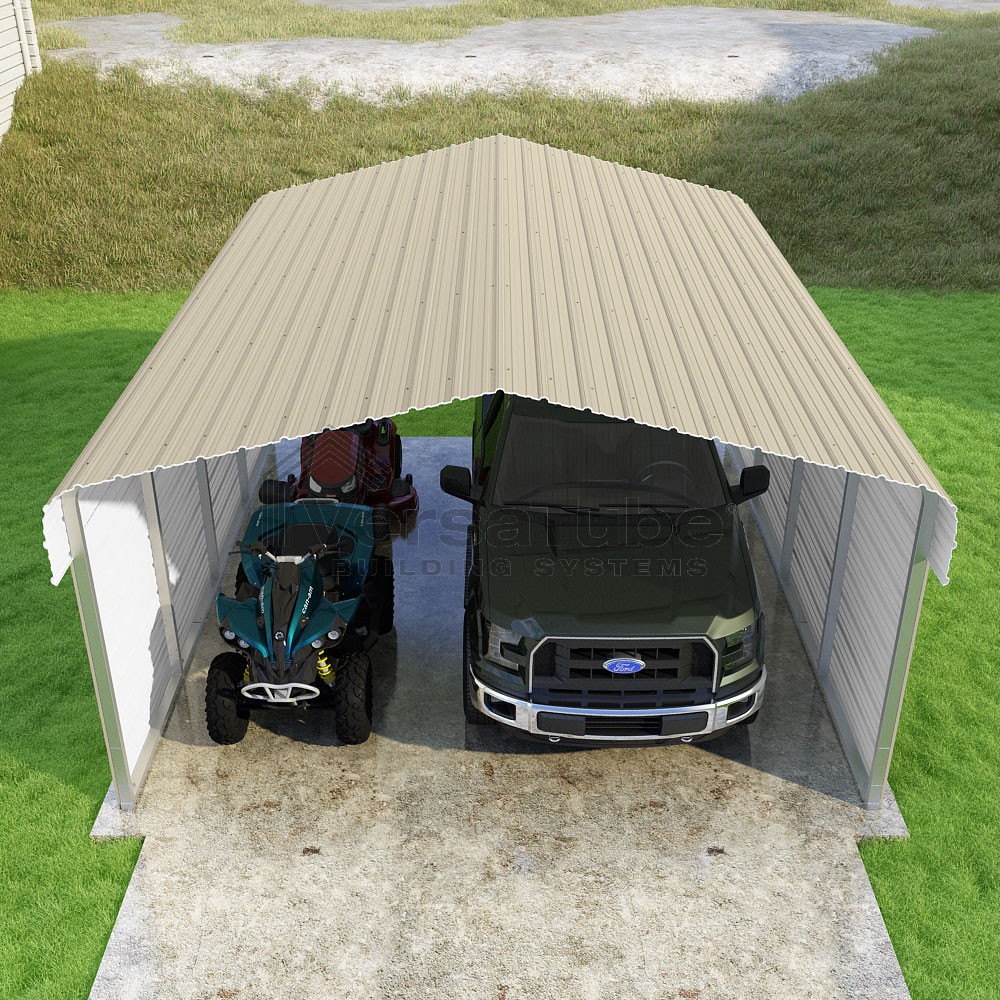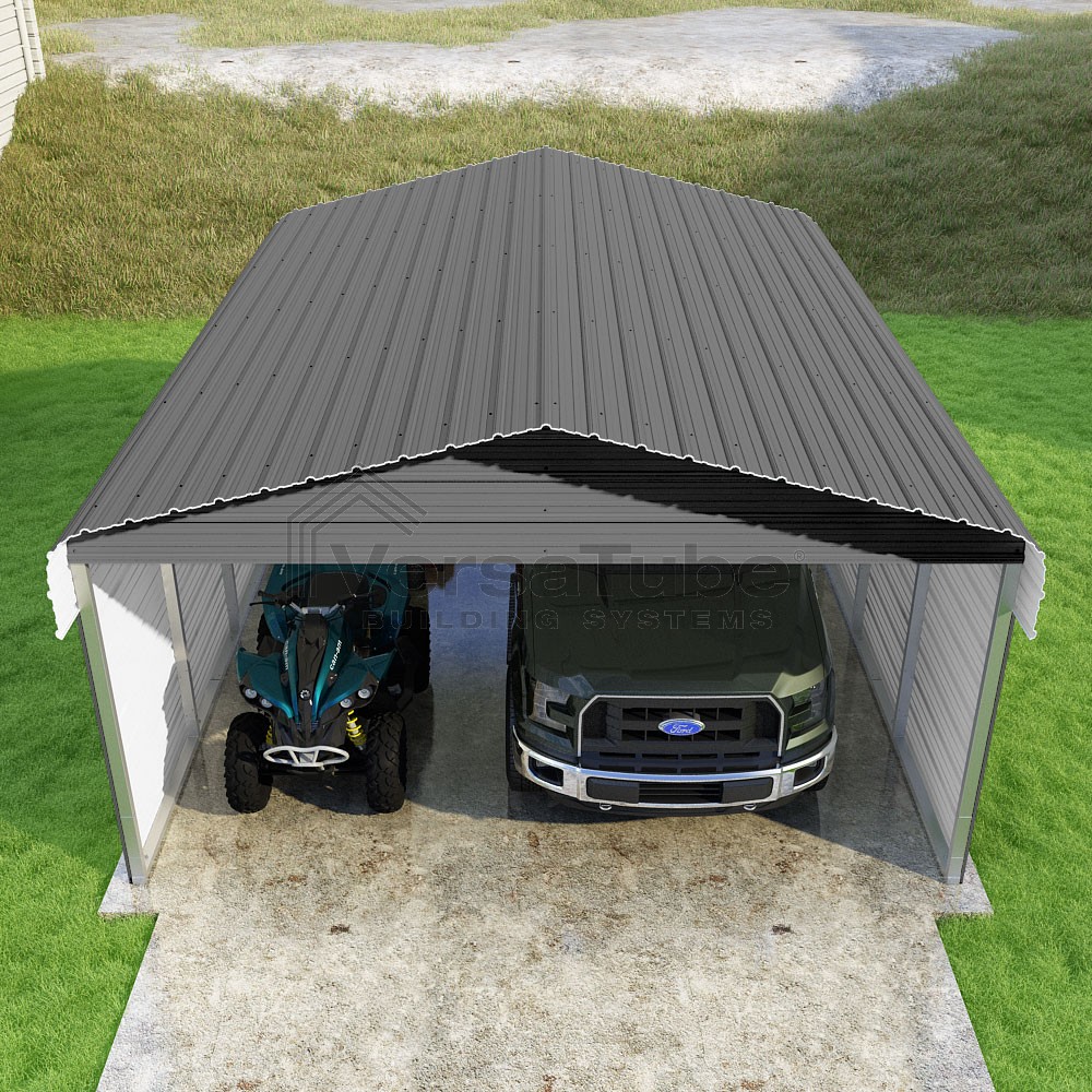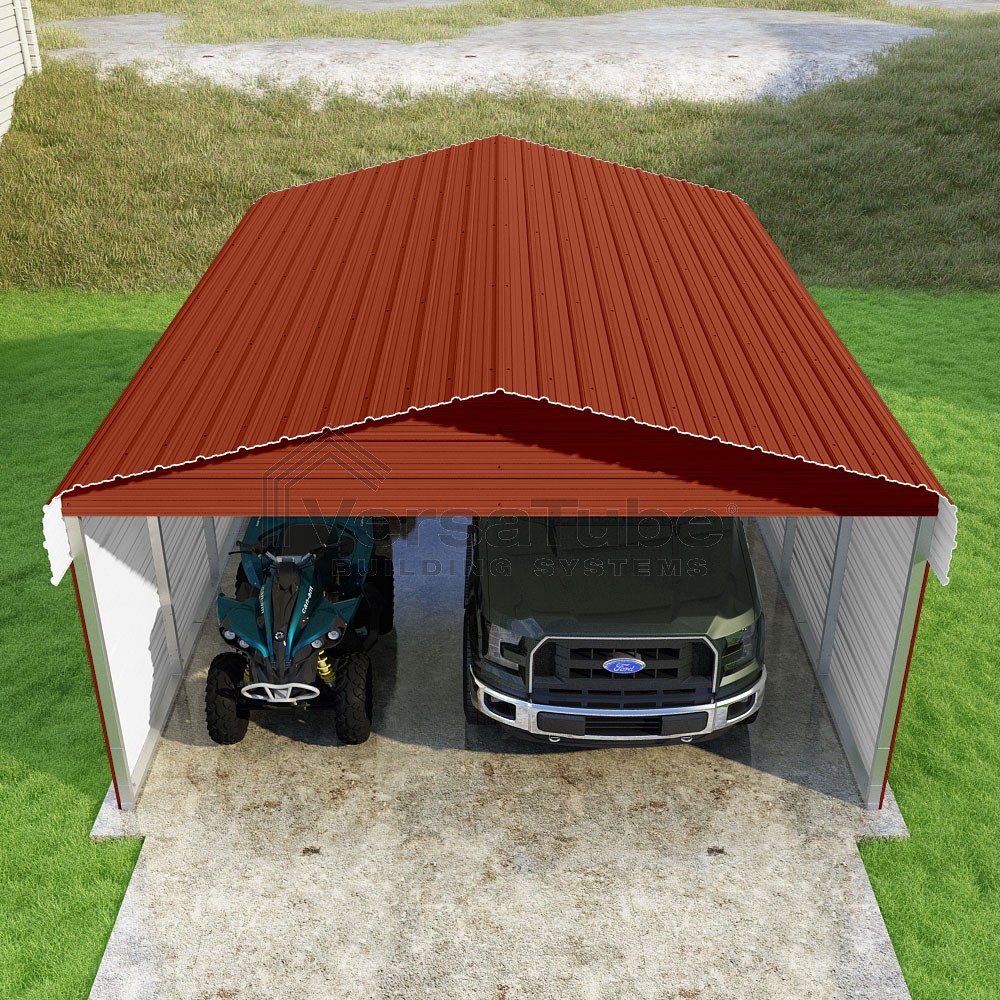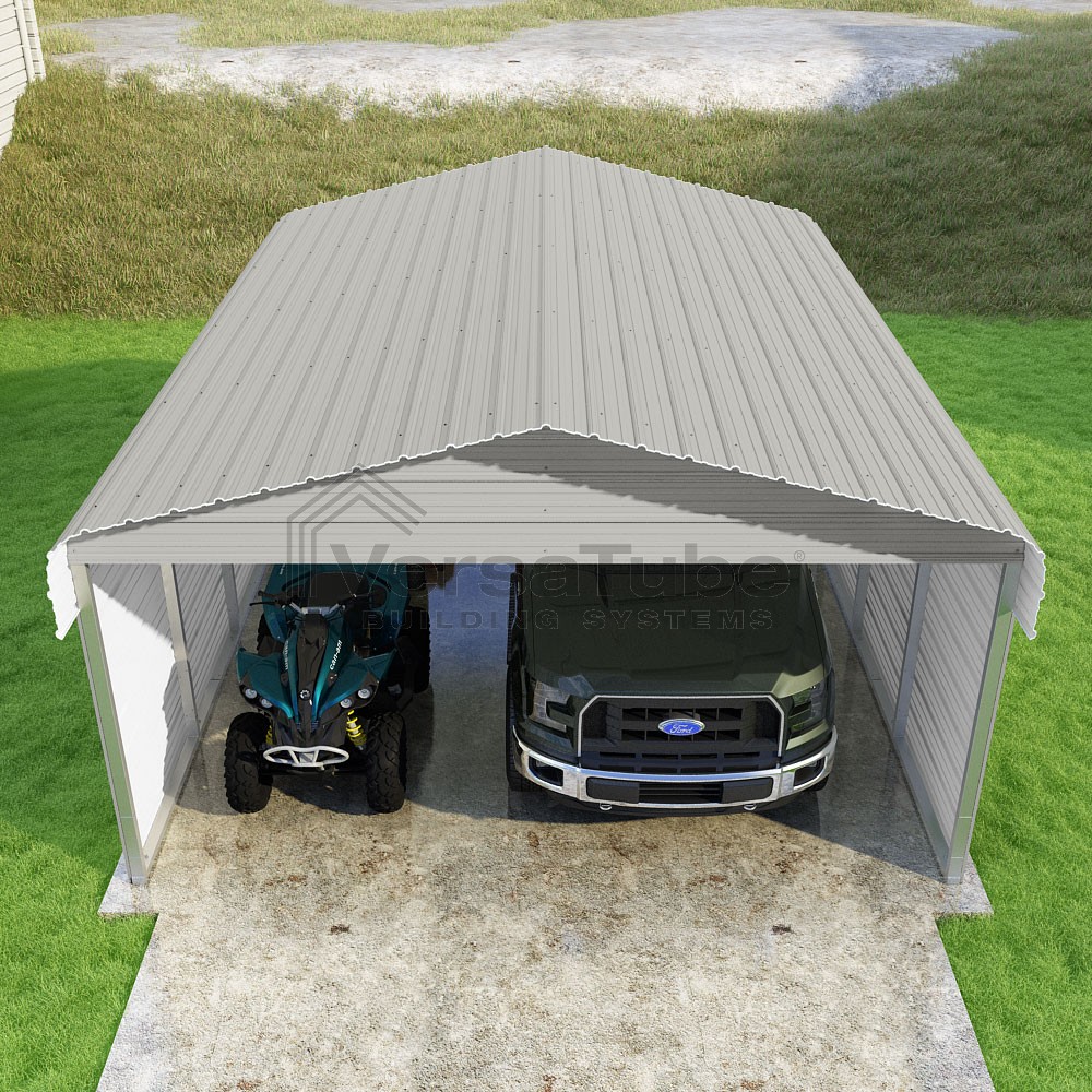 Classic Series DIY carport kit features horizontal application of sheet metal panels with the extra protection of rounded eaves.