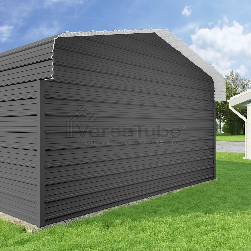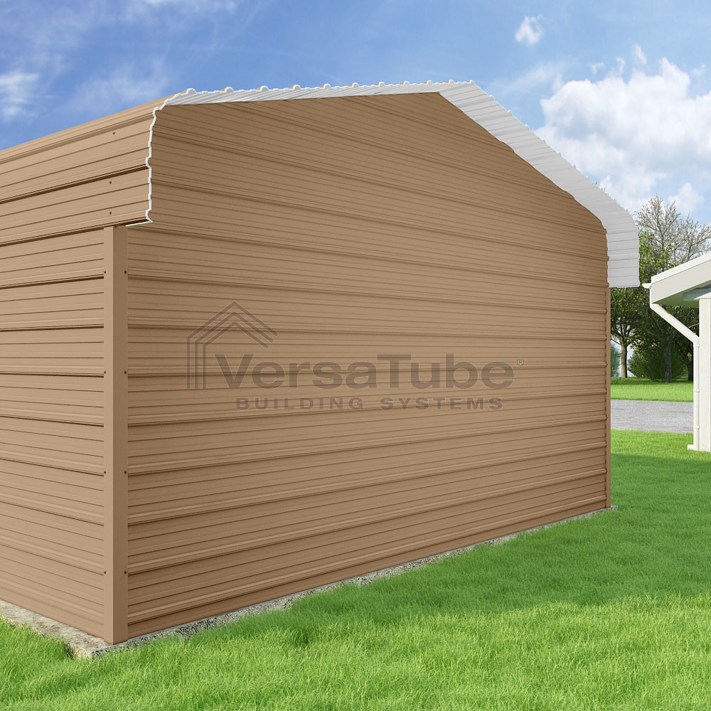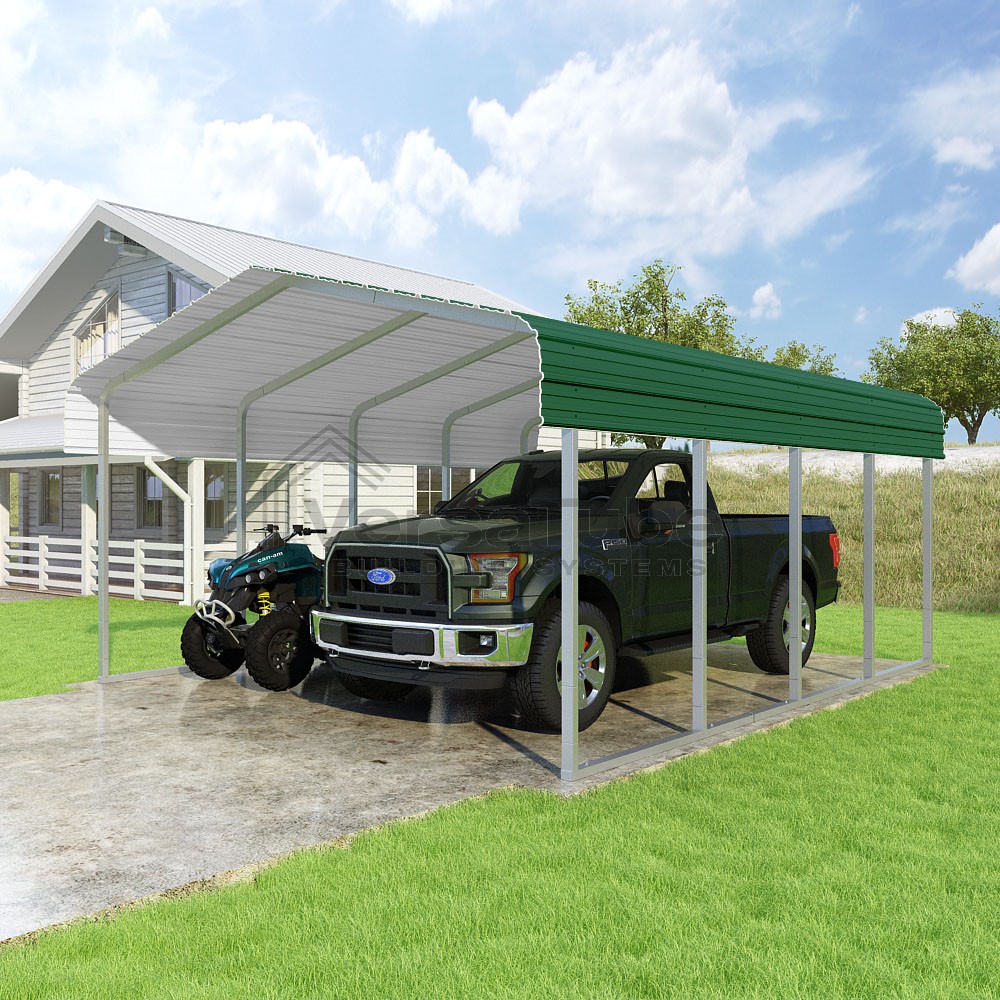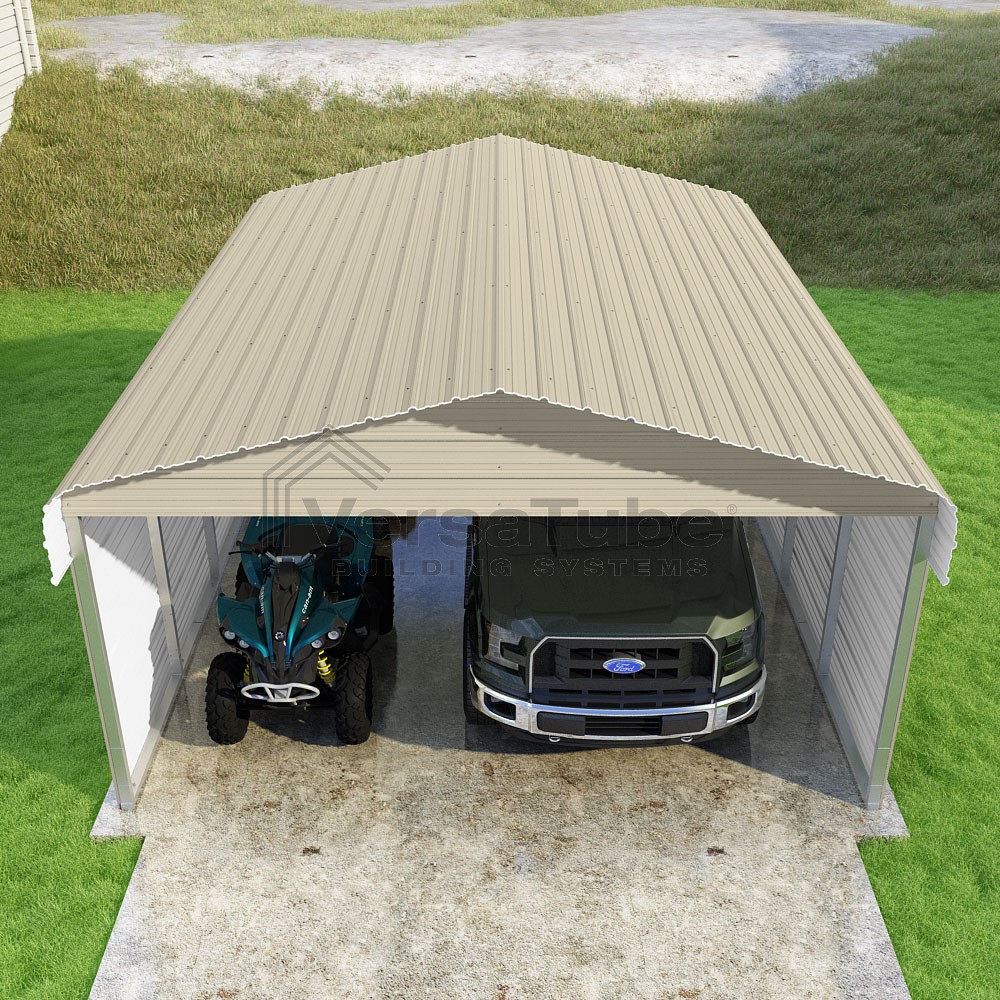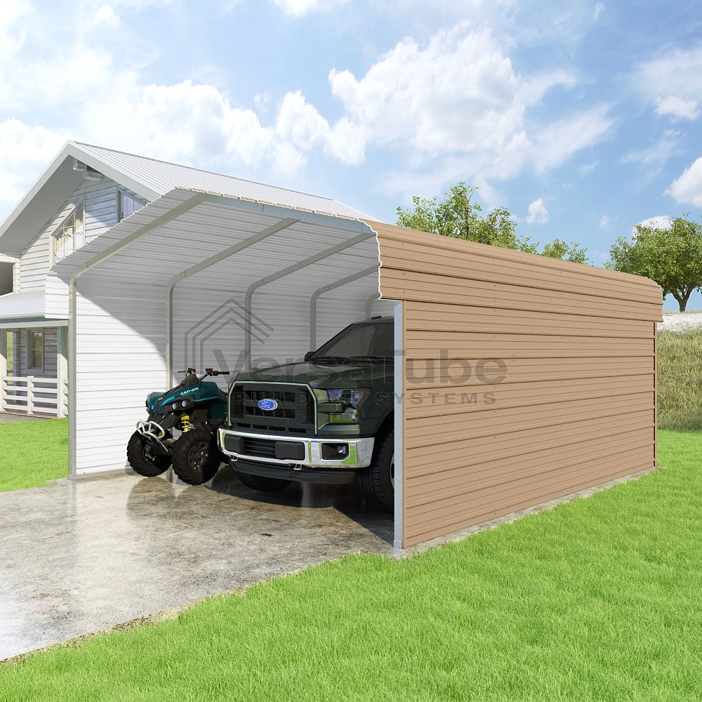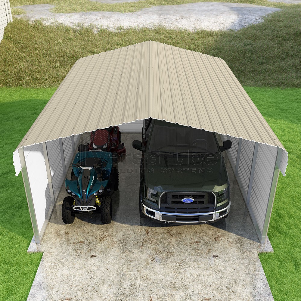 Classic Series DIY carport kit features horizontal application of sheet metal panels with the extra protection of rounded eaves.