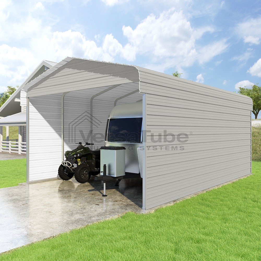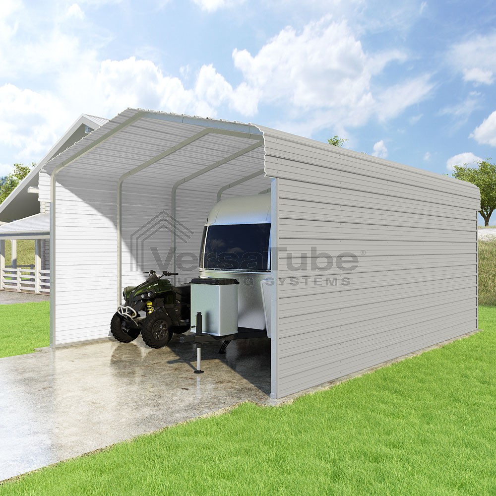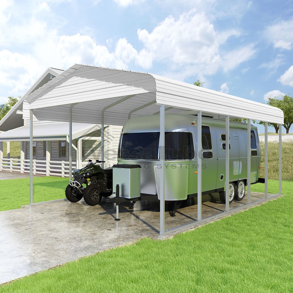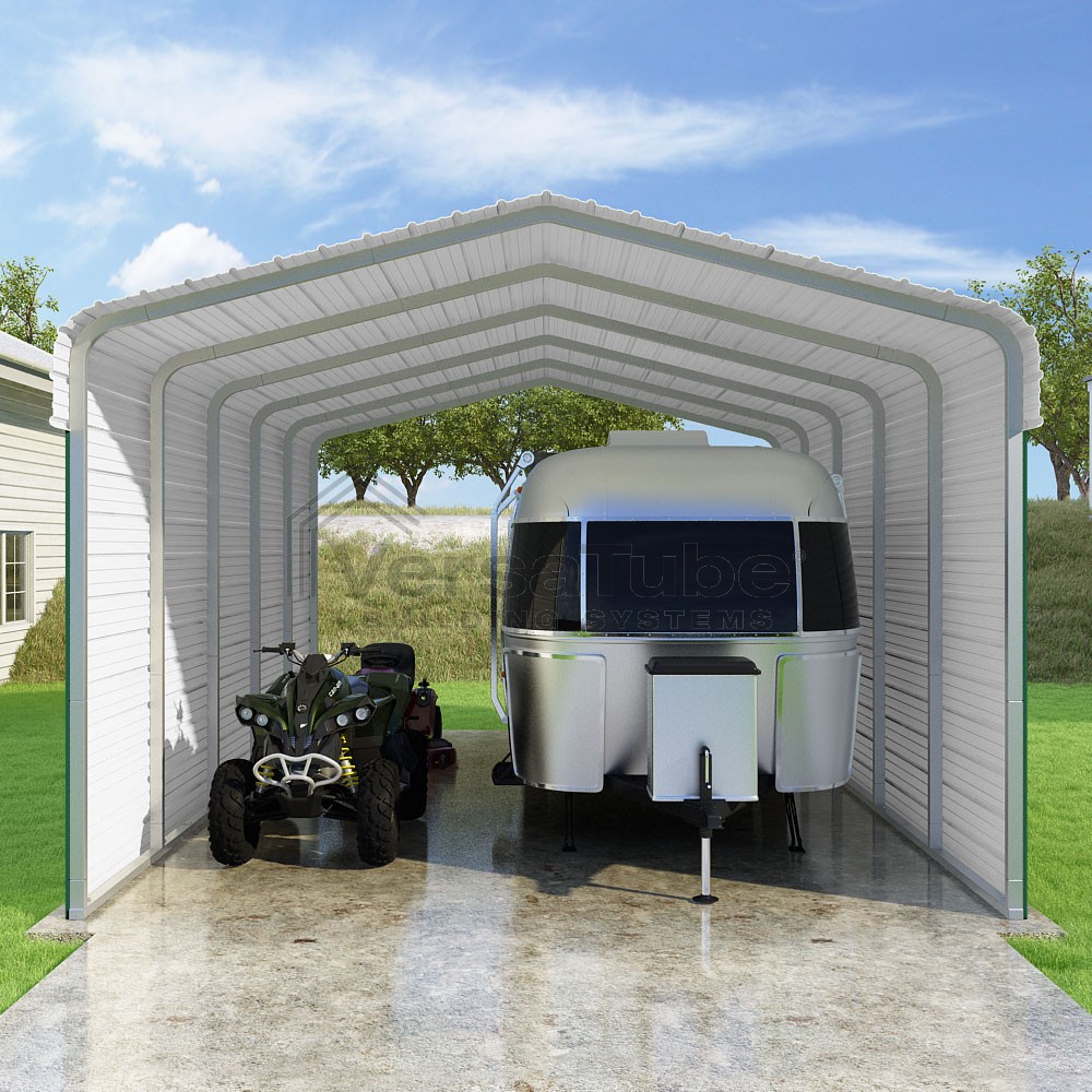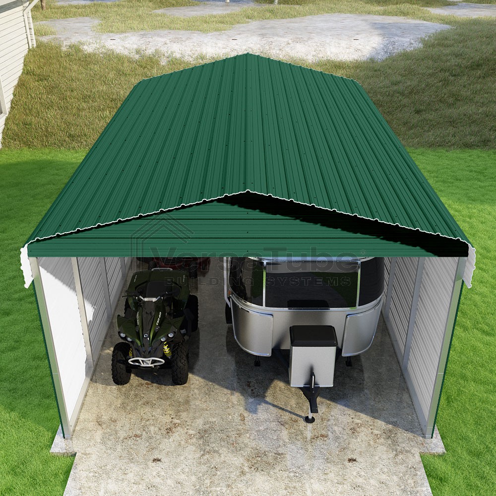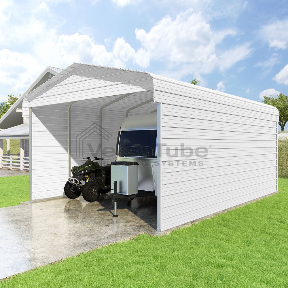 Classic Series DIY carport kit features horizontal application of sheet metal panels with the extra protection of rounded eaves.