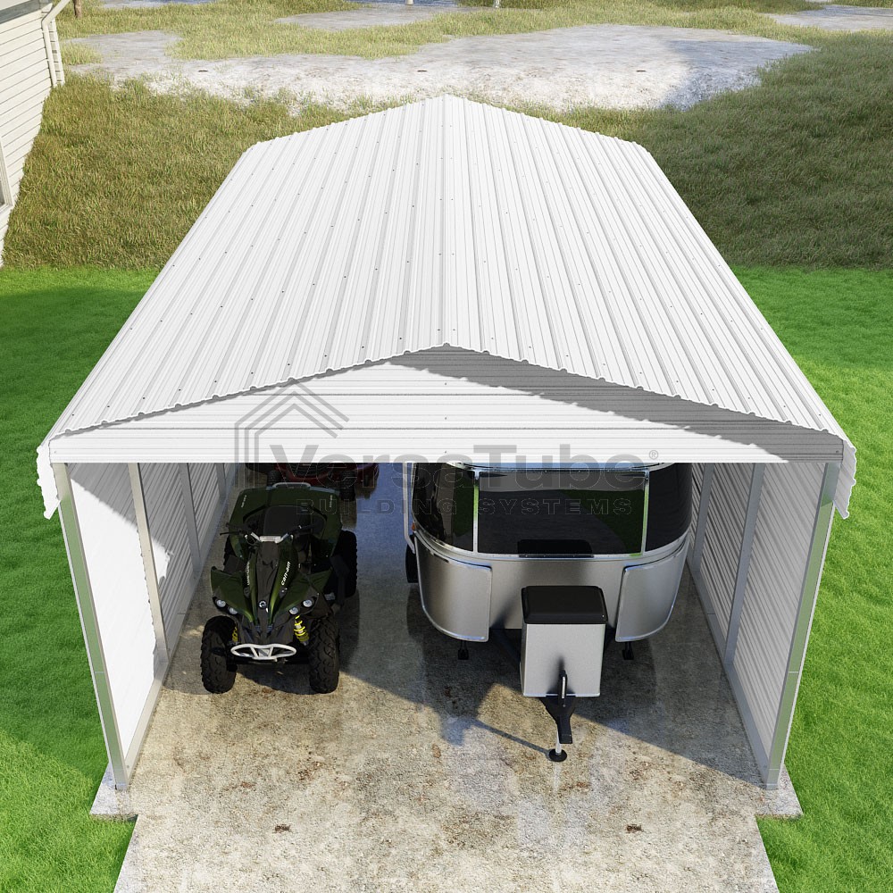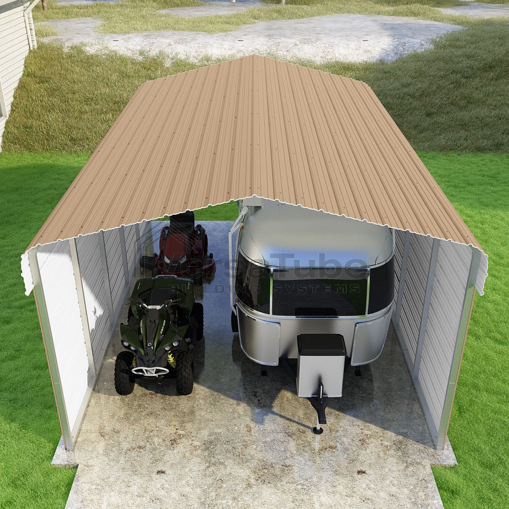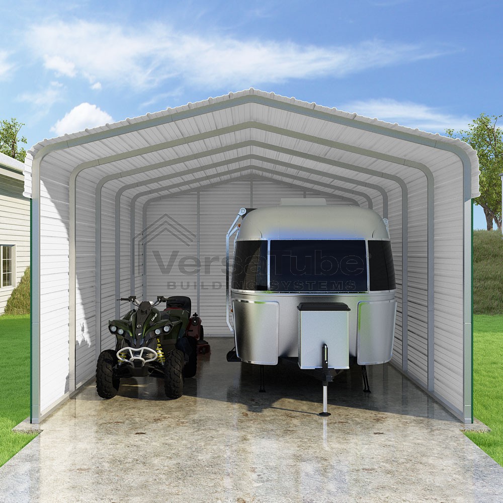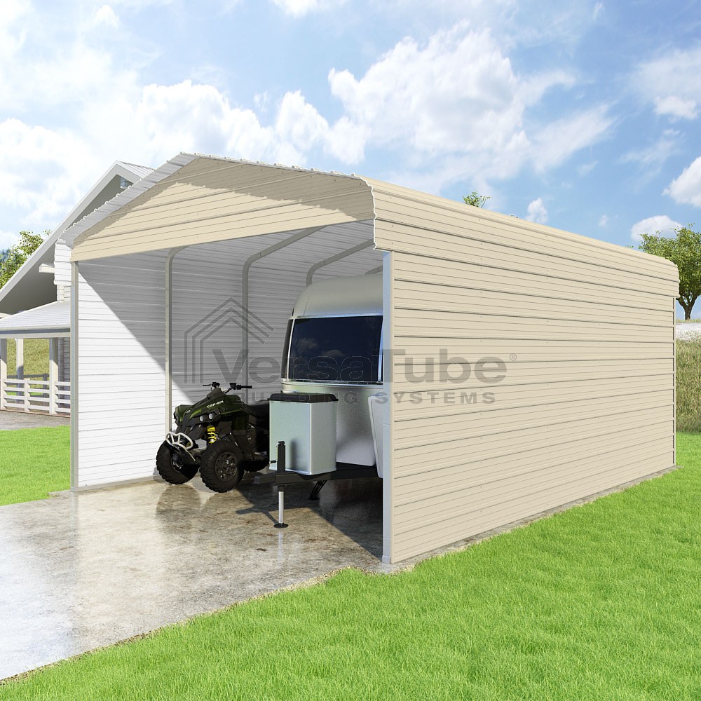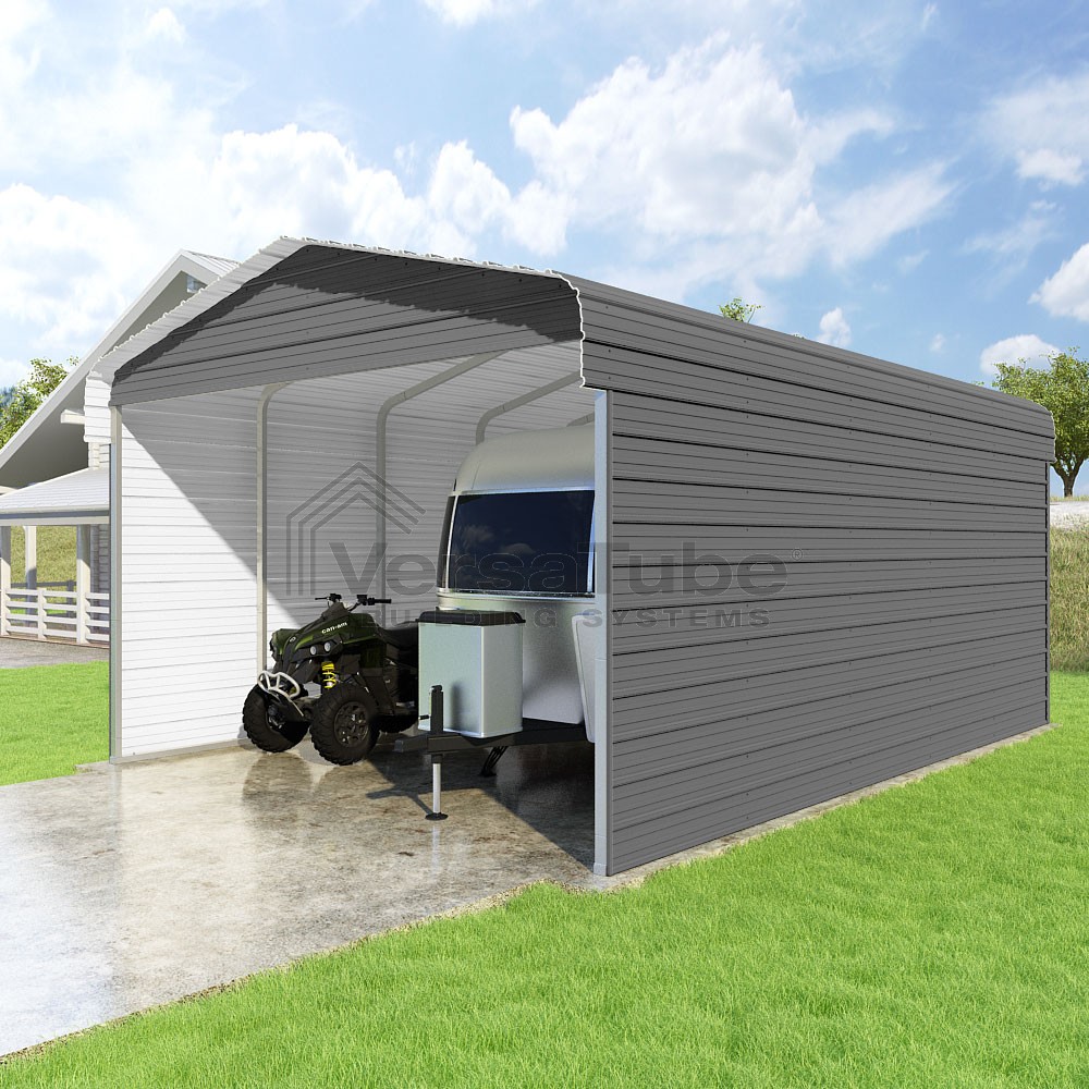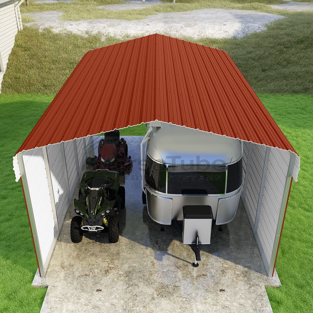 Classic Series DIY carport kit features horizontal application of sheet metal panels with the extra protection of rounded eaves.