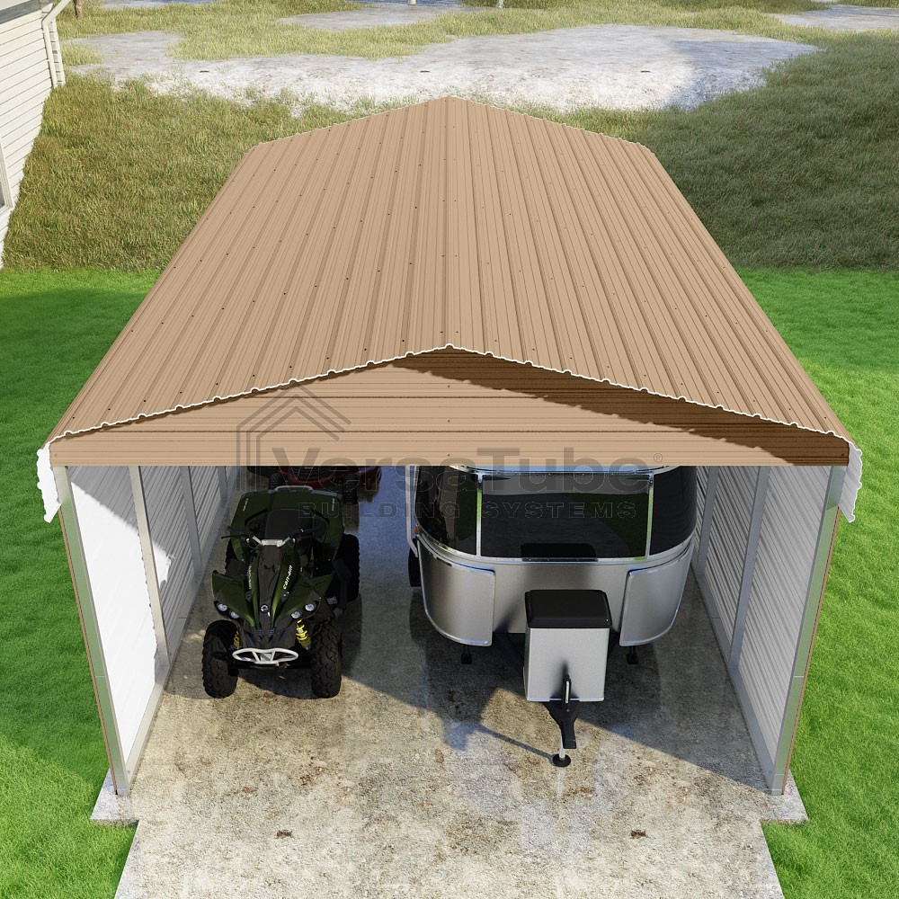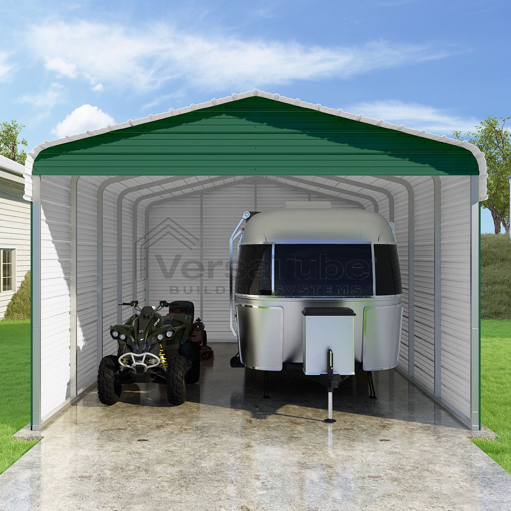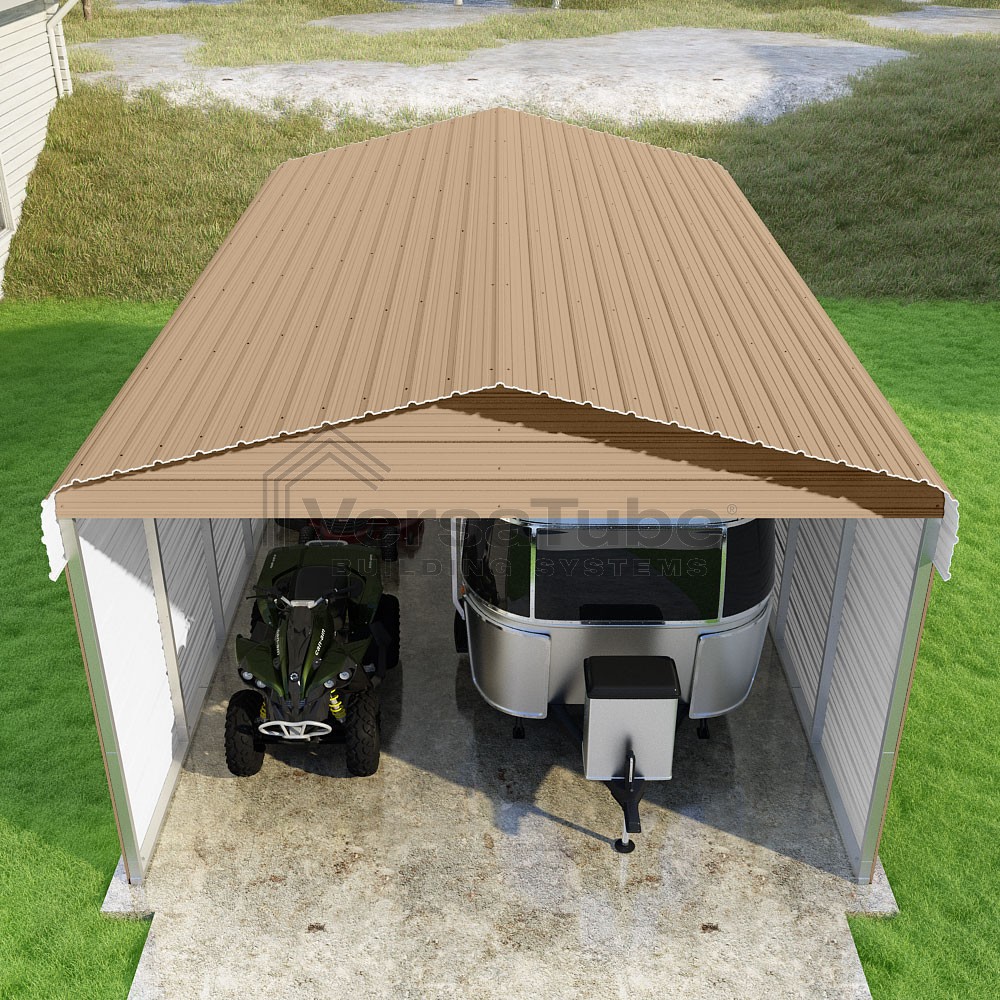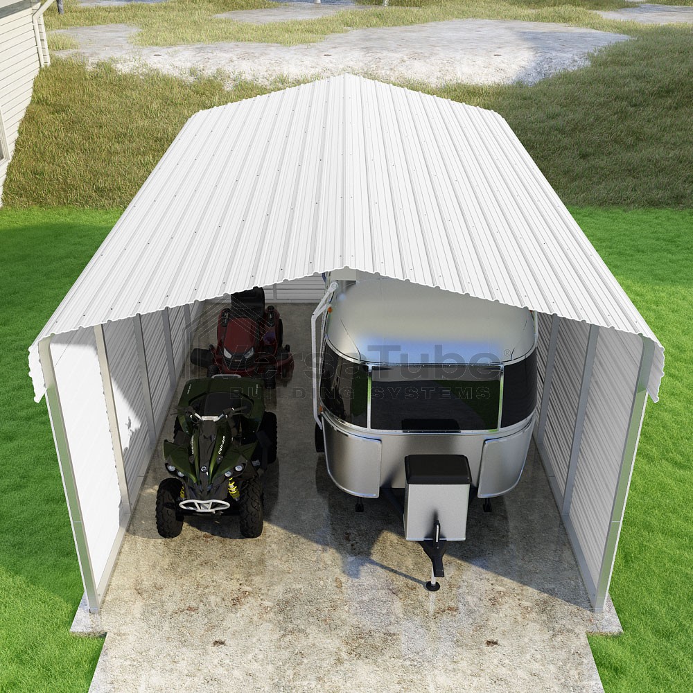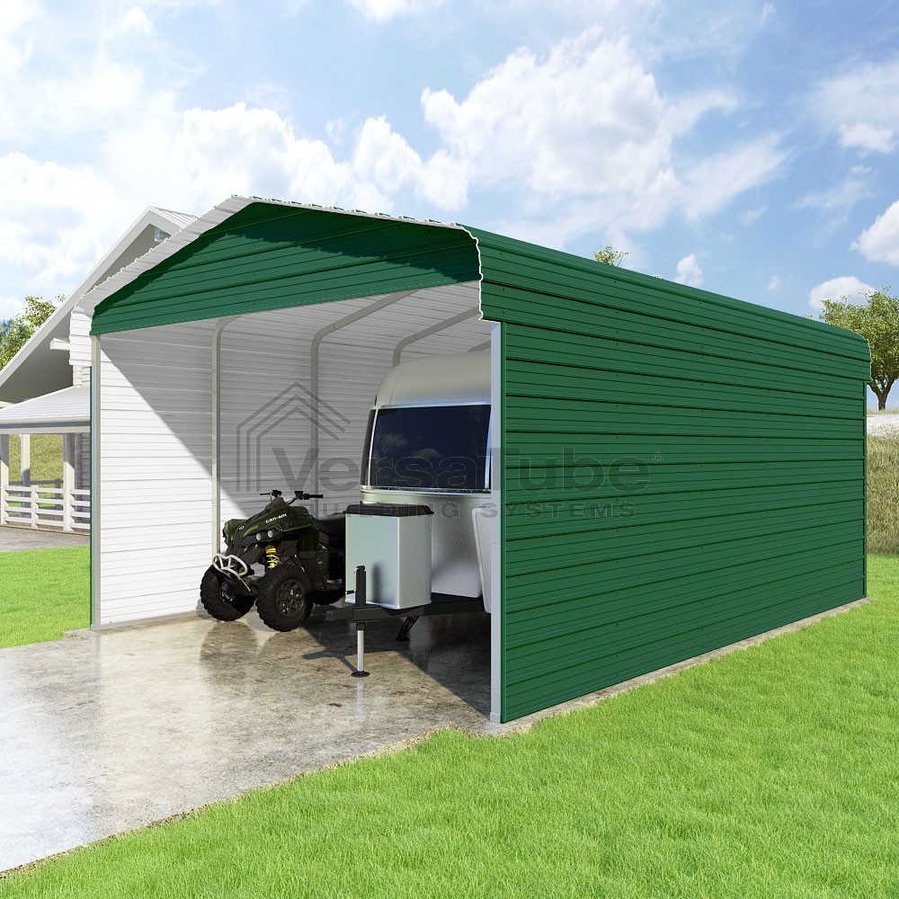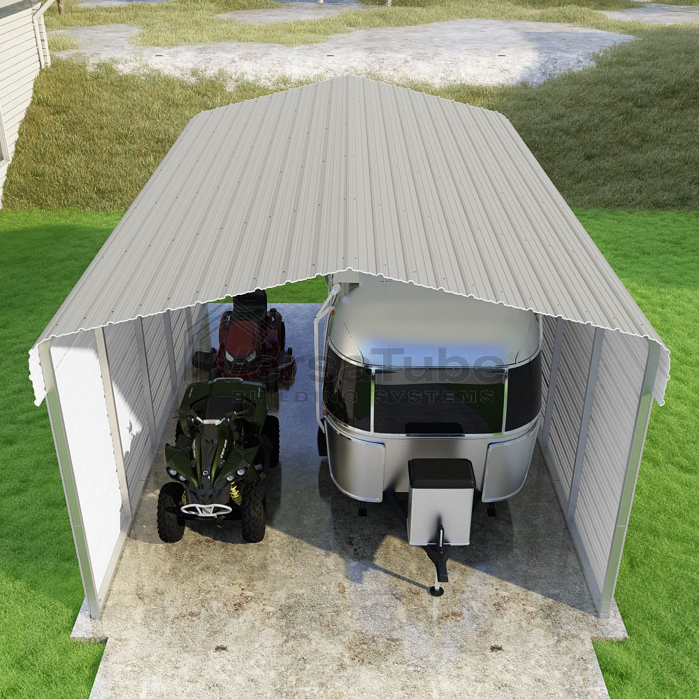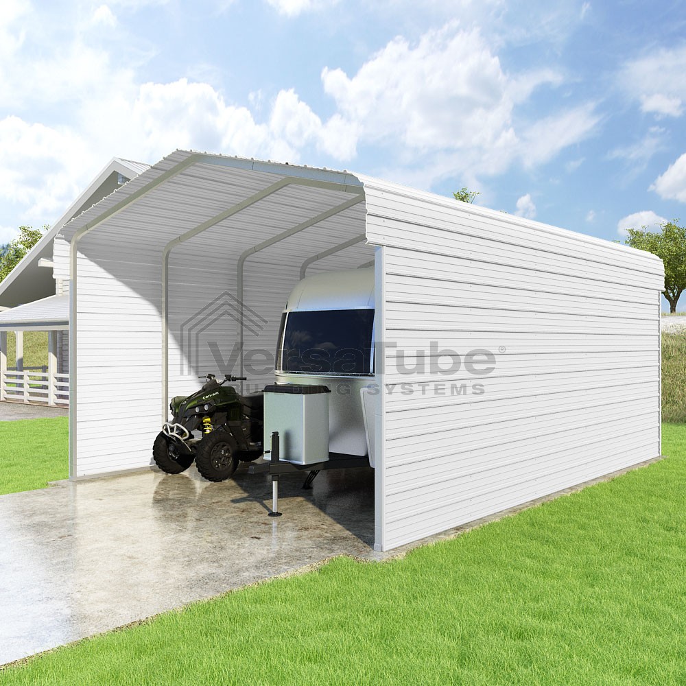Classic Series DIY carport kit features horizontal application of sheet metal panels with the extra protection of rounded eaves.