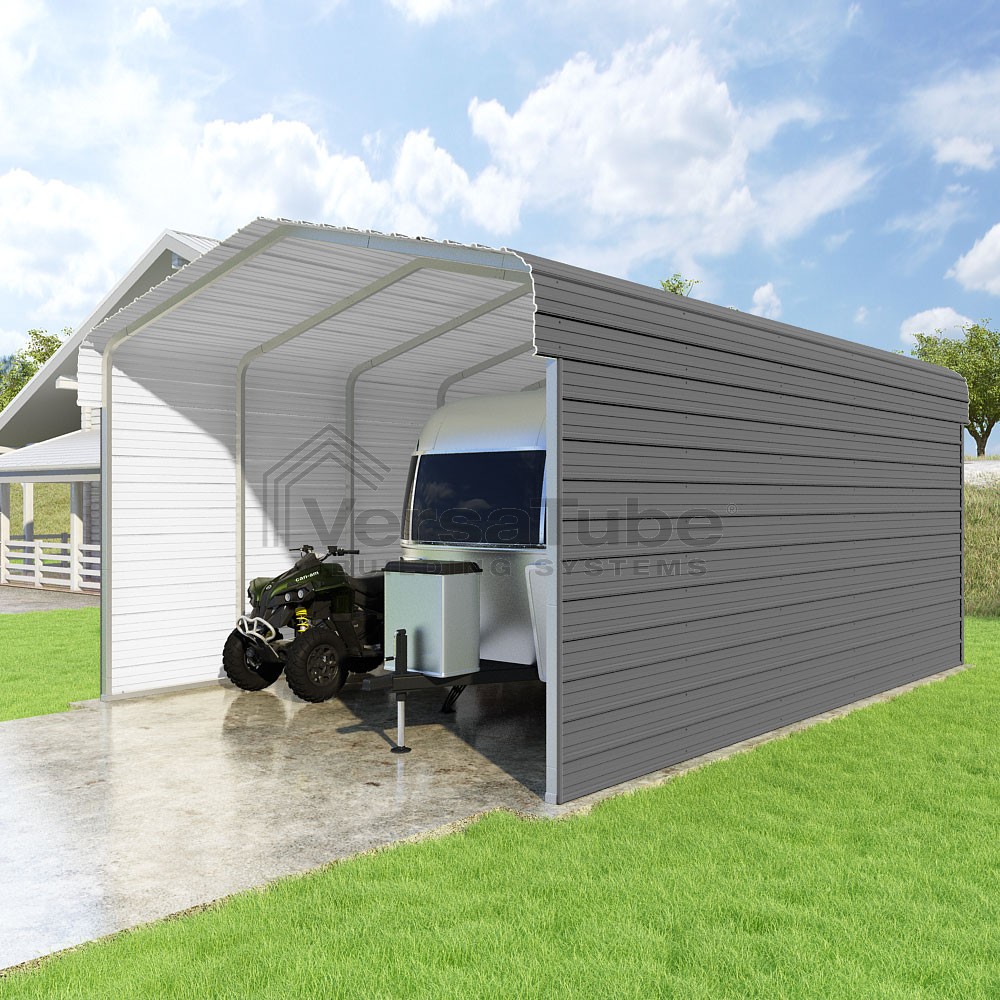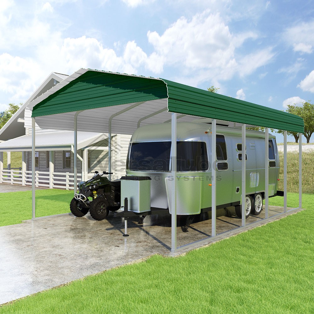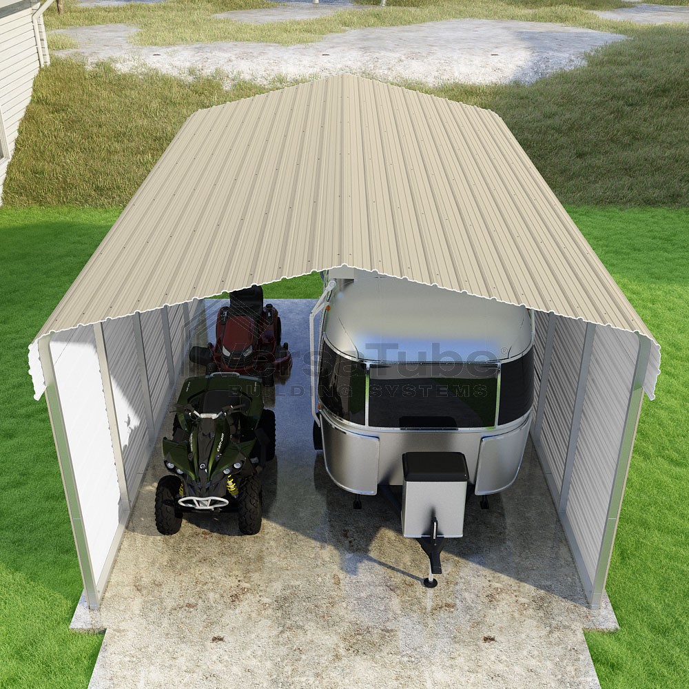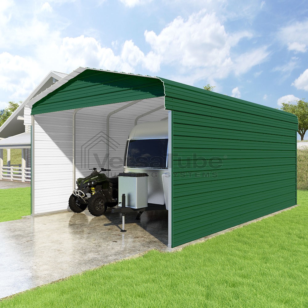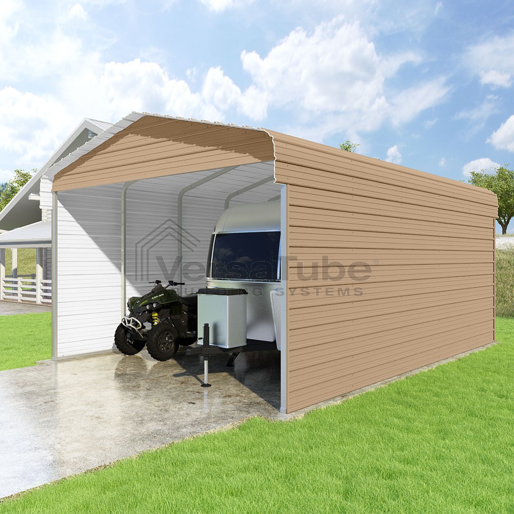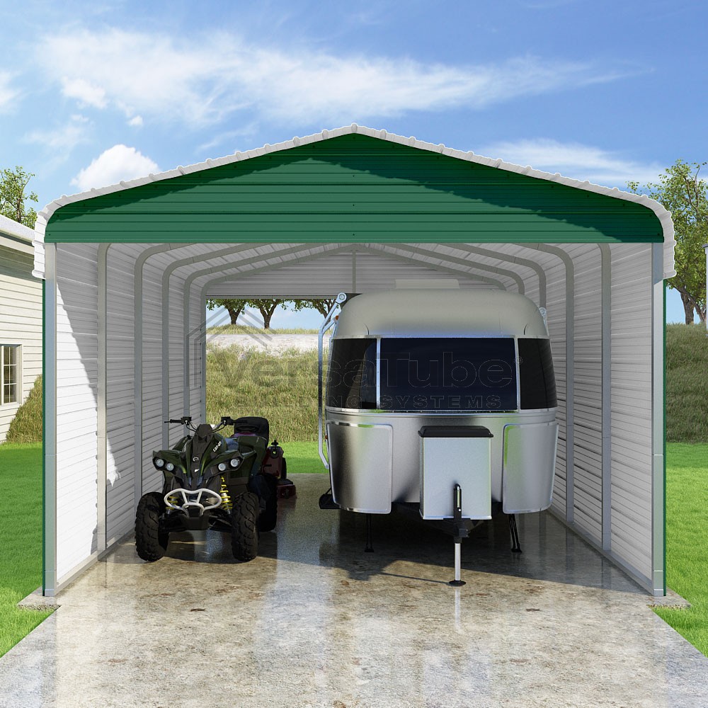 Classic Series DIY carport kit features horizontal application of sheet metal panels with the extra protection of rounded eaves.