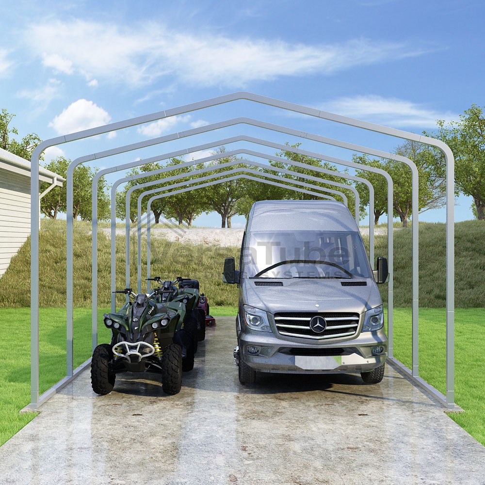 The Classic design utilizes a horizontal sheet metal roof application which has become a popular mainstay for accommodating carport or shelters solutions in a more affordable manner by eliminating the need for roof purlins and ridge cap trim. And with the VersaTube Slip-Fit frame system, you can get your carport frame kit assembled in a single afternoon using common tools.