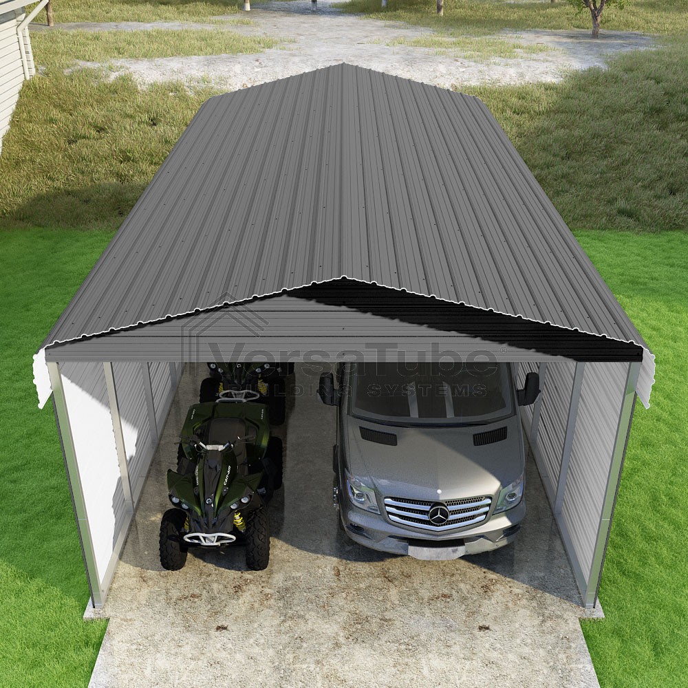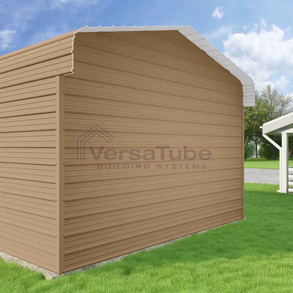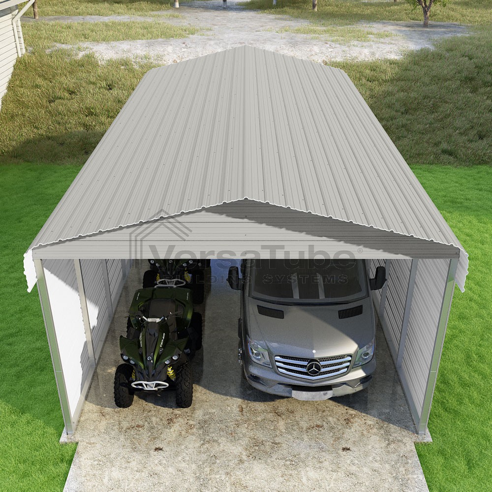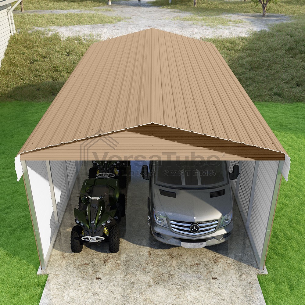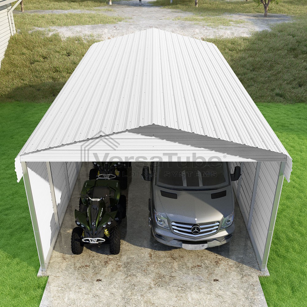 Classic Series DIY carport kit features horizontal application of sheet metal panels with the extra protection of rounded eaves.