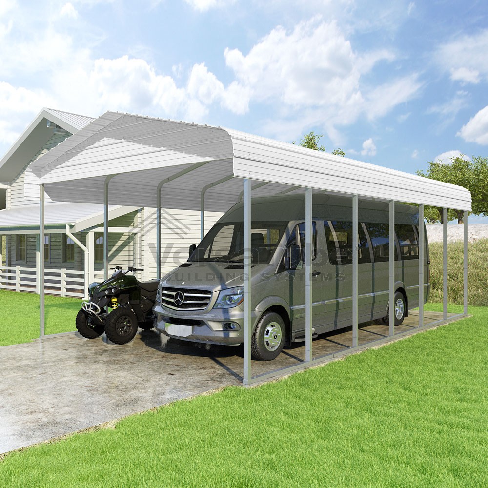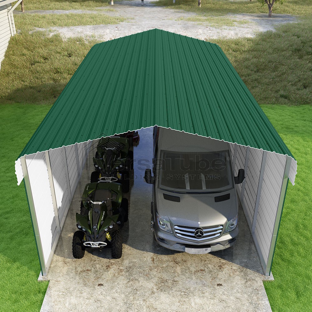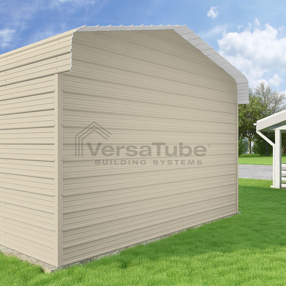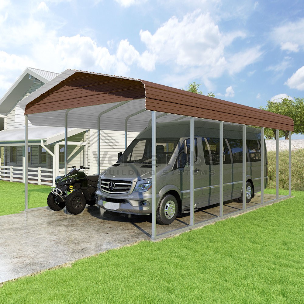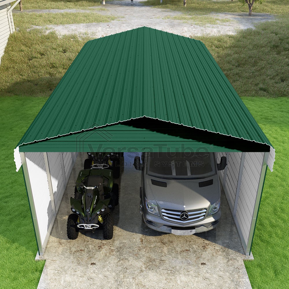 Classic Series DIY carport kit features horizontal application of sheet metal panels with the extra protection of rounded eaves.