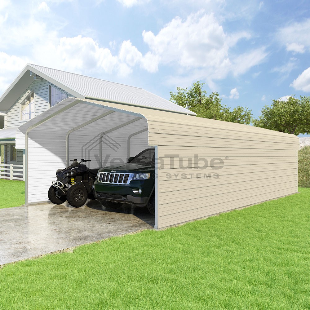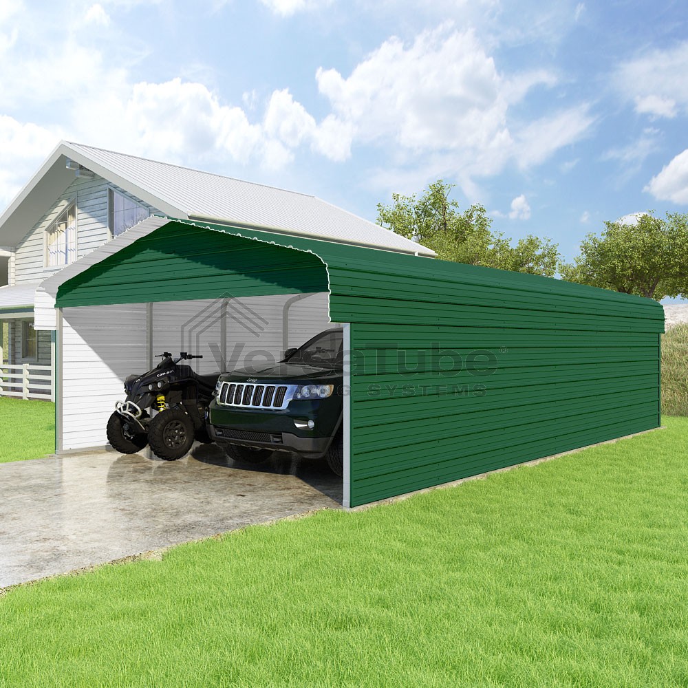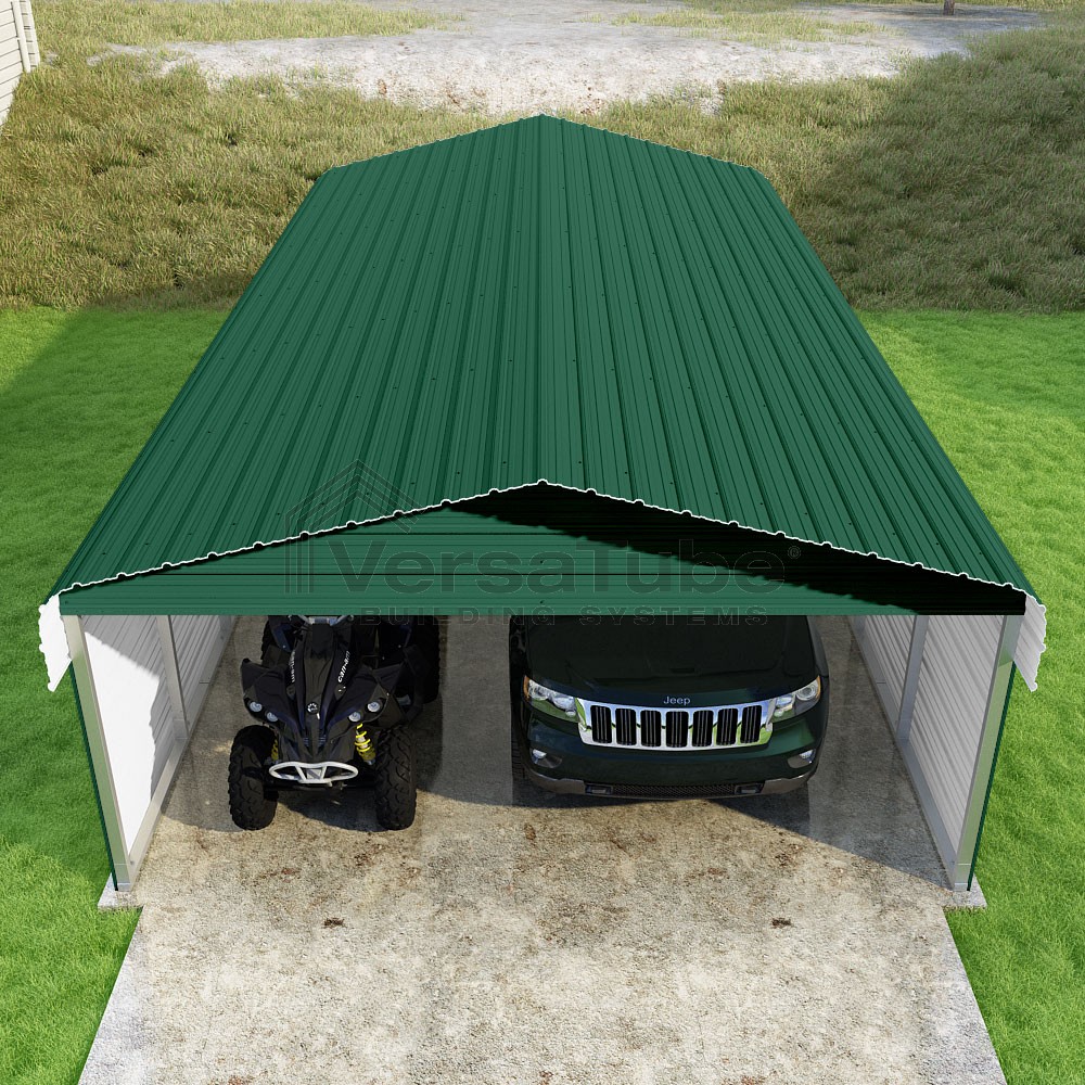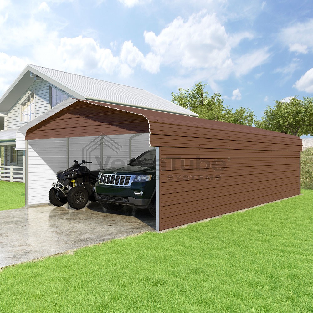 Classic Series DIY carport kit features horizontal application of sheet metal panels with the extra protection of rounded eaves.