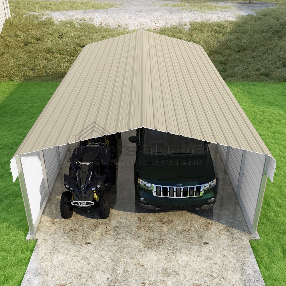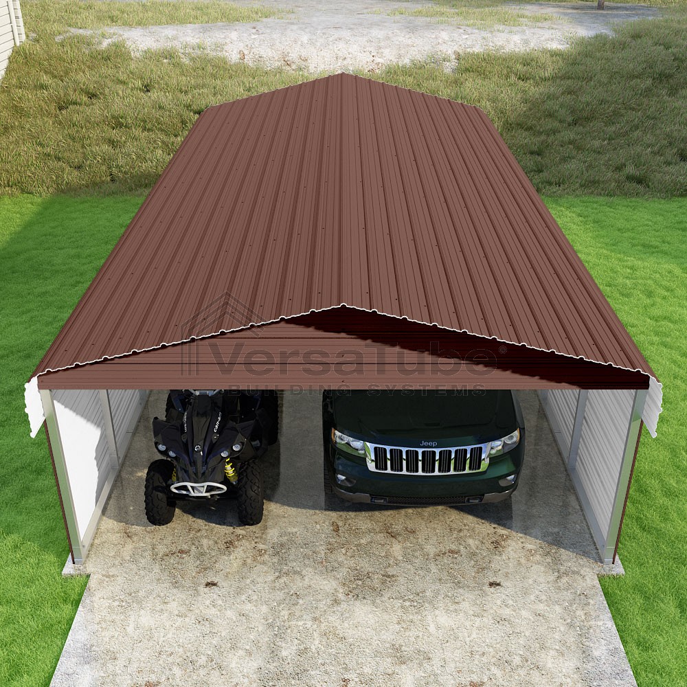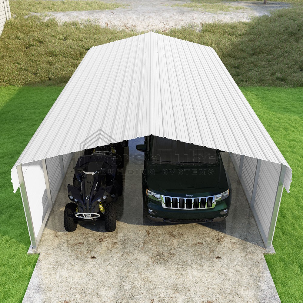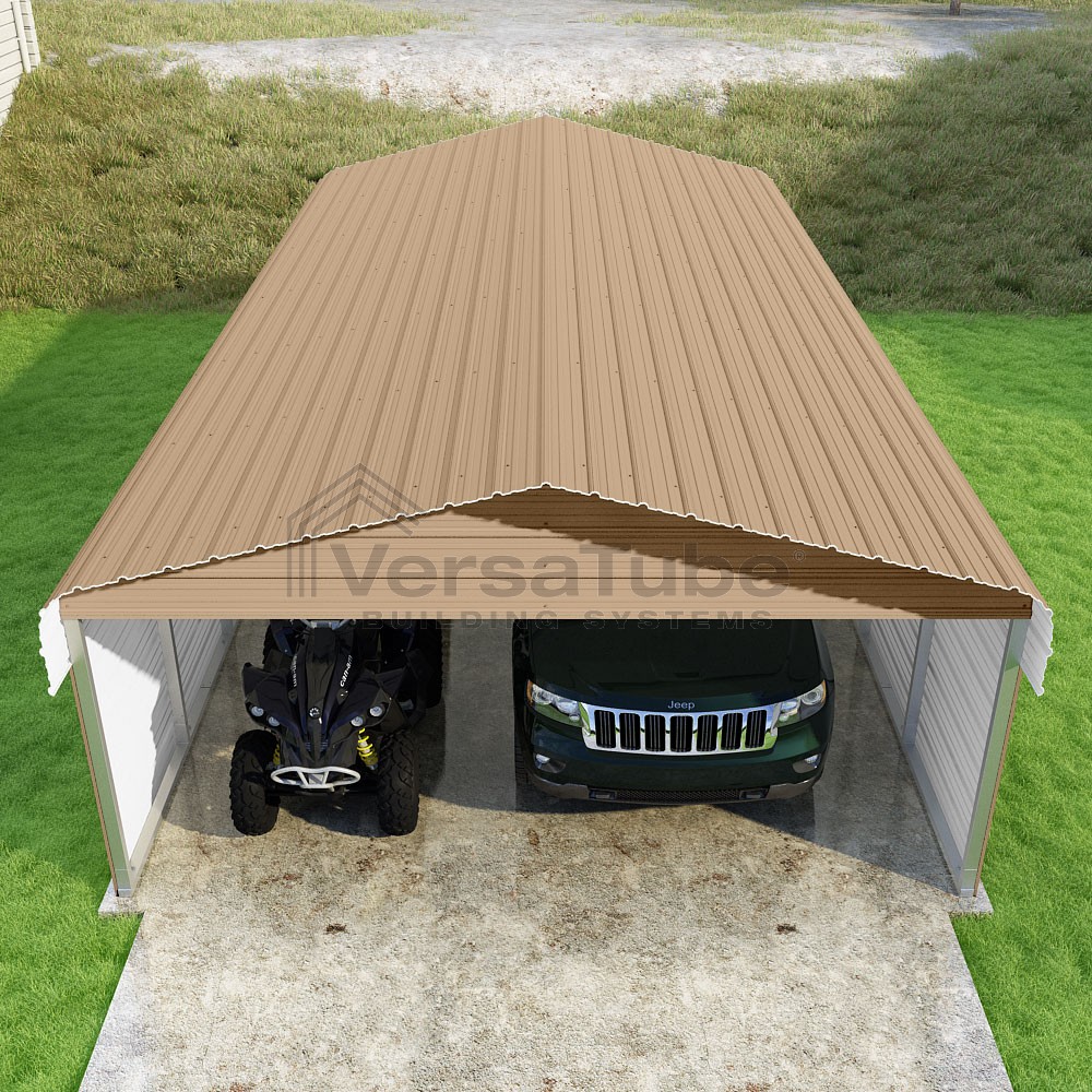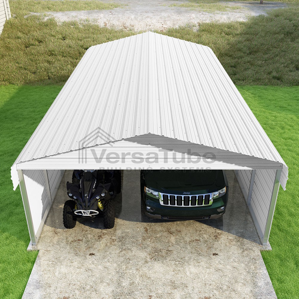 Classic Series DIY carport kit features horizontal application of sheet metal panels with the extra protection of rounded eaves.