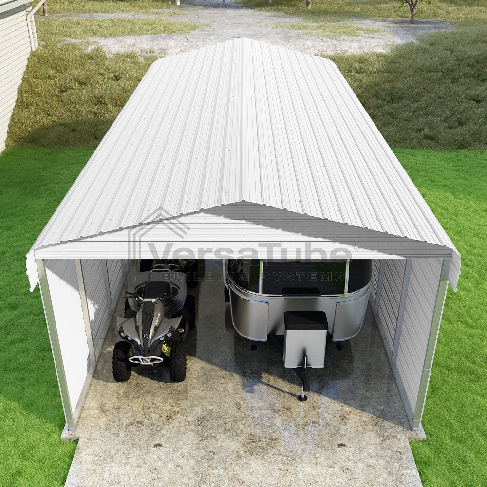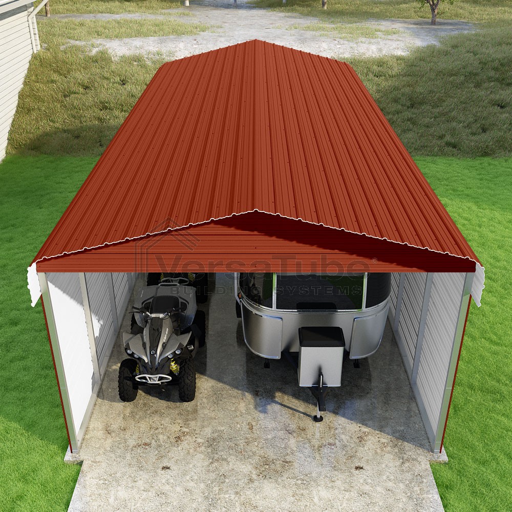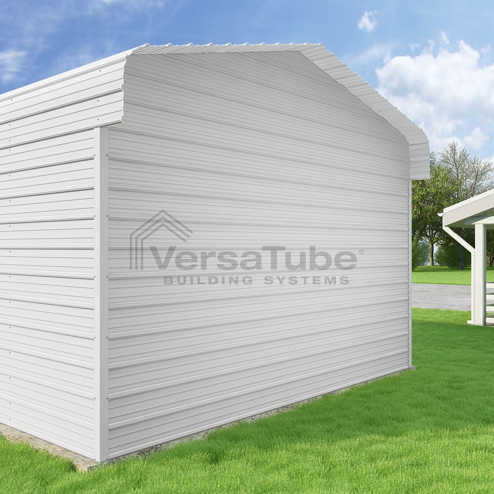 Classic Series DIY carport kit features horizontal application of sheet metal panels with the extra protection of rounded eaves.