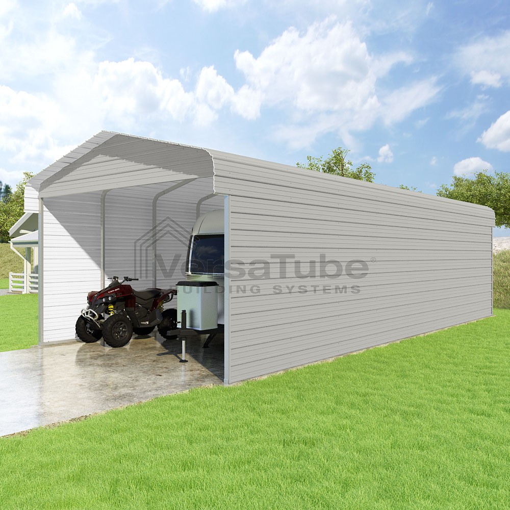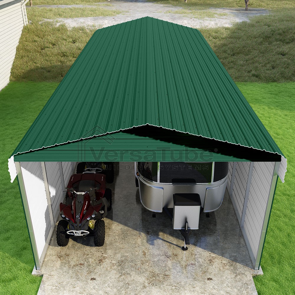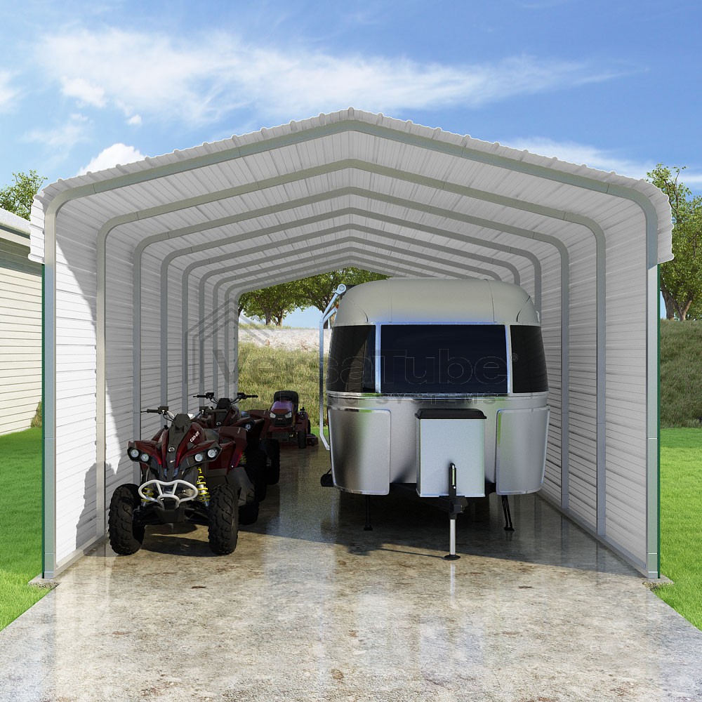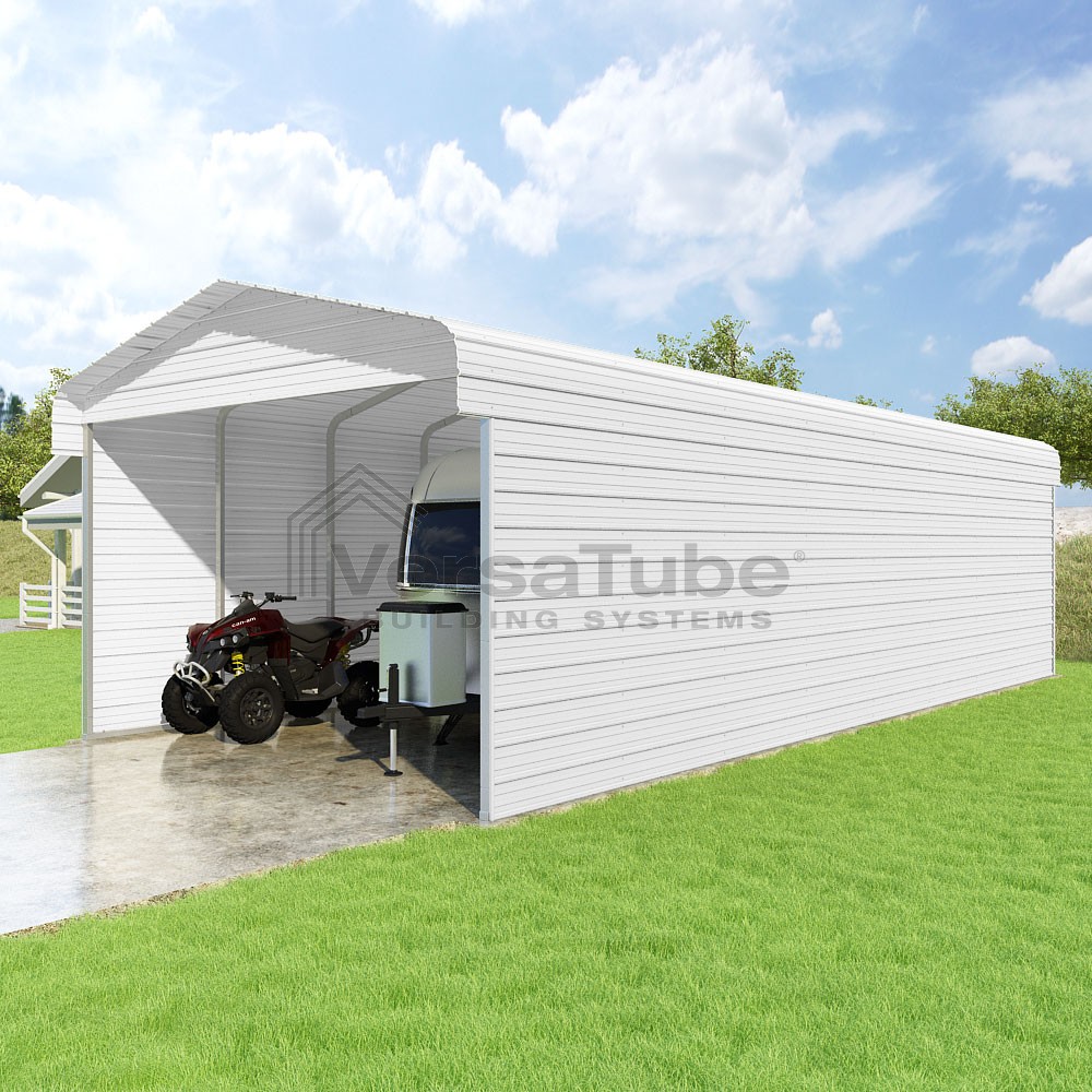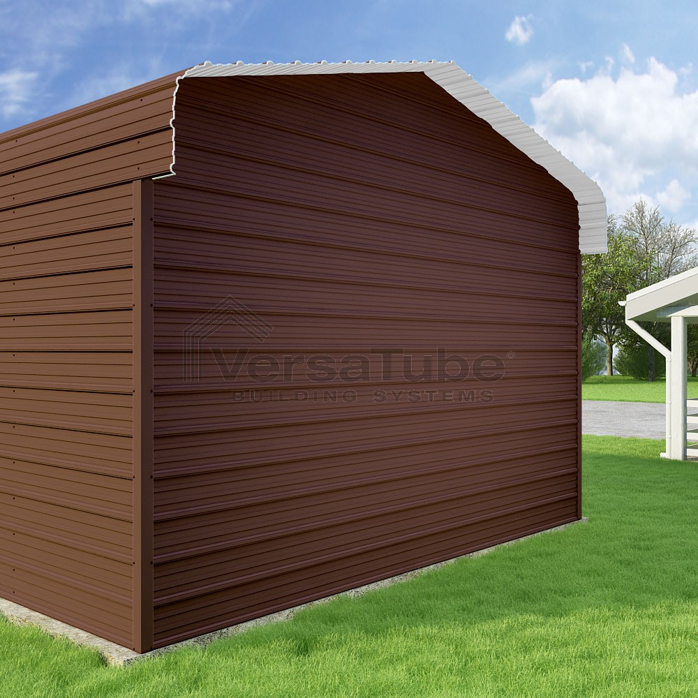Classic Series DIY carport kit features horizontal application of sheet metal panels with the extra protection of rounded eaves.