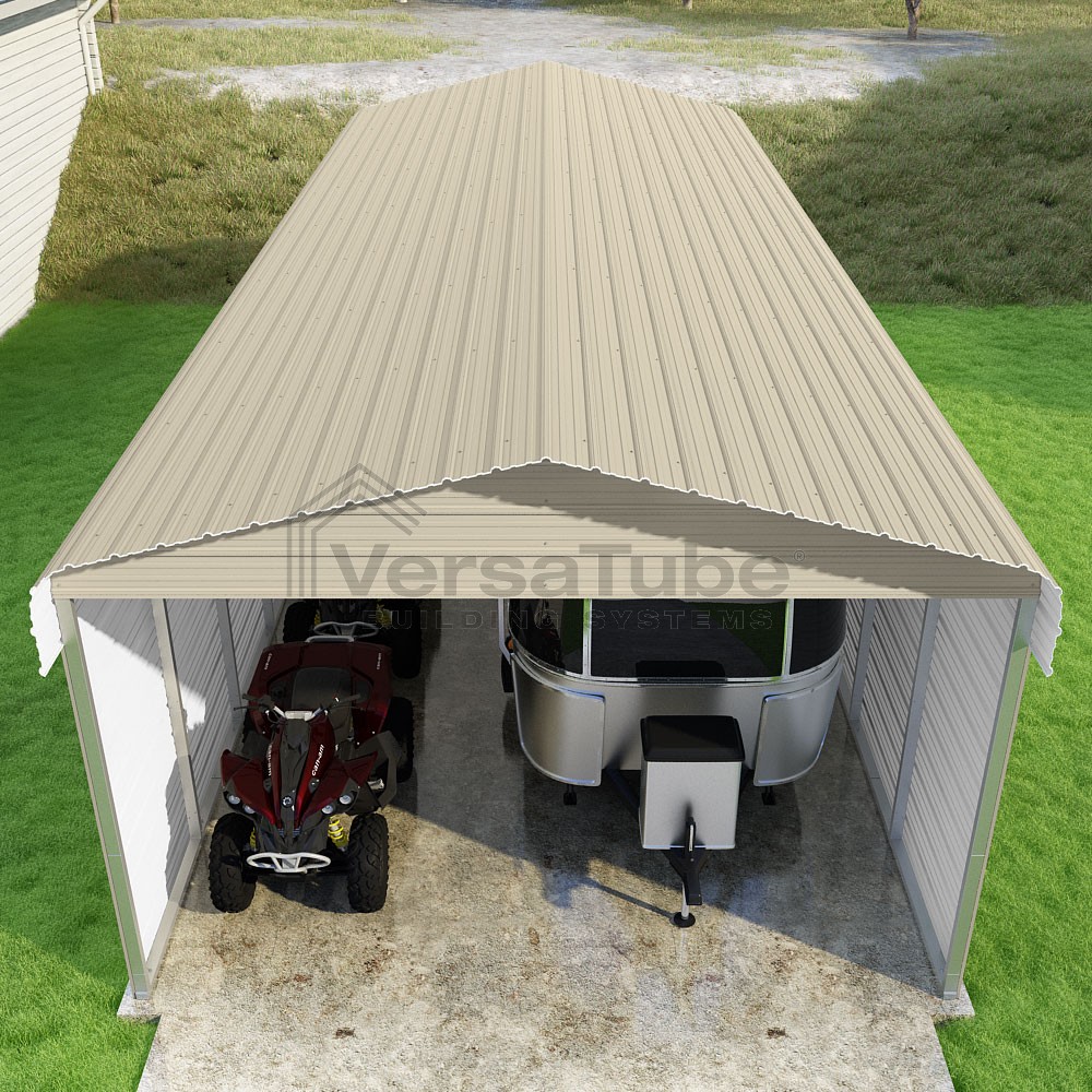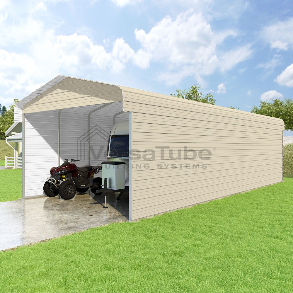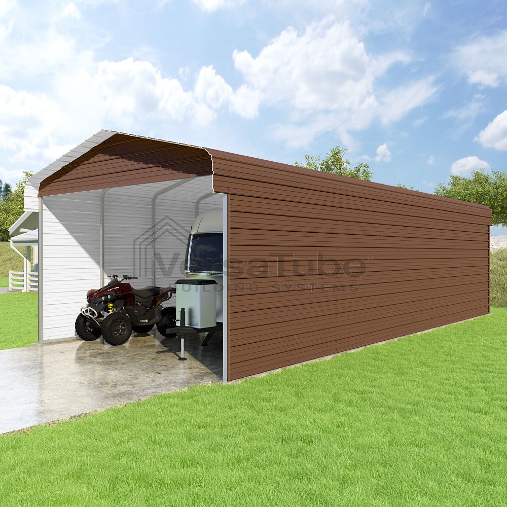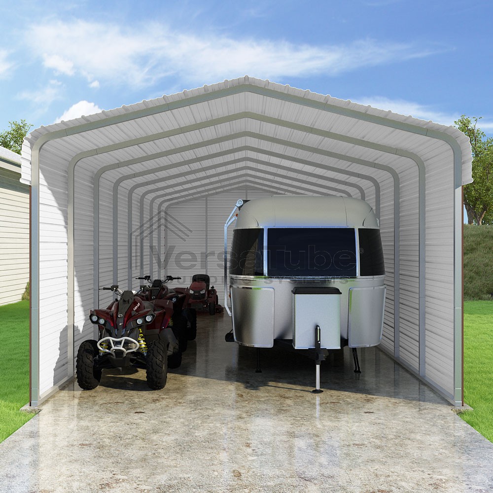 Classic Series DIY carport kit features horizontal application of sheet metal panels with the extra protection of rounded eaves.