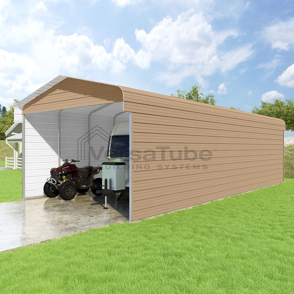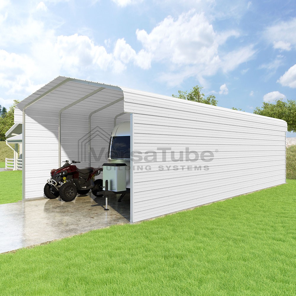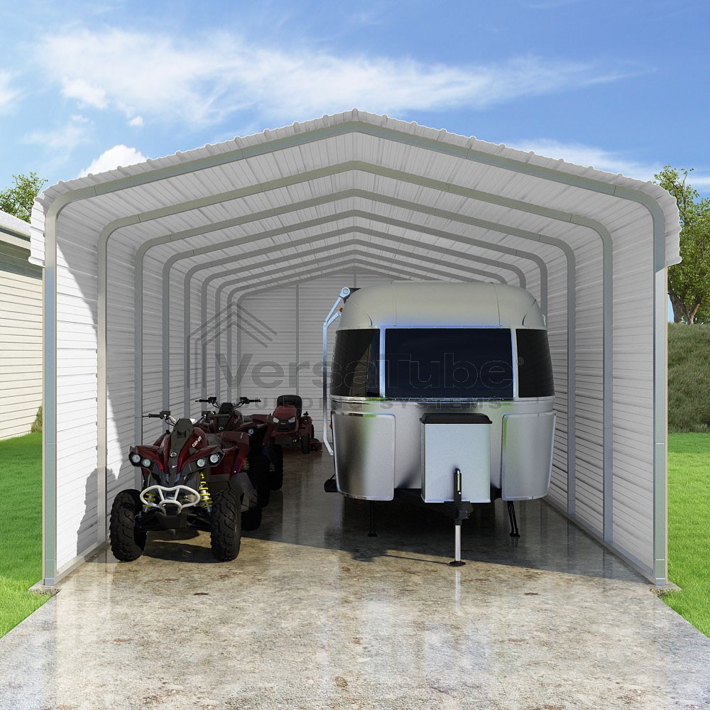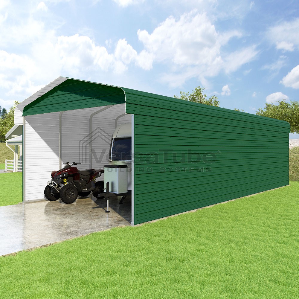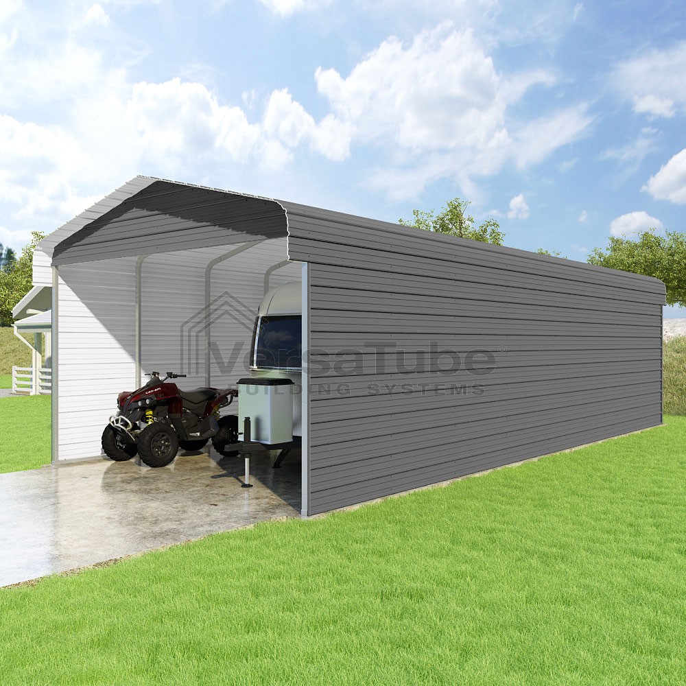 Classic Series DIY carport kit features horizontal application of sheet metal panels with the extra protection of rounded eaves.
